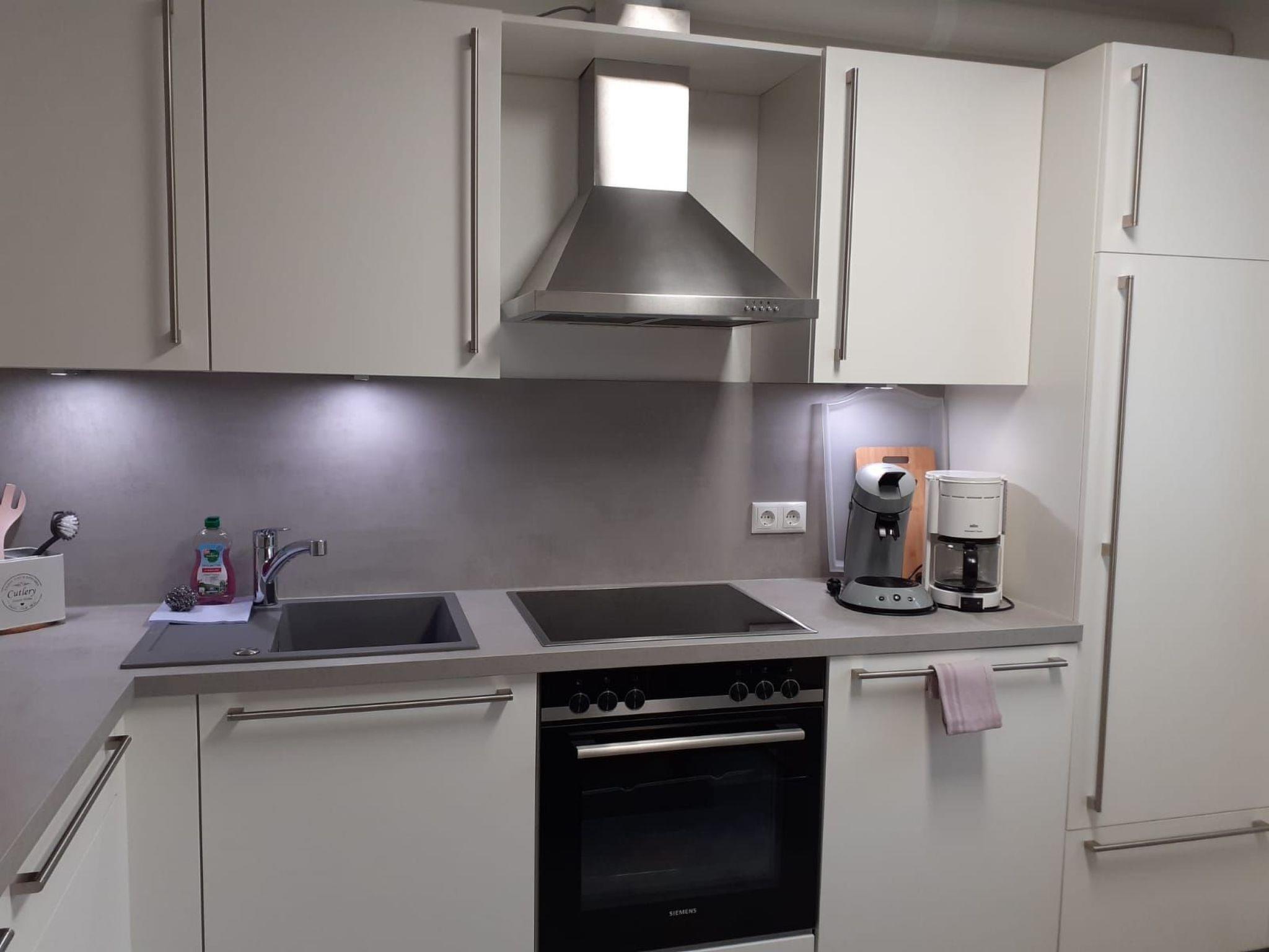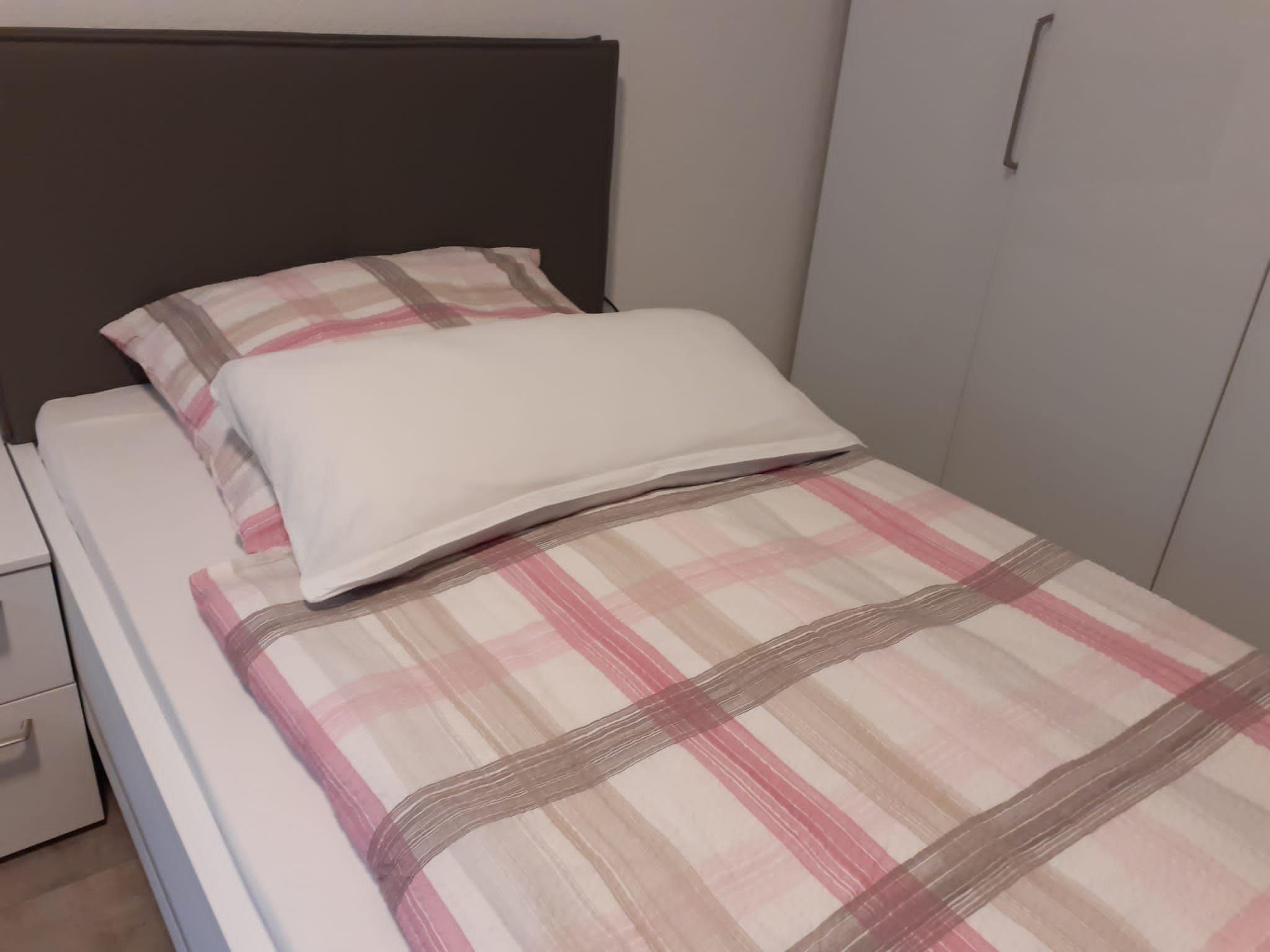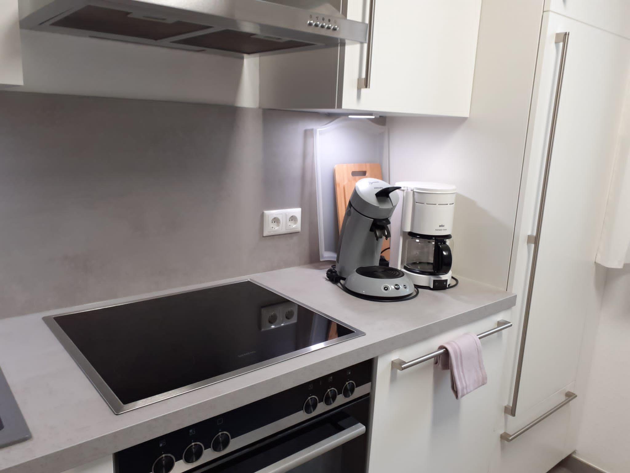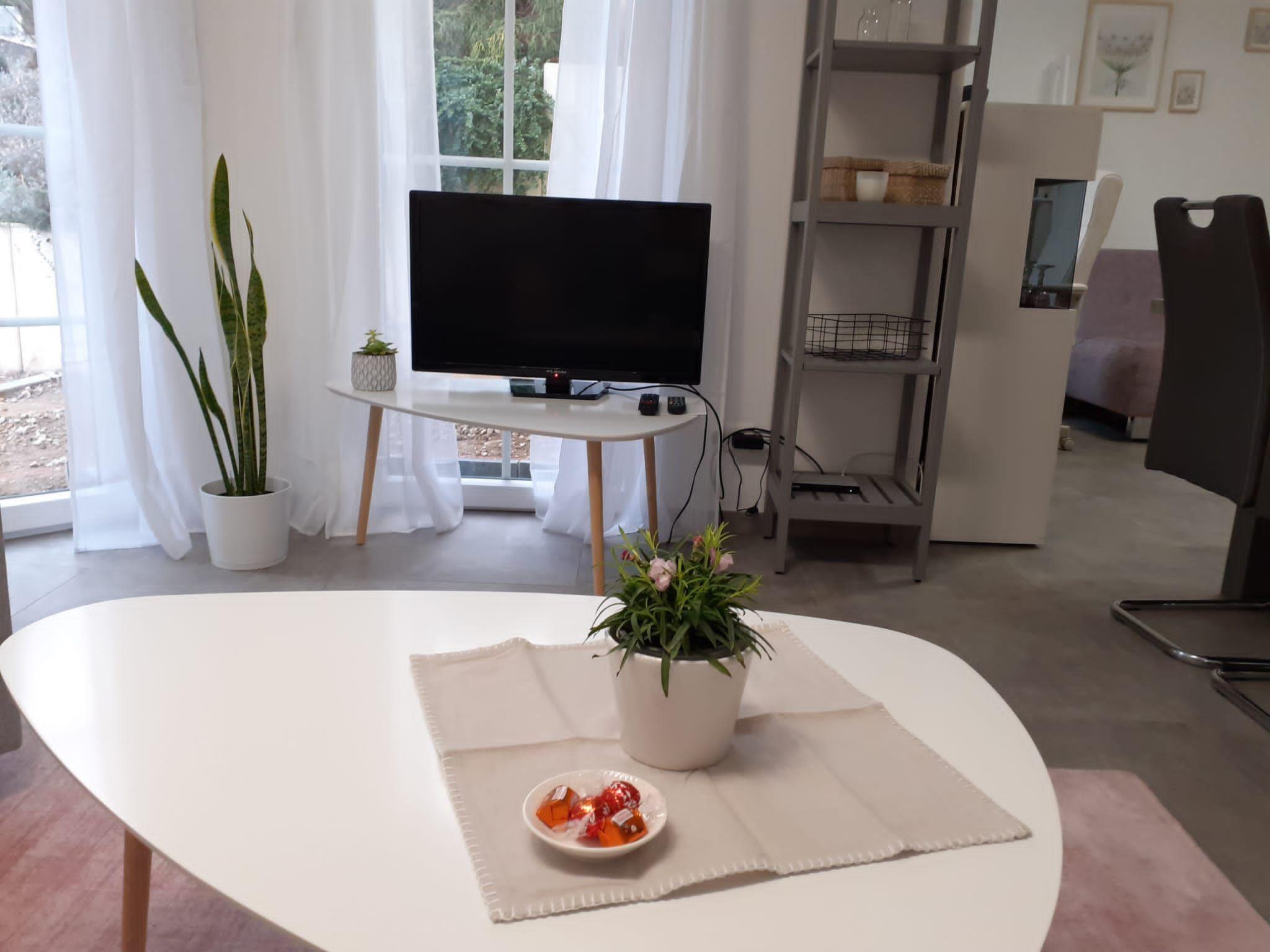 The beautiful and cosy basement flat is located in a quiet side street (play street) in the Obergartzem district. The holiday flat was completely renovated and refurbished in spring 2023. The house itself was completed in 2000. In addition to the hallway, shower room and kitchen, the flat has a bedroom with two single beds and a sofa bed in the living room (sleeping area 1.4 x 2 m). The living room has a bay window with 5 floor-to-ceiling windows facing the large outdoor terrace. The terrace itself is sheltered and offers enough space to spend time outdoors. There is a barbecue, a lounge set, two sun loungers and a parasol on the terrace.