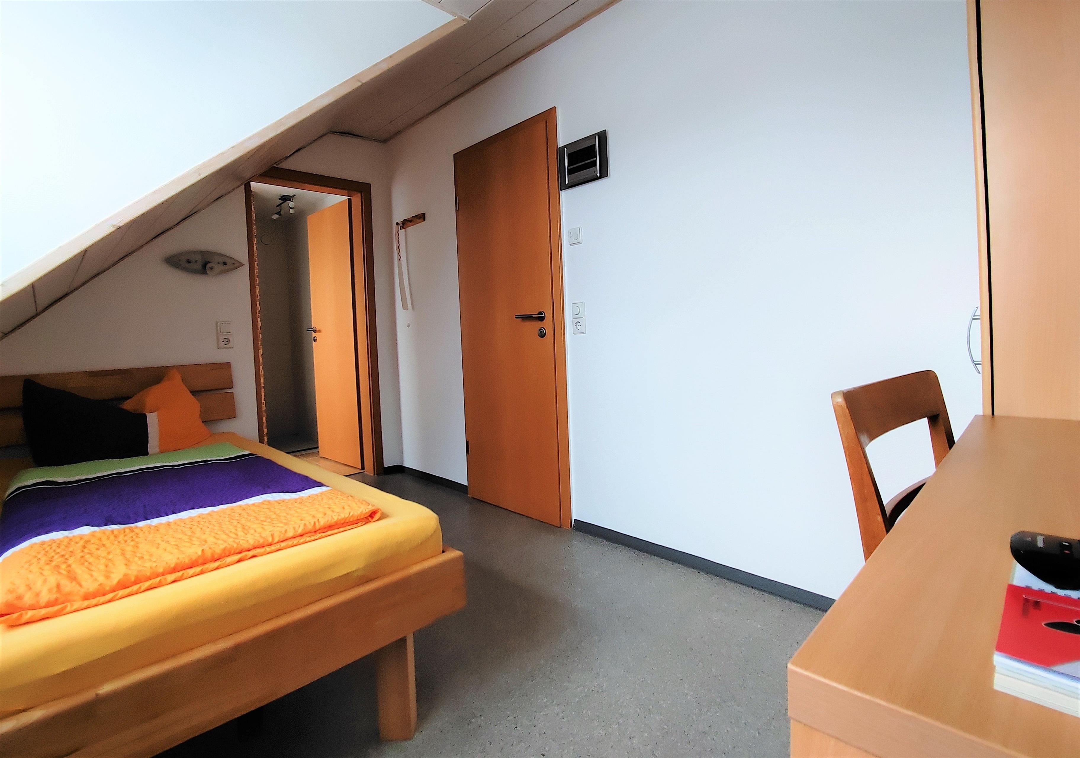 Das Einzelzimmer ist ausgestattet mit Einzelbett, Schreibtisch, DU / WC und WLAN.