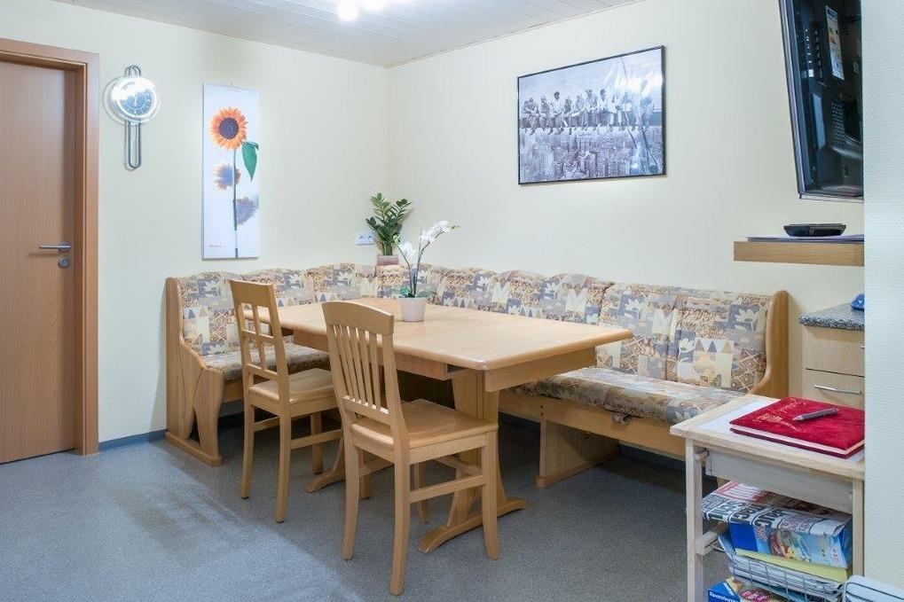 Die Gemeinschaftsküche ist voll ausgestattet mit allem, was Sie für eine Zubereitung Ihres Frühstücks oder Abendessens benötigen. Ebenfalls in der Gemeinschaftsküche ein großer Esstisch und zusätzlicher TV.