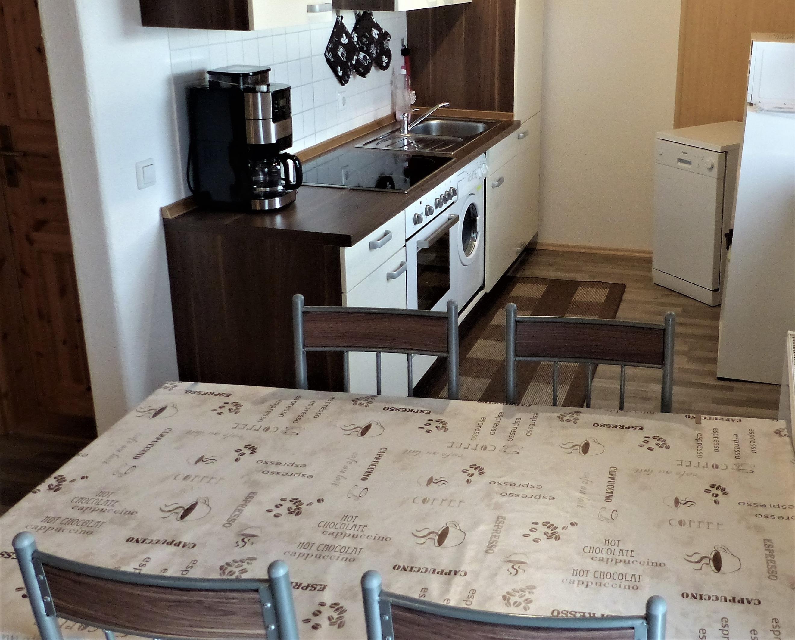 Die Ferienwohnung 3, mit Balkon, befindet sich im Dachgeschoss des Hauses und verfügt über zwei separate Schlafzimmer mit je zwei Einzelbetten, die teilweise zum Doppelbett gestellt werden können. Im Badezimmer befinden sich Badewanne und WC. Der große Wohnraum mit Essecke und voll ausgestatteter Küchenzeile lädt zum Verweilen ein.