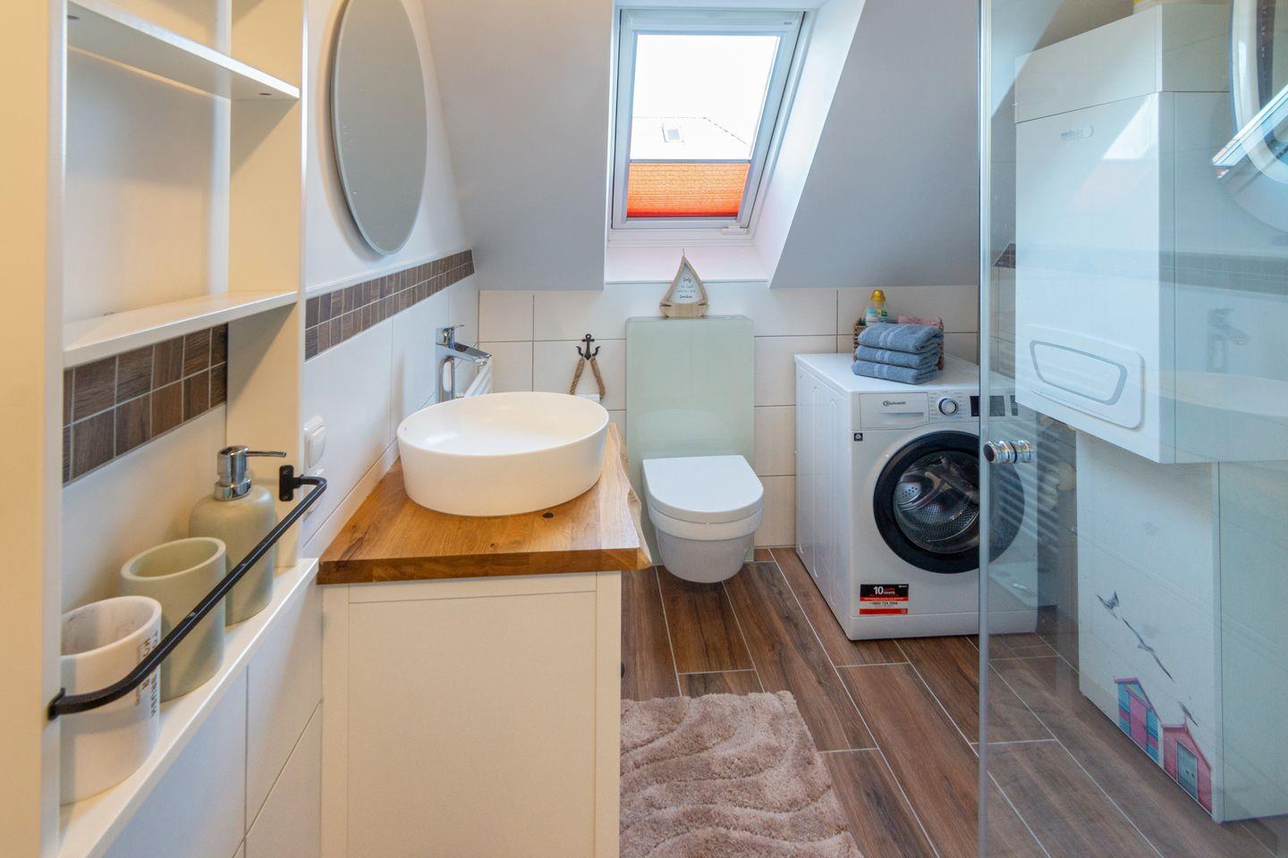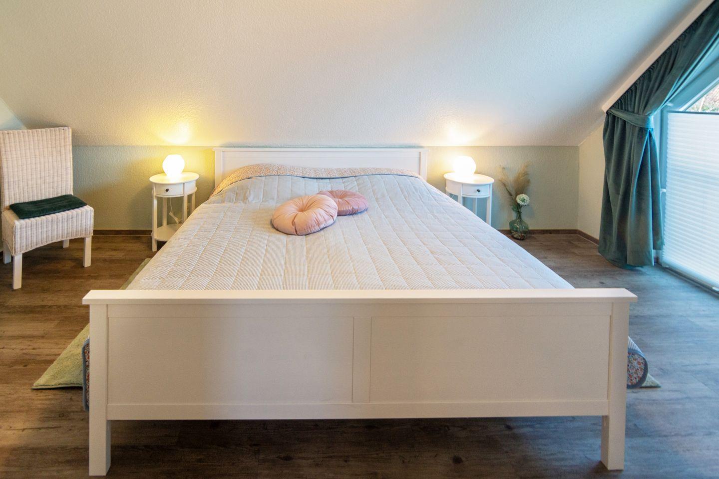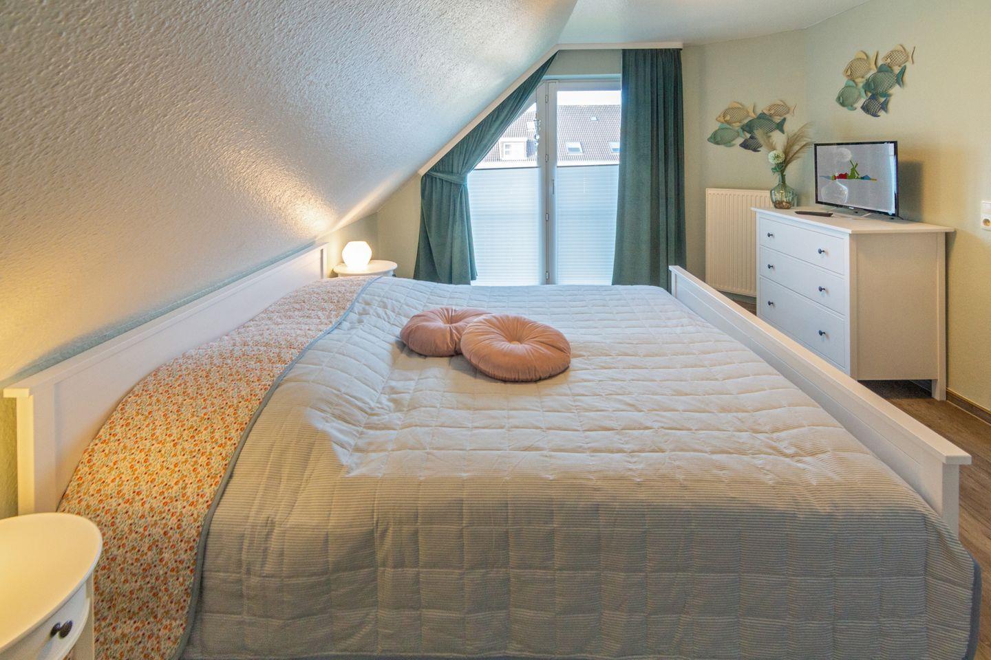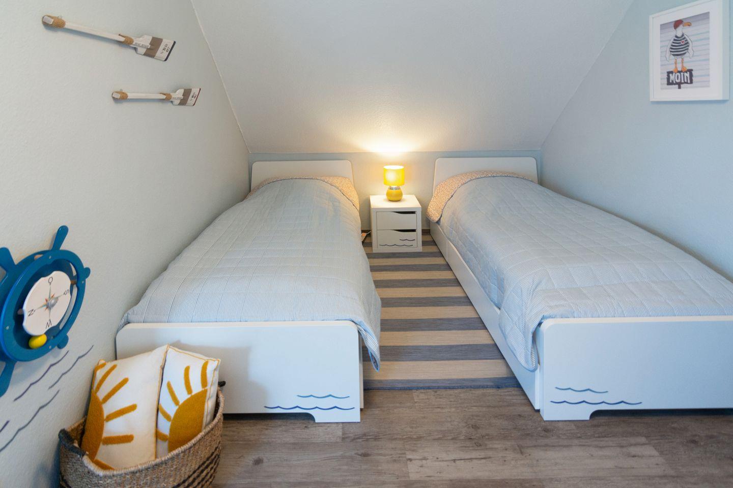 Im Obergeschoss befinden sich zwei Schlafzimmer, jeweils mit eigenem Fernseher, sowie ein modernes Duschbad mit bodengleicher Dusche und WC.