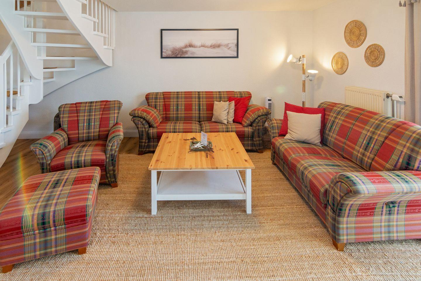 Im Erdgeschoss befinden sich der offen gestaltete Wohn- und Essbereich mit behaglicher Sofaecke, Satelliten-TV und WLAN sowie die vollständig ausgestattete offene Küche. Ein separates Gäste-WC ist ebenfalls vorhanden. Pflegeleichter Vinylboden, Spiele und Bücher sorgen für Gemütlichkeit zu jeder Jahreszeit, die Zentralheizung für angenehme Wärme.