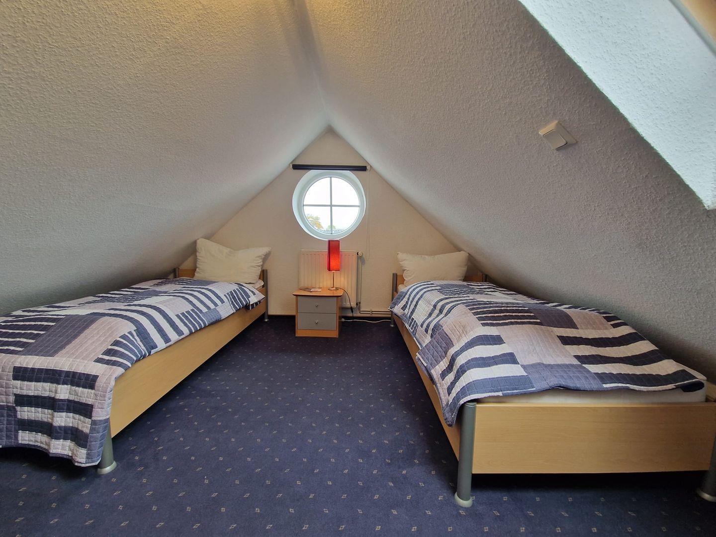 Im Obergeschoss befinden sich drei liebevoll eingerichtete Schlafzimmer, die Platz für bis zu sechs Personen bieten. Bequeme Betten, freundliche Farben und eine ruhige Atmosphäre sorgen für erholsamen Schlaf nach einem Tag an der frischen Nordseeluft.