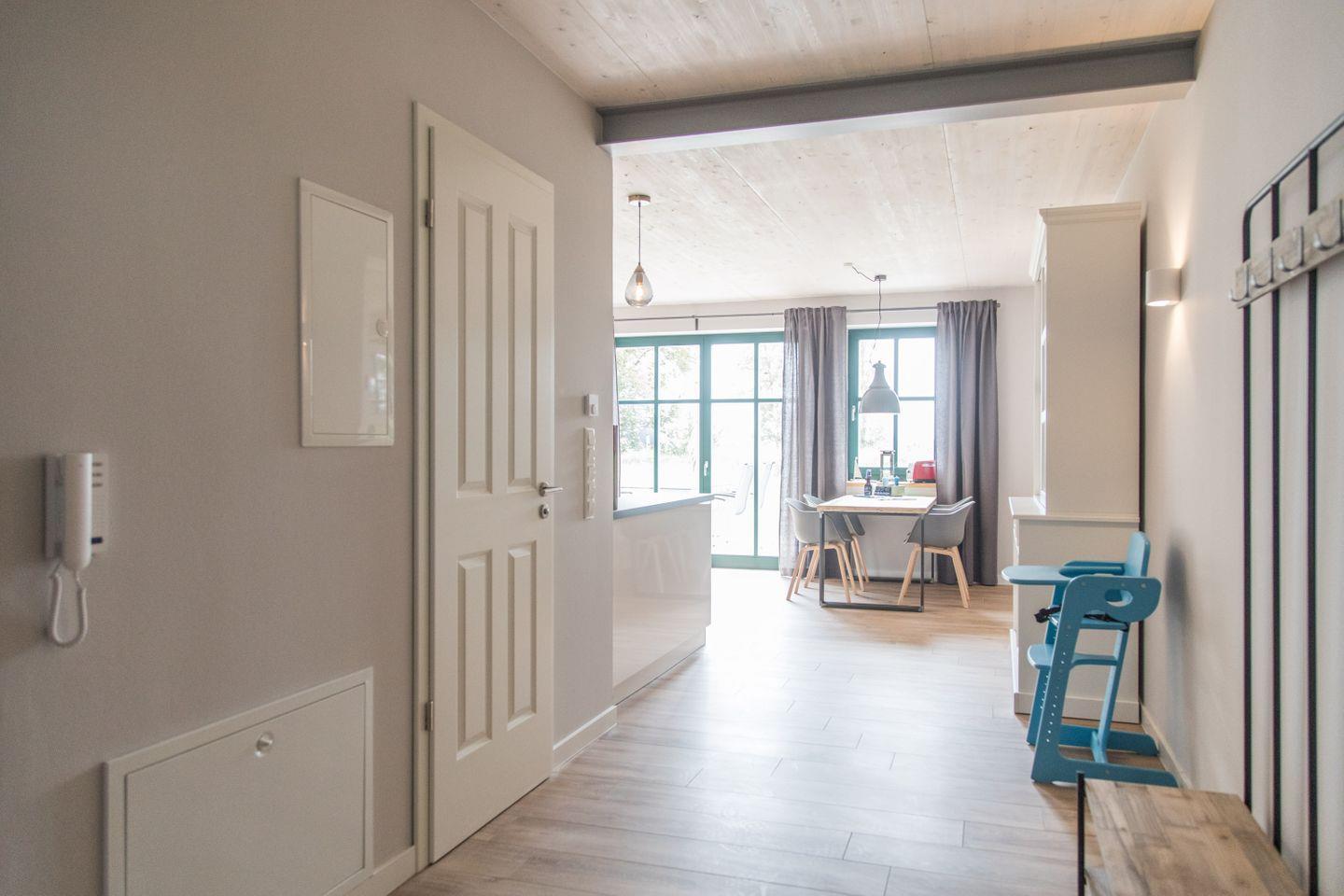 Dass die Wohnung, die sich über zwei Etagen erstreckt, heimeligen Charme ausstrahlt, verdankt sie der gekonnten Verbindung von Neu und Alt. Für eine freundliche Atmosphäre sorgen die großen Fenster und die stilvolle Einrichtung, deren Liebe zum Detail sich zum Beispiel an den individuellen Möbeln aus alten Baubohlen zeigt. Verwendet wurden in allen Räumen nur hochwertige Materialien wie Echtholzböden.