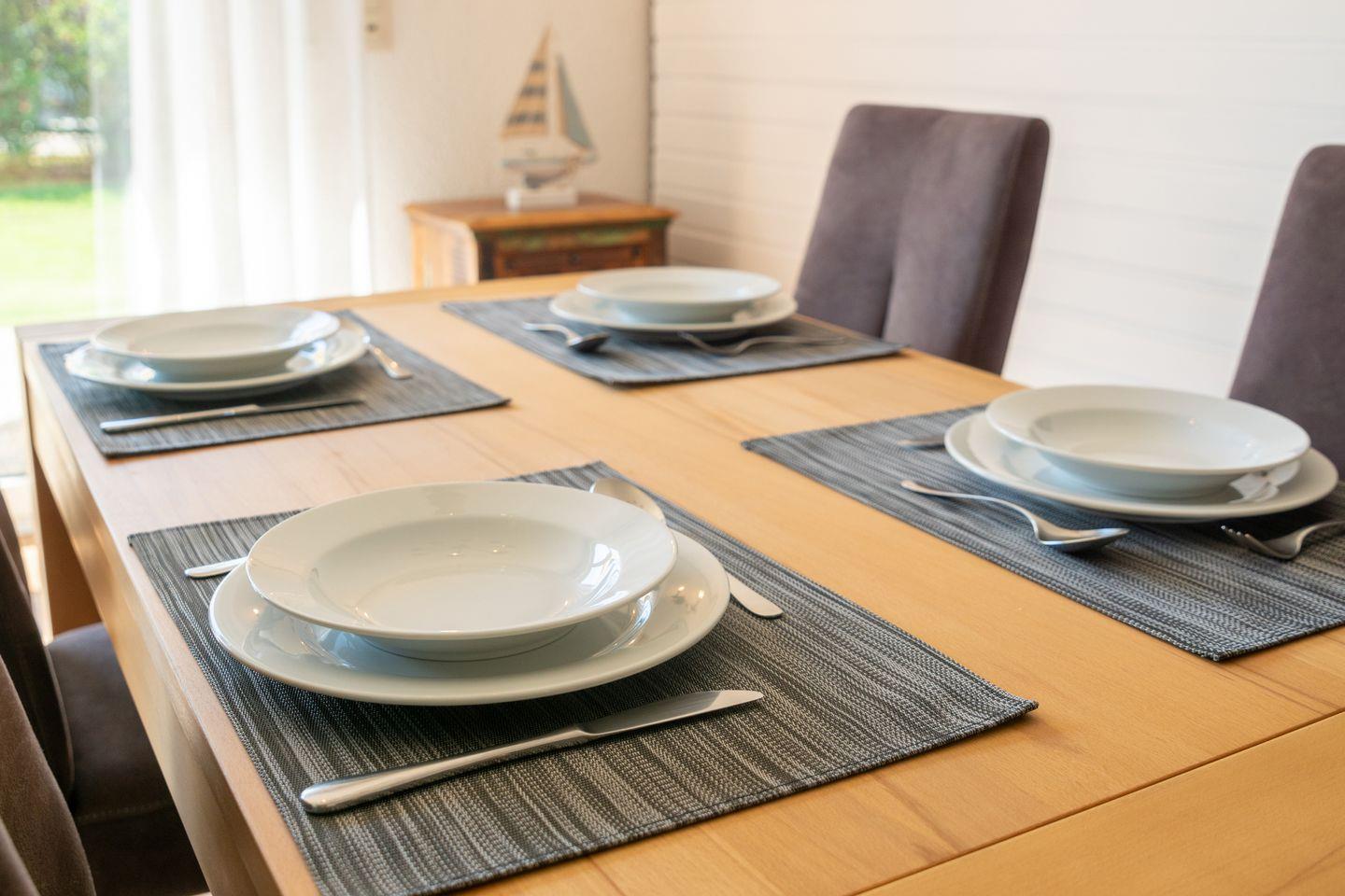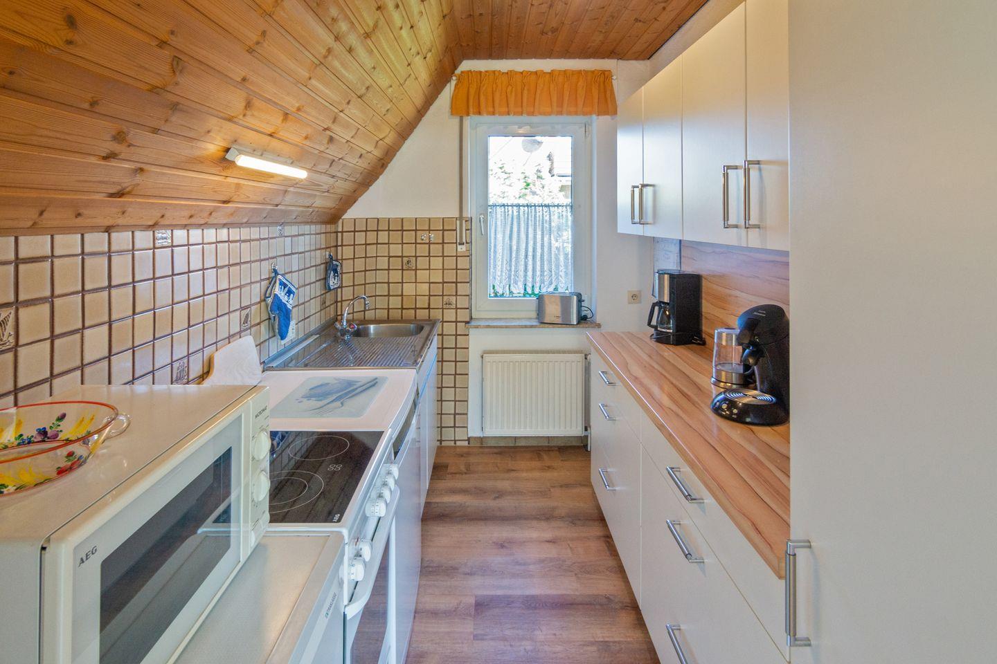 Die Küche ist voll ausgestattet mit Ceran-Herd, Backofen, Mikrowelle, Kühlschrank mit Gefrierfach, Spülmaschine, Toaster, Wasserkocher, Mixer, Eierkocher sowie Geschirr und Küchenutensilien. Für Kaffeeliebhaber stehen eine Kaffeemaschine und eine Senseo-Espressomaschine bereit. Der Essbereich mit Esstisch lädt zum gemeinsamen Essen ein.