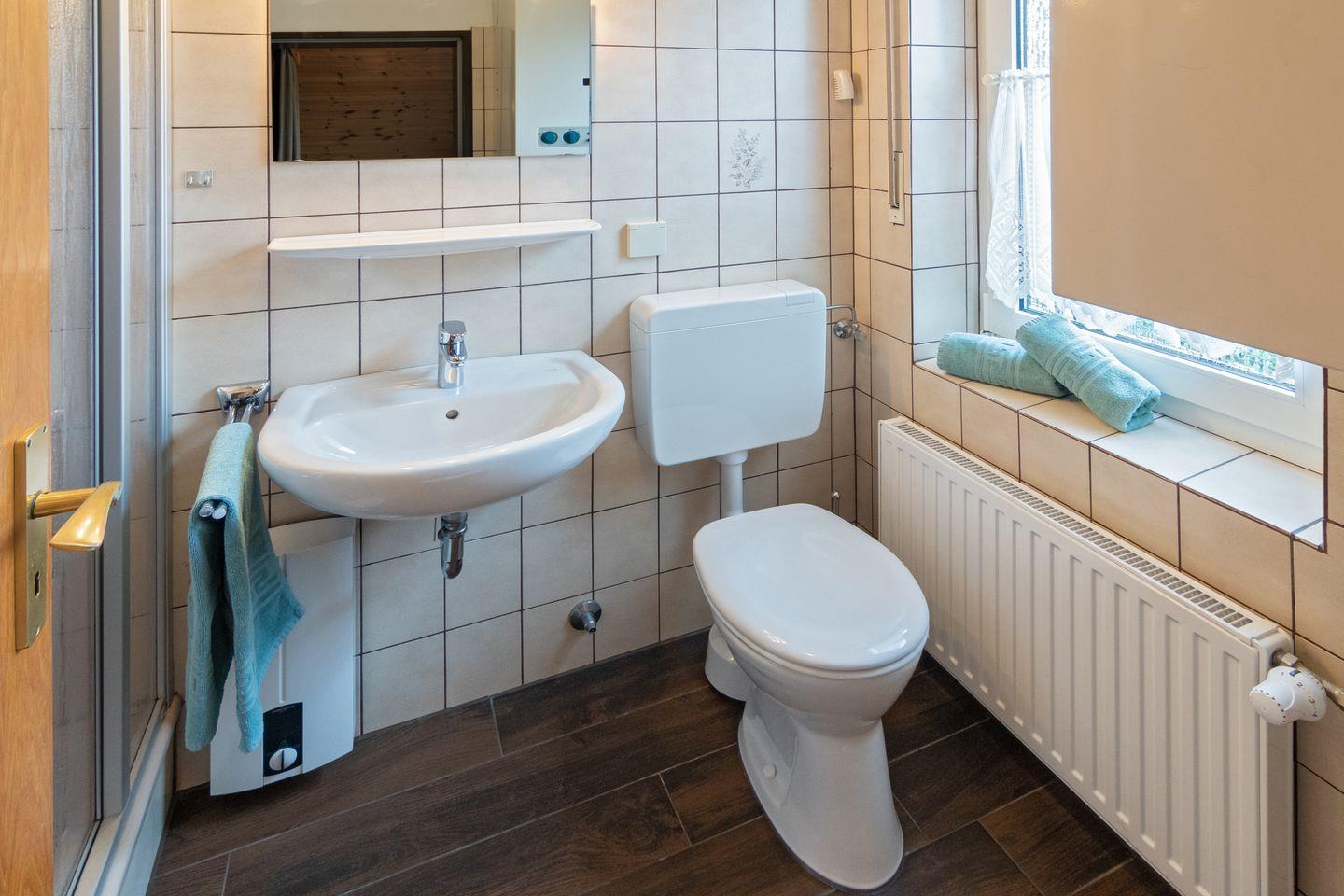Das Badezimmer bietet Dusche, WC, Waschbecken, Fenster und Haartrockner. Die Unterkunft wird über eine Gasheizung beheizt, die Schlafzimmer sind mit Teppichboden ausgestattet.