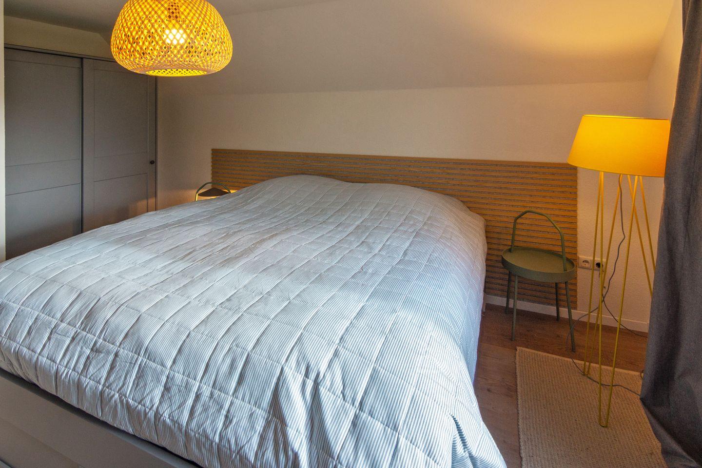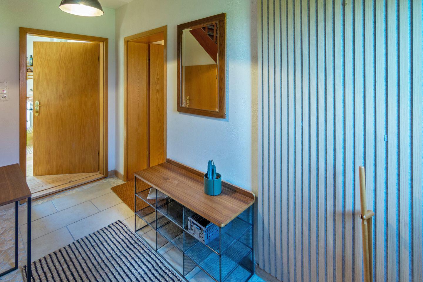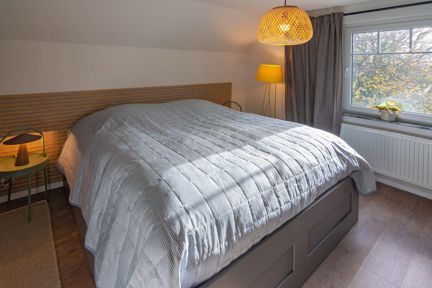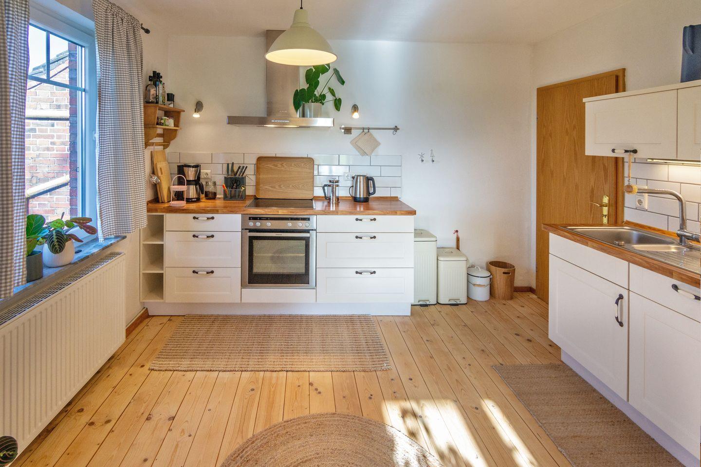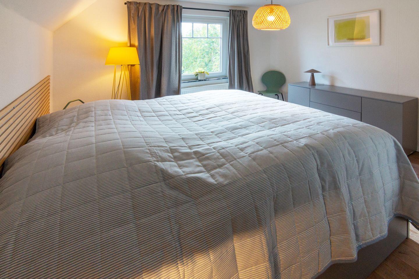 Die Wohnung verfügt über ein separates Schlafzimmer im Obergeschoss mit Laminatboden sowie einen großzügigen Wohnbereich mit Dielenboden, gemütlichem Sofa, 70-Zoll-TV und WLAN. Die offene, voll ausgestattete Küche (Ceranherd, Backofen, Spülmaschine, Kaffeemaschine, Mikrowelle u.?v.?m.) schließt direkt an. Ein separater Essbereich lädt zum Verweilen ein.