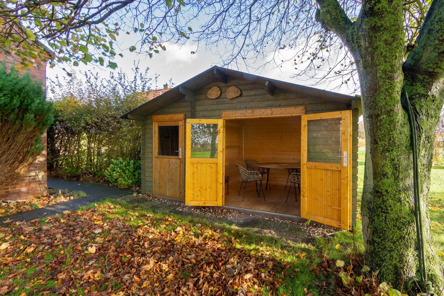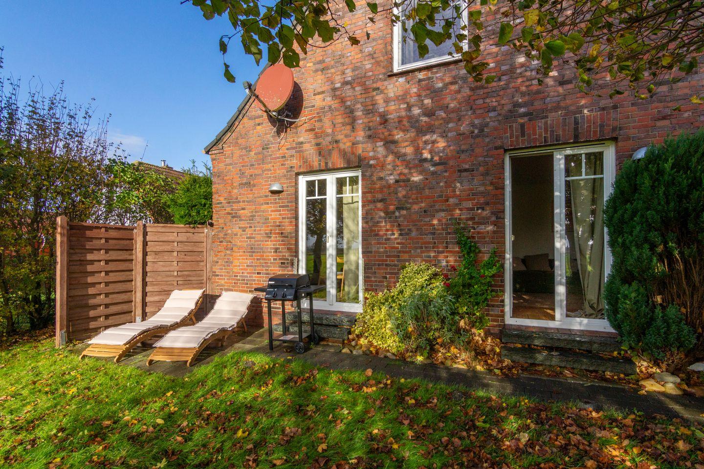 Die große möblierte Terrasse mit Sonnenliegen, Sonnenschirm und Gasgrill bietet einen herrlichen Blick auf Wiesen und Felder. Der gepflegte Garten lädt zum Entspannen ein. Ein Privatparkplatz befindet sich direkt am Haus.