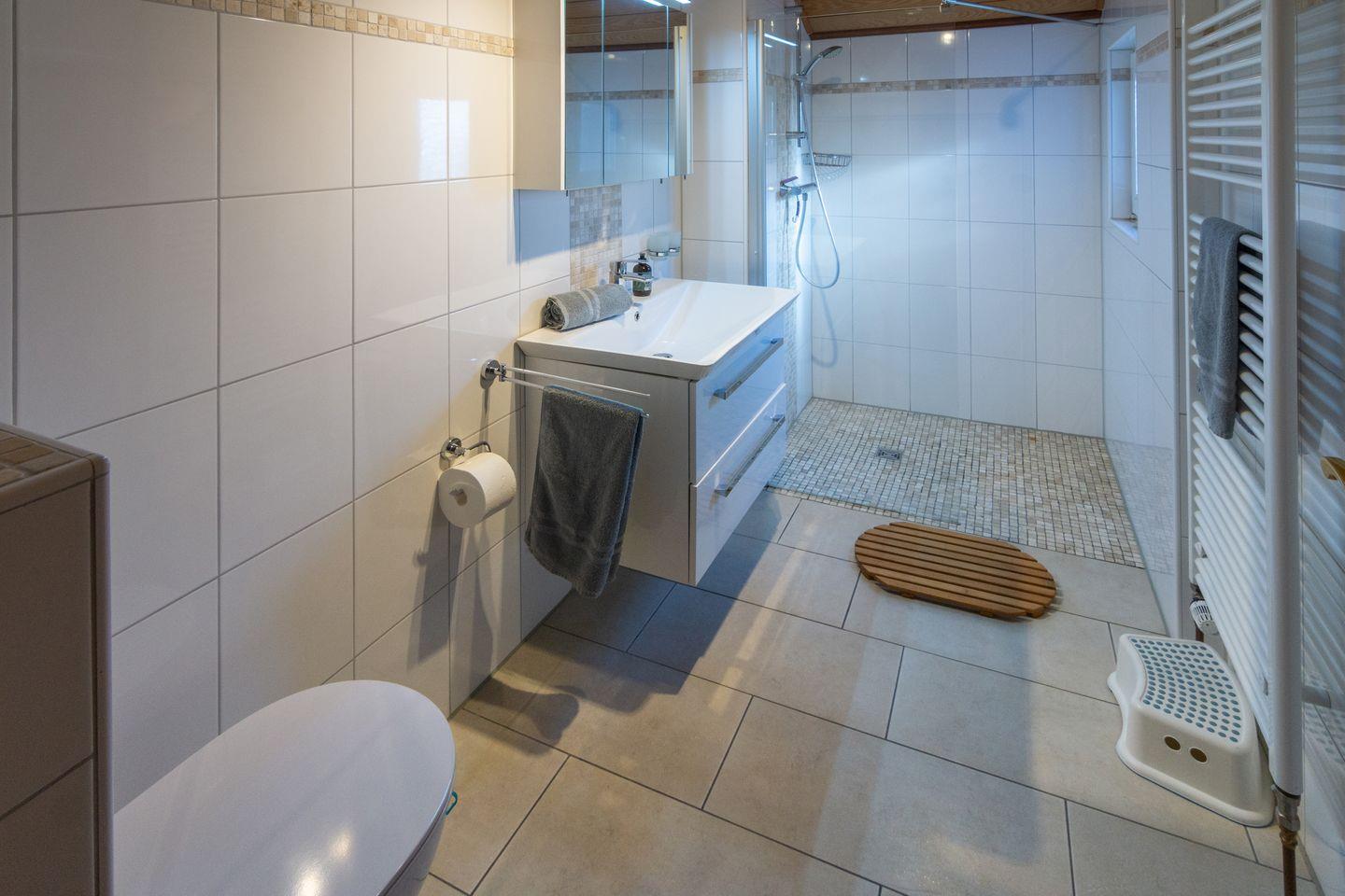 Zwei moderne Tageslichtbäder – eines davon im Obergeschoss – mit Dusche, WC, Waschbecken und Föhn bieten hohen Komfort, ideal für längere Aufenthalte oder Urlaub zu zweit. Für Familien stehen Babybett, Hochstuhl und Fliegengitter bereit.