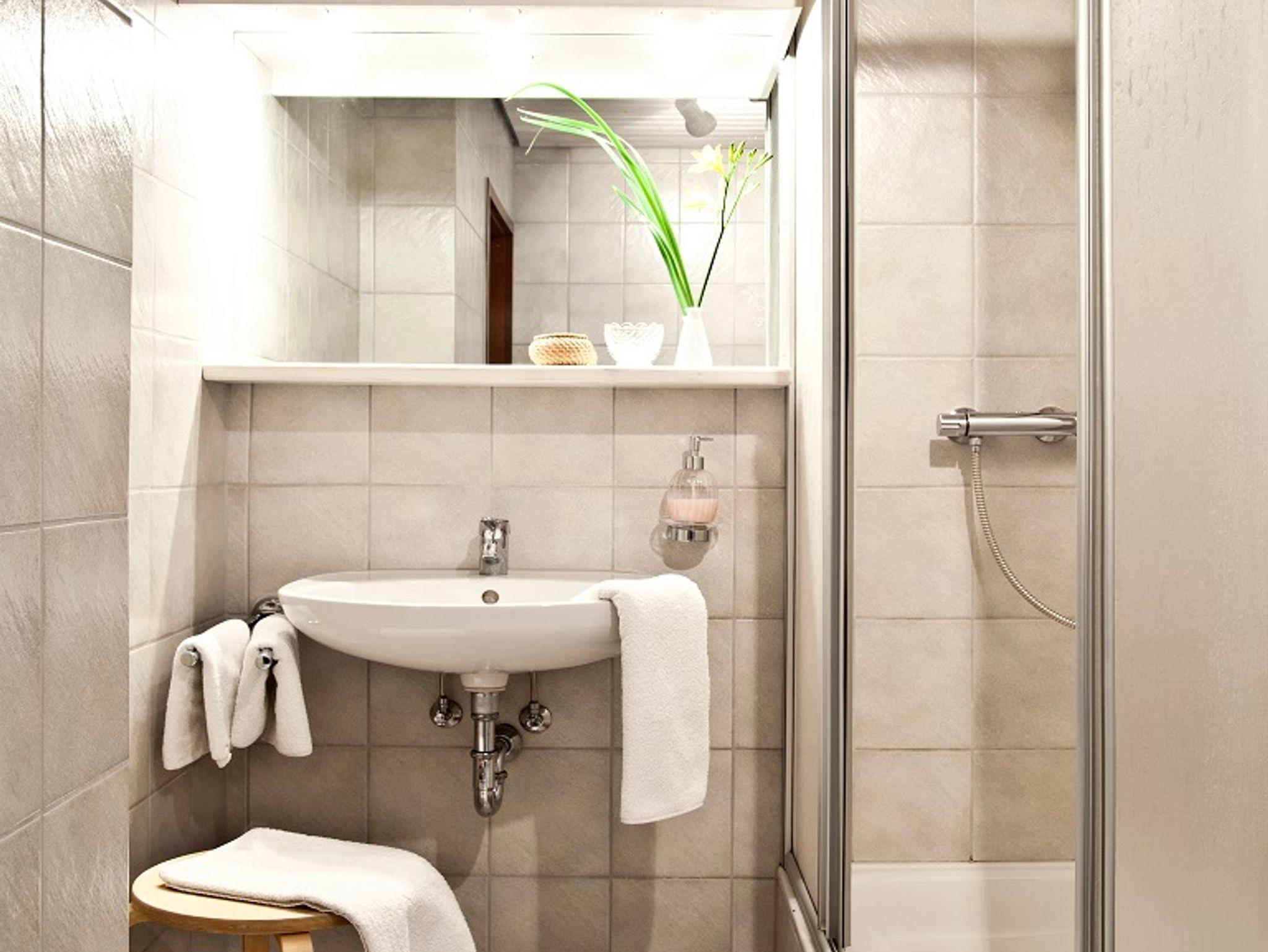 Das Badezimmer: Waschbecken, Spiegel, Dusche und natürlich frische Handtücher.