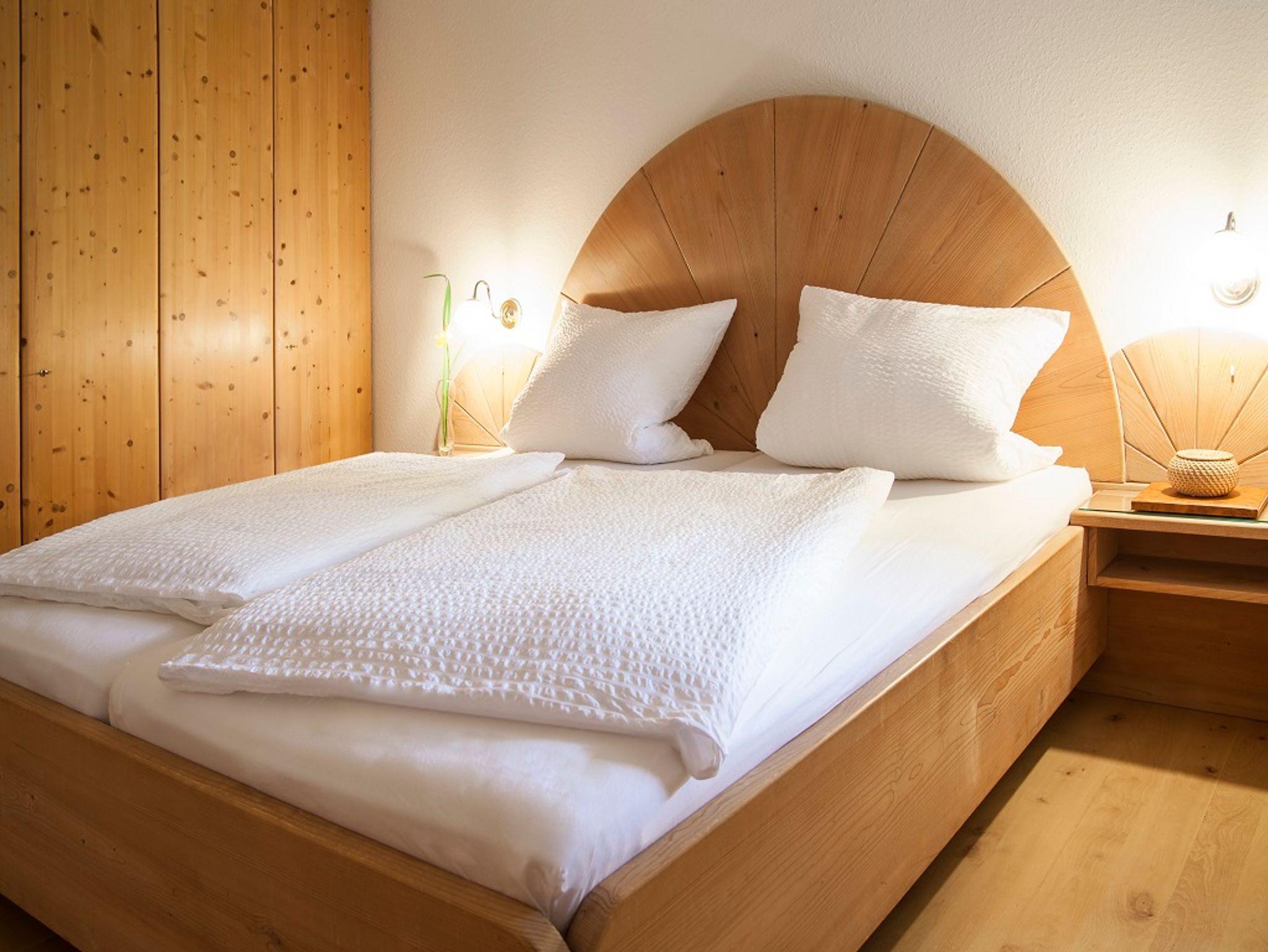 Schlafzimmer: Mit einem Doppelbett, zwei Nachtkästchen mit Leuchten und einem geräumigen Schrank mit Ganzkörperspiegel.