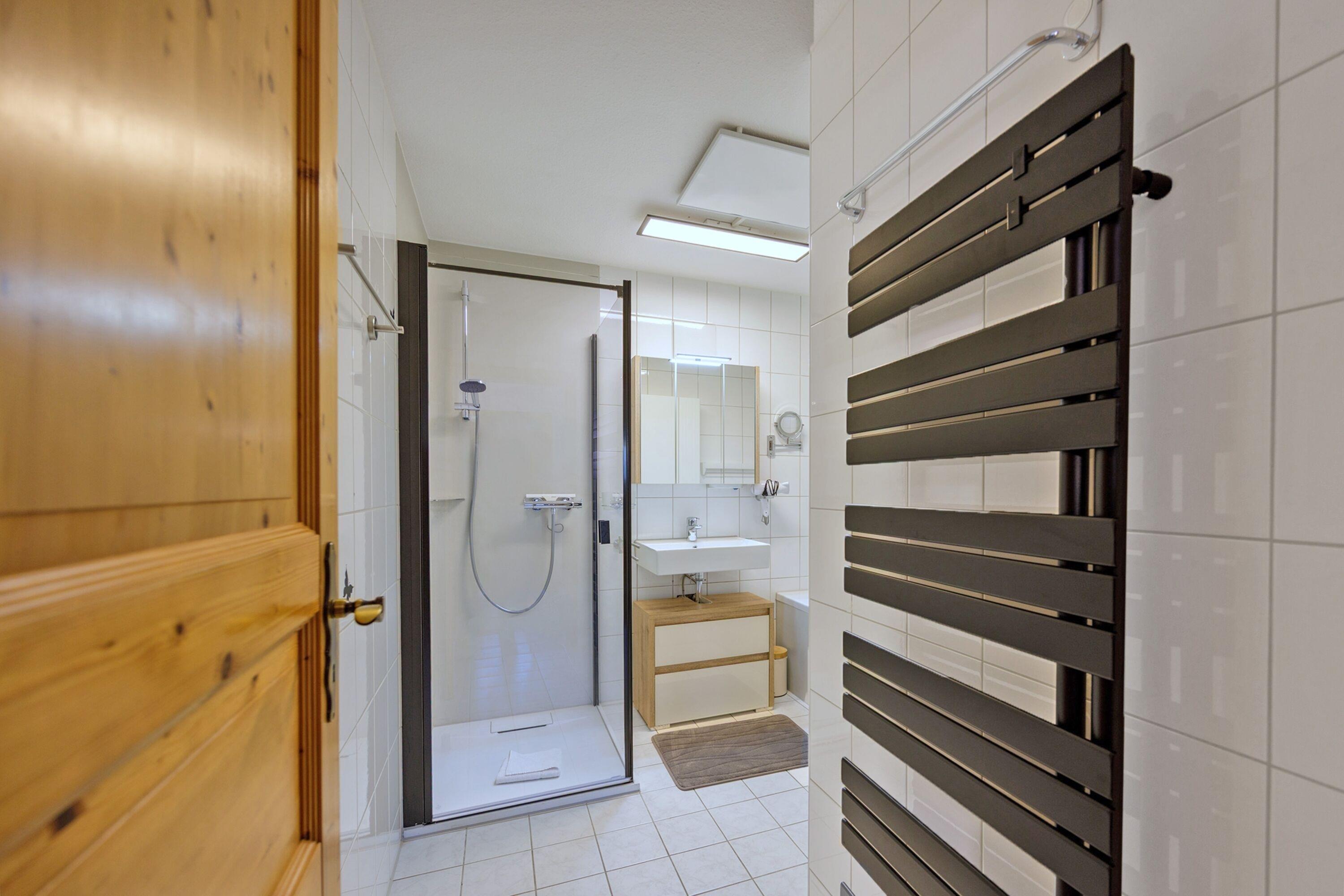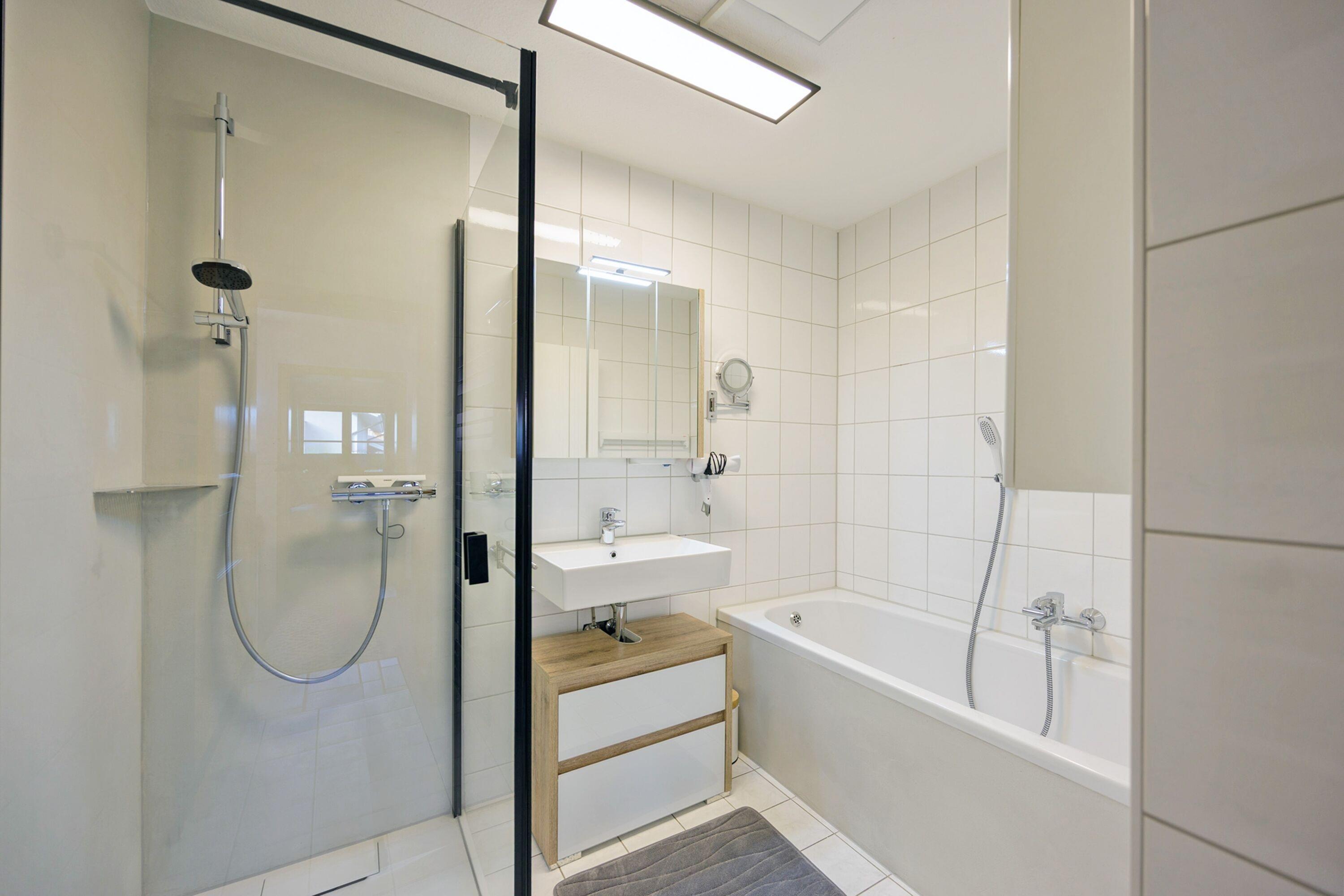 Badezimmer mit Badewanne und Dusche, helles Fliesendesign