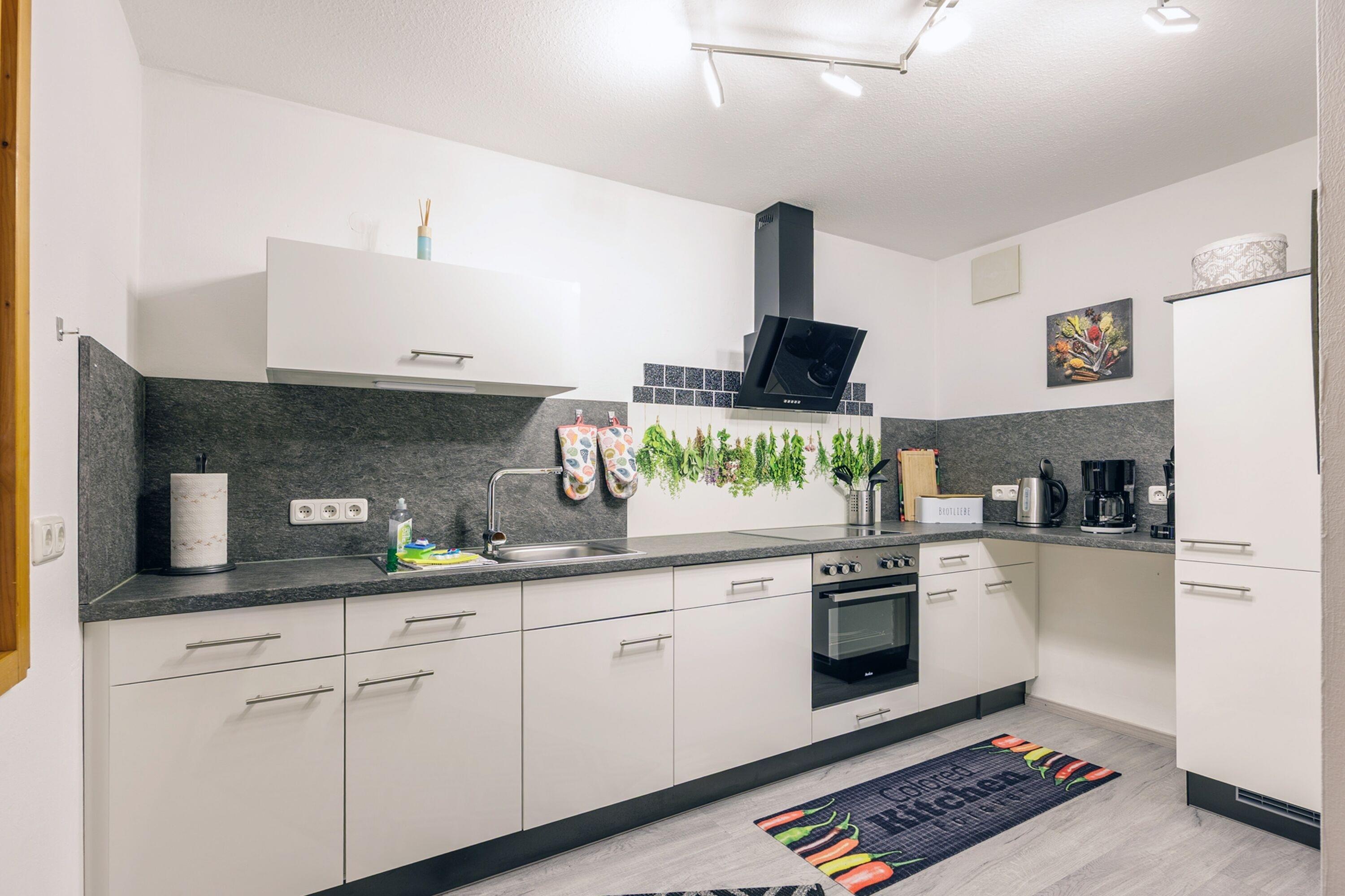 eine Küche mit voll ausgestatteter Einbauküche, Ceranfeld, Backofen, Geschirrspüler, Kühlschrank, Kaffeemaschine, Senseo, Toaster, Eier-/Wasserkocher und vieles mehr....