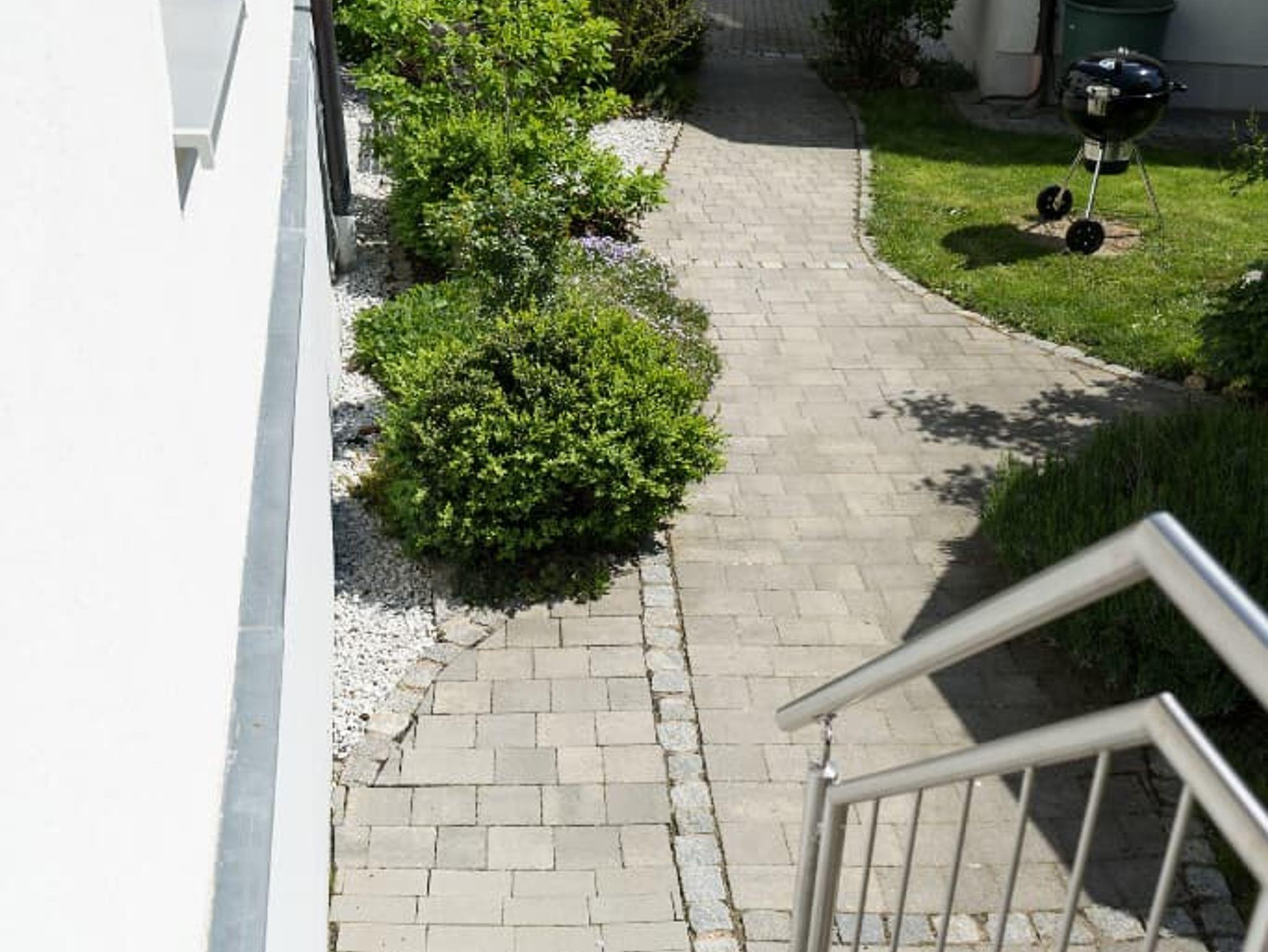 Der Eingang zur Ferienwohnung Zweisamkeit befindet sich in unserer schön gestalteten Gartenanlage. Es führen fünf Stufen in die Ferienwohnung.