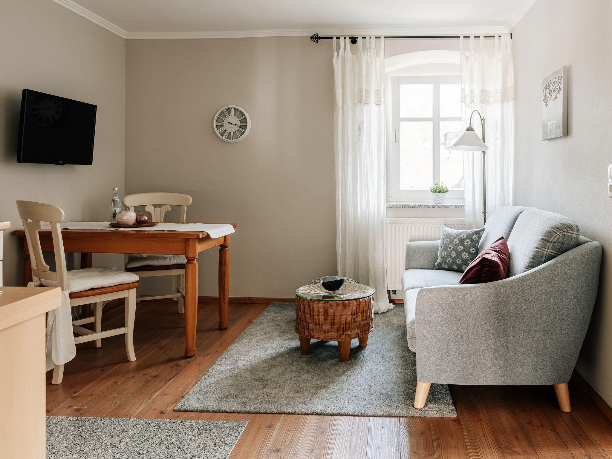 Lavendelwohnung - Vorraum mit Garderobe, Dusche, WC, Föhn, Kosmetikspiegel, Handtuchheizkörper, kuschelige Wohnküche mit Eßplatz und Couchgruppe, Flachbildfernseher, Telefon, CD, DVD, separates Wohlfühl-Schlafzimmer, Safe, WLAN kostenlos.