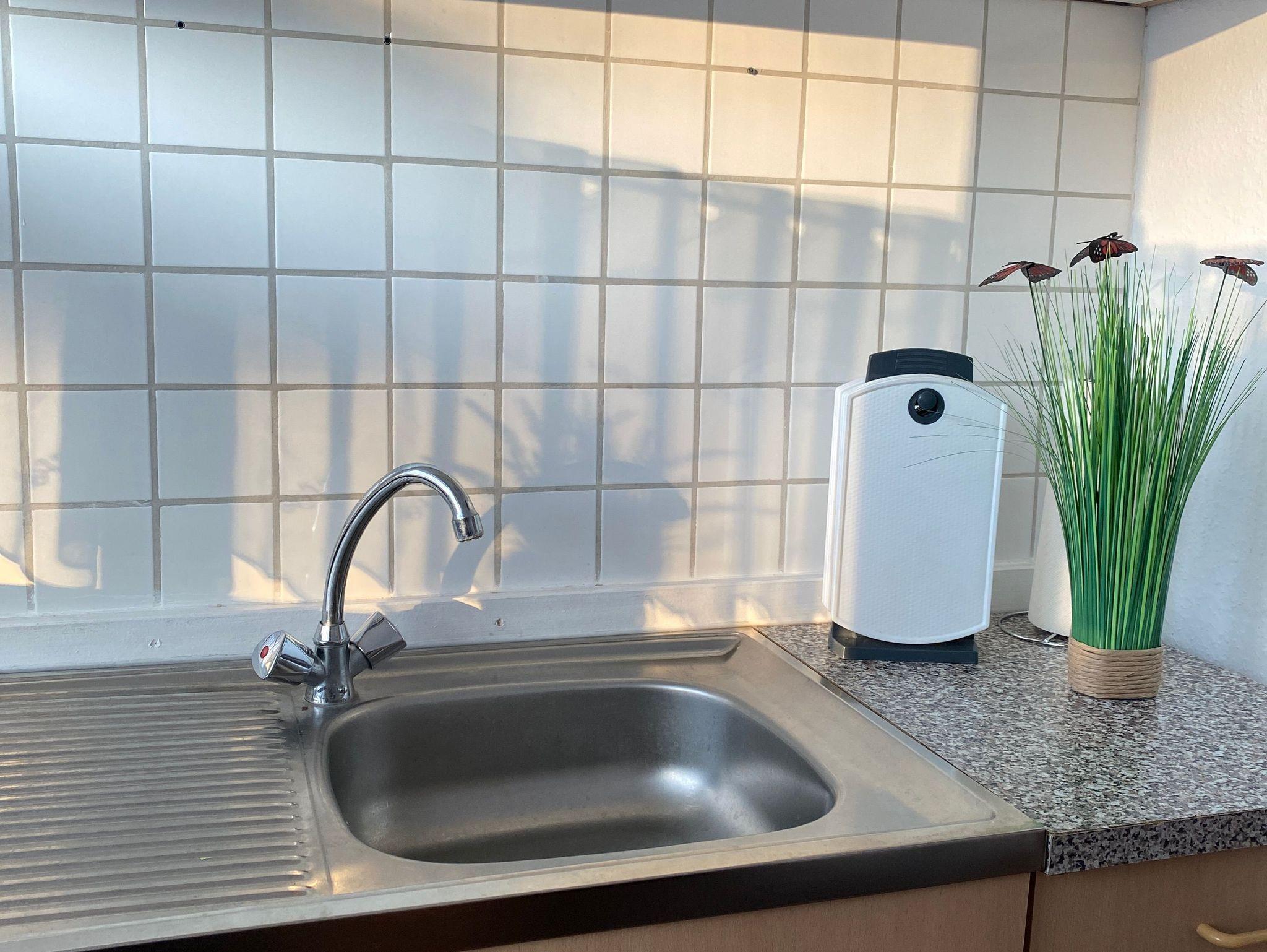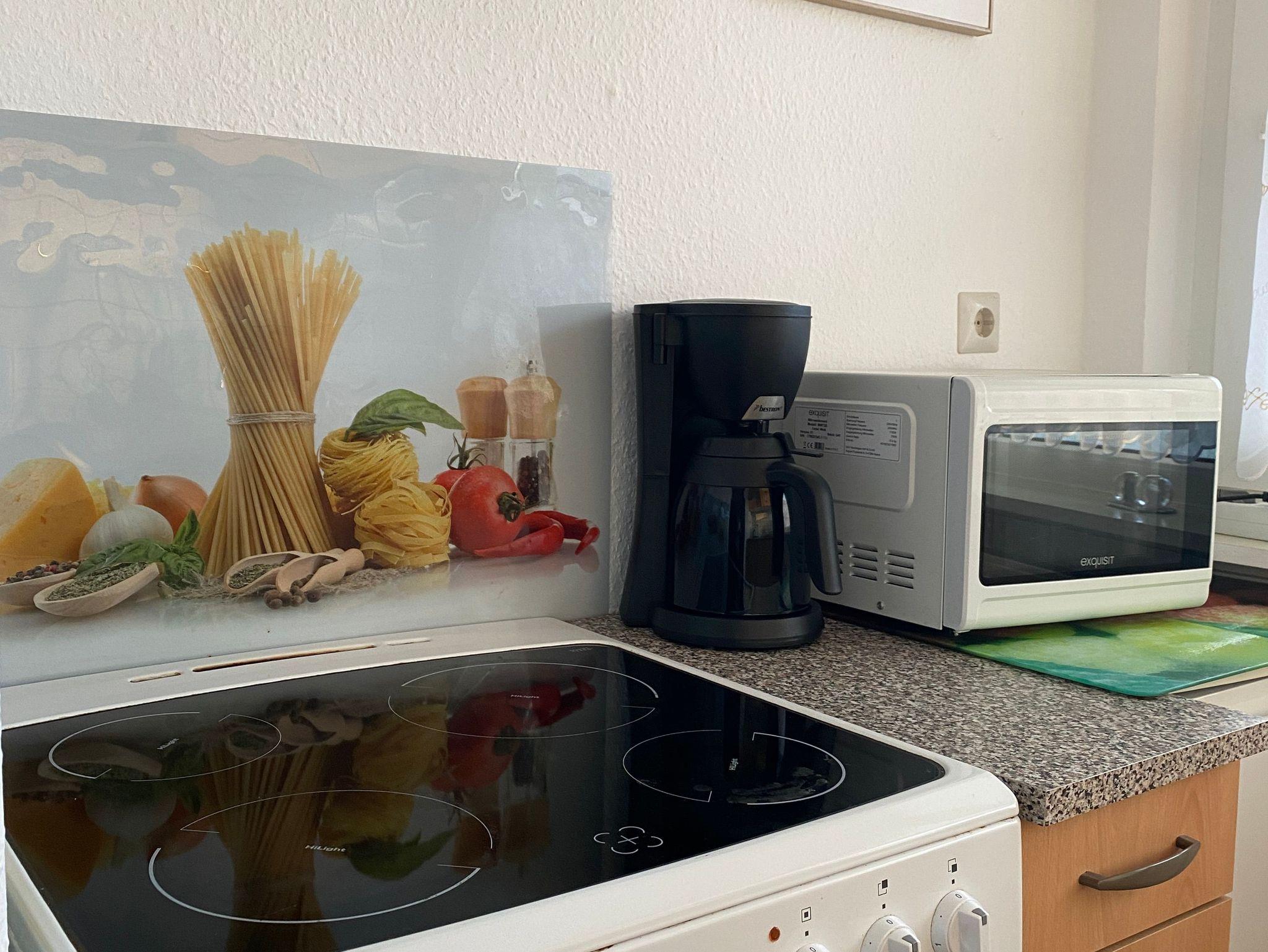 • Küche: kleine Küchenzeile, 4er-Ceran-Herd, Backofen, Kühlschrank mit Gefrierfach, Spülmaschine, Wasserkocher, Kaffeemaschine, Toaster, Mikrowelle