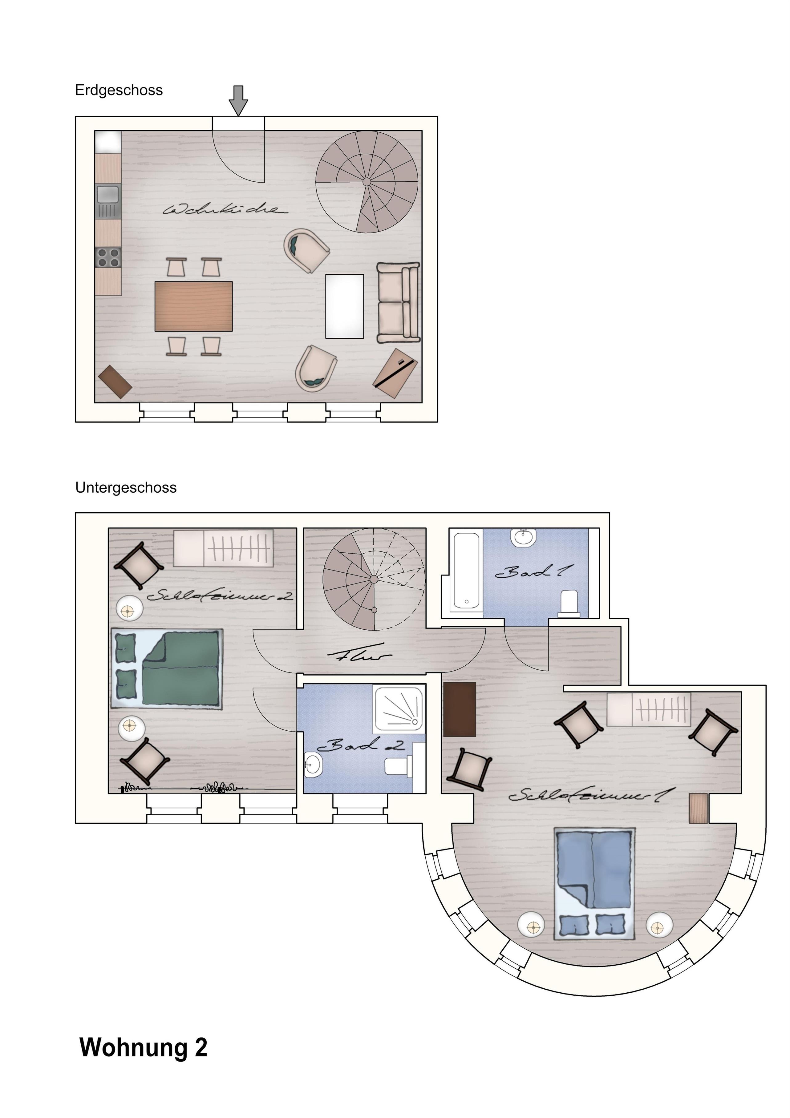 Die Ferienwohnung 2 des Herrenhauses befindet sich im Erdgeschoss und im Souterrain des Gutshauses und erstreckt sich über zwei Etagen (Wendeltreppe). Hunde sind in dieser Wohnung willkommen.
