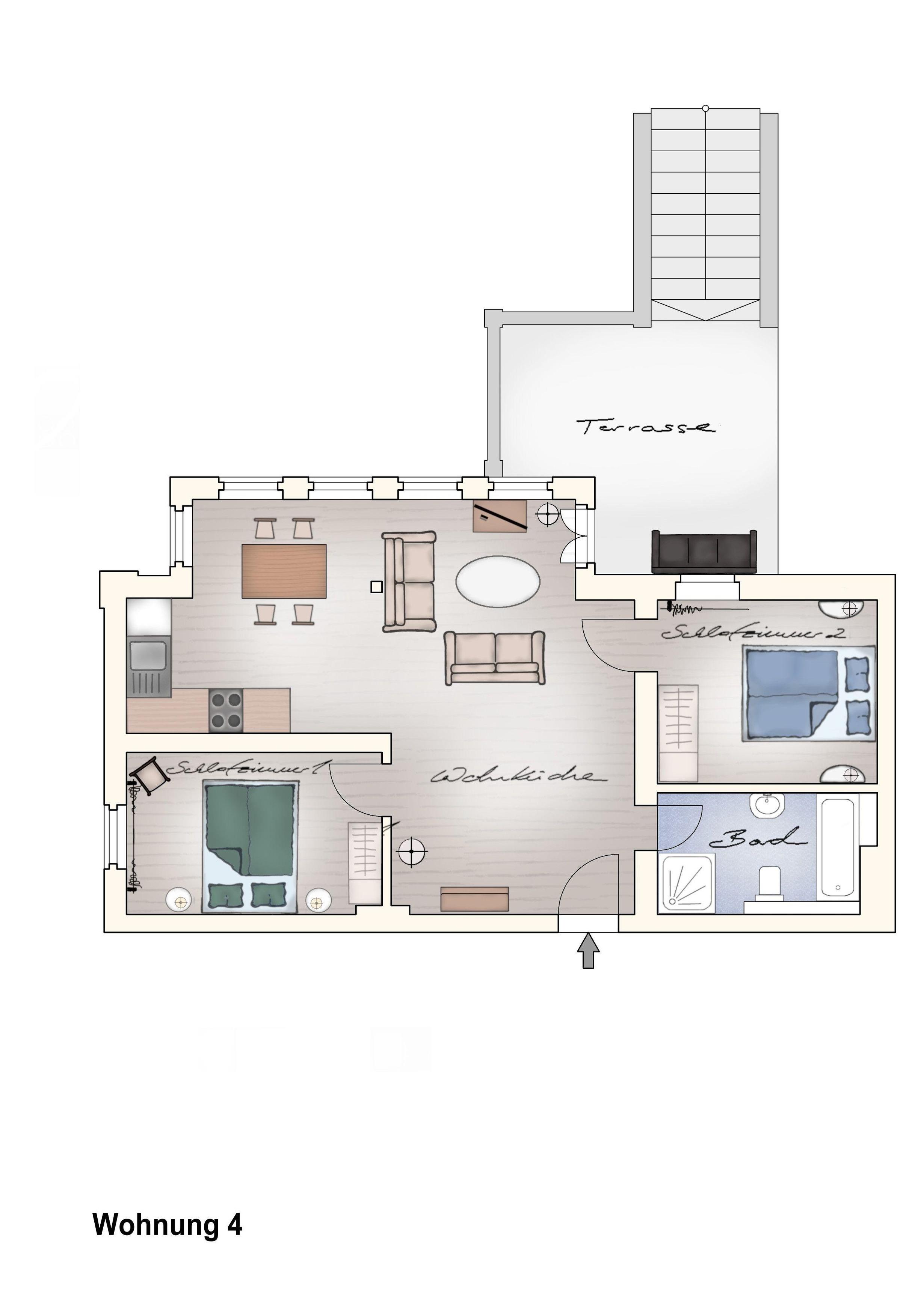 Die Ferienwohnung 4 des Gutshauses befindet sich im 1. OG des Hauses. Maximal 2 Hunde sind in dieser Wohnung willkommen.