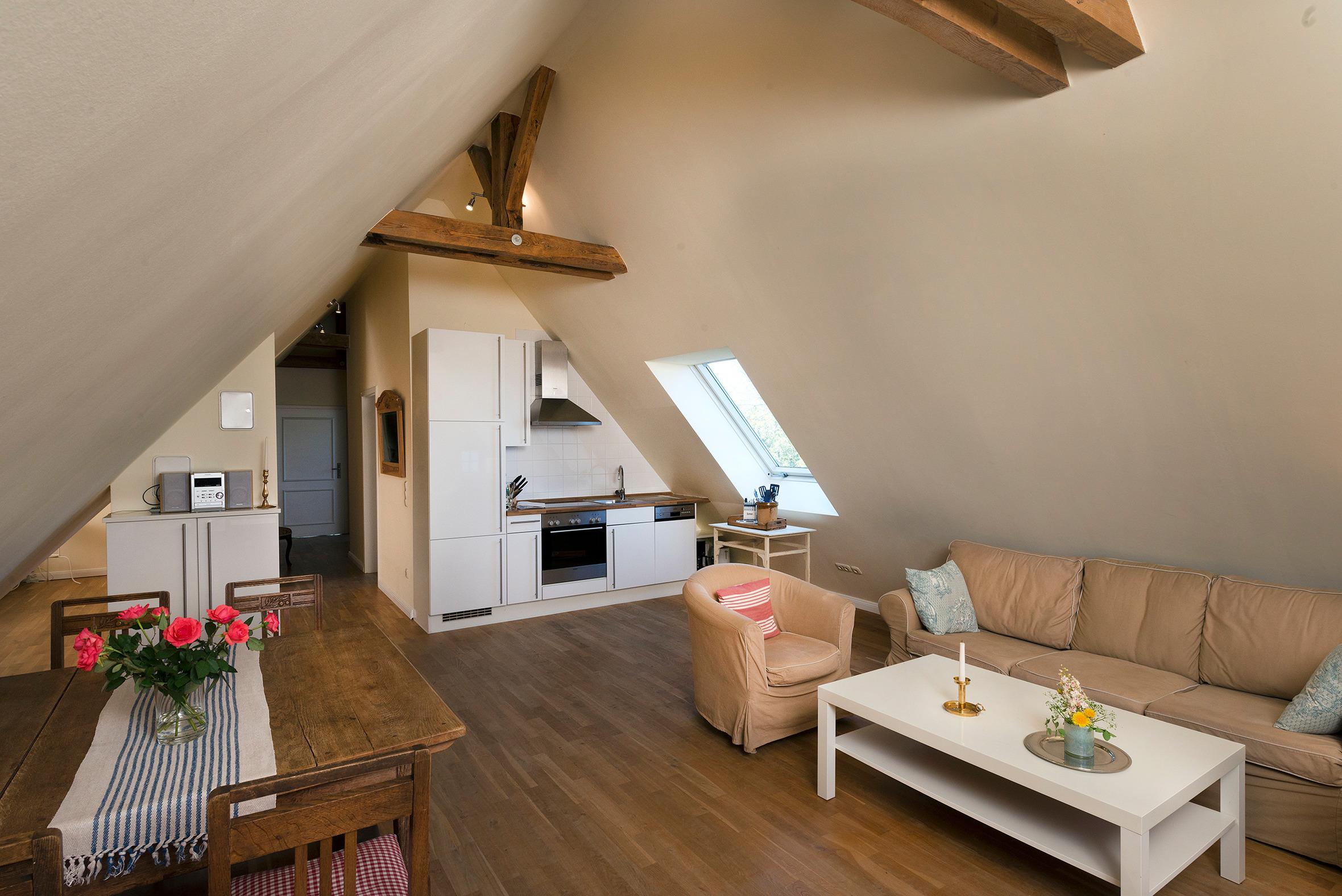 Die Ferienwohnung Nr. VIII des Gut Grubnow befindet sich im äußerst gemütlichen Dachgeschoss des Gutshauses. Die Wohnung für bis zu vier Personen und in einer Größe von 78 m² ist mit Liebe zum Detail eingerichtet und besteht aus drei Zimmern: Ein großes Wohnzimmer mit offener Küche (Siemens-Geräte) und schönem Blick auf den Garten und das Wasser, ein Schlafzimmer mit zwei Einzelbetten und ein Schlafzimmer mit einem Doppelbett (offene Raumgestaltung, ohne Tür) und ein Badezimmer mit separater Badewanne und Dusche.