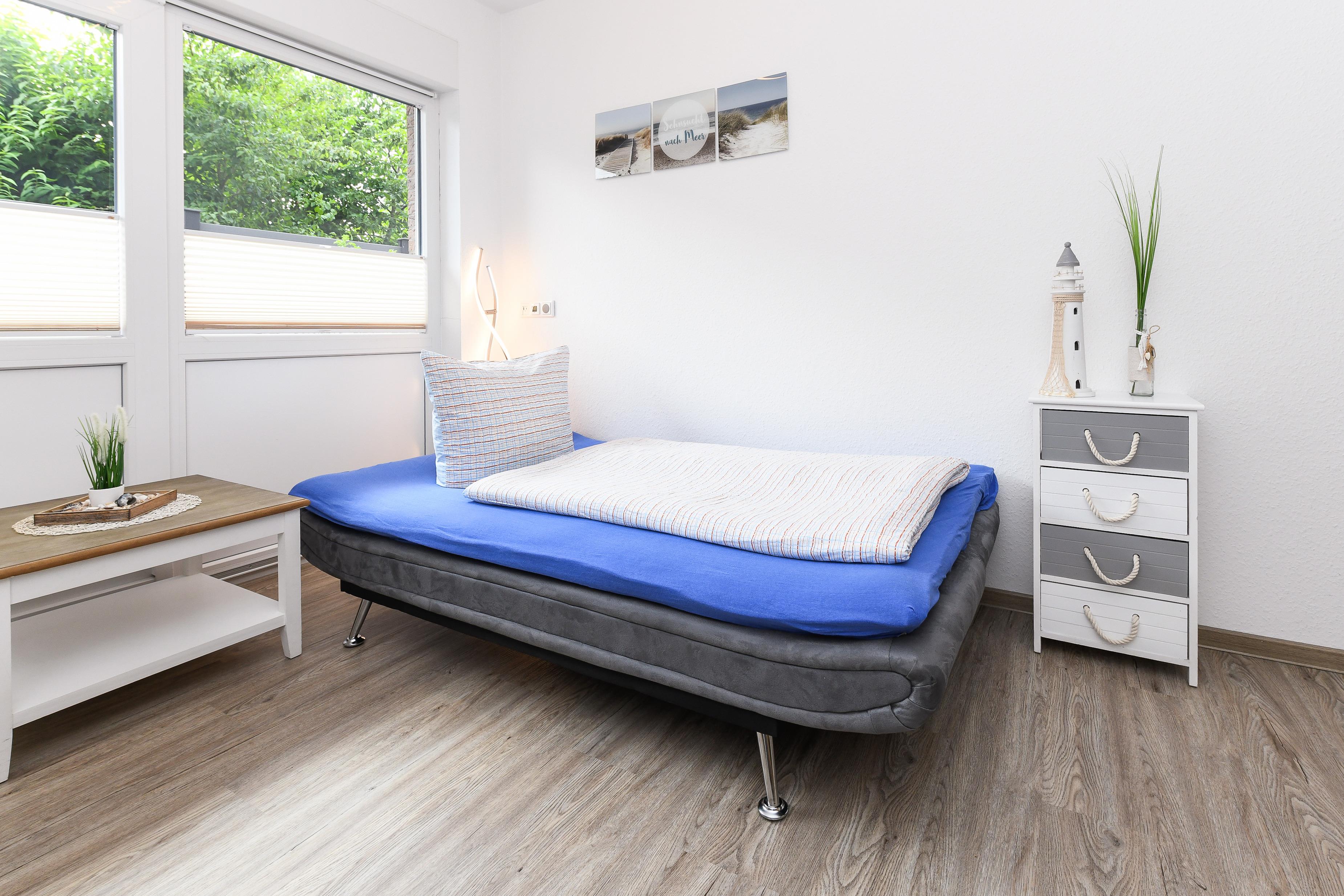 Die Wohnung ist wie folgt aufgeteilt. Im Wohnraum befindet sich eine Küchenzeile (Wasserkocher, Toaster, Filter Kaffeemaschine, Sitzgelegenheiten sowie ein Sofa mit Schlaffunktion. Das Badezimmer mit Tageslicht ist mit einer Dusche und WC ausgestattet. Ein Schlafraum mit einem 180*200 Boxspringbett und einen zusätzlichen Schlafraum mit einem 140*200 Boxspringbett gehören noch mit zur Wohnung. Der kleine Flur rundet die Wohnung ab.