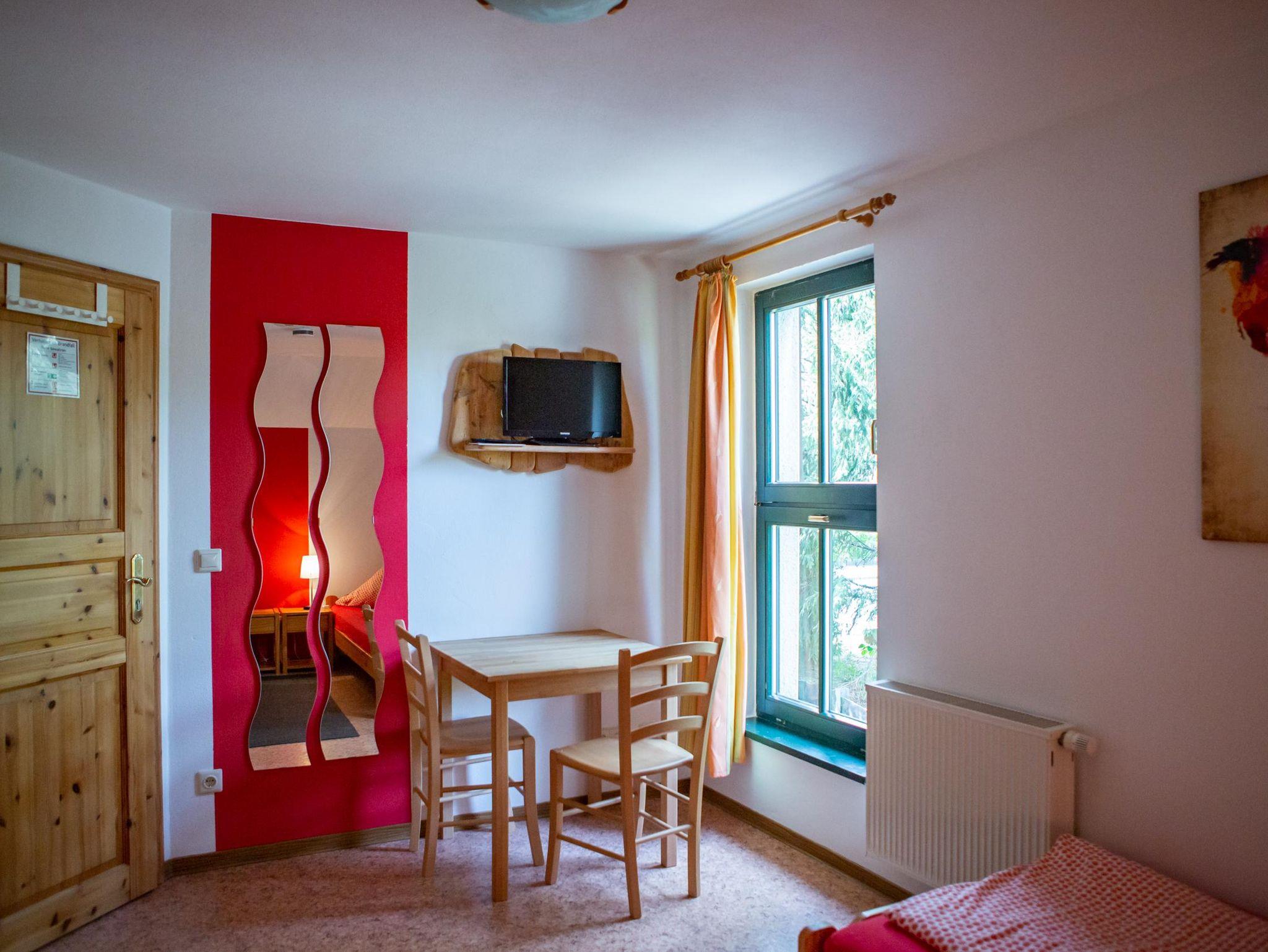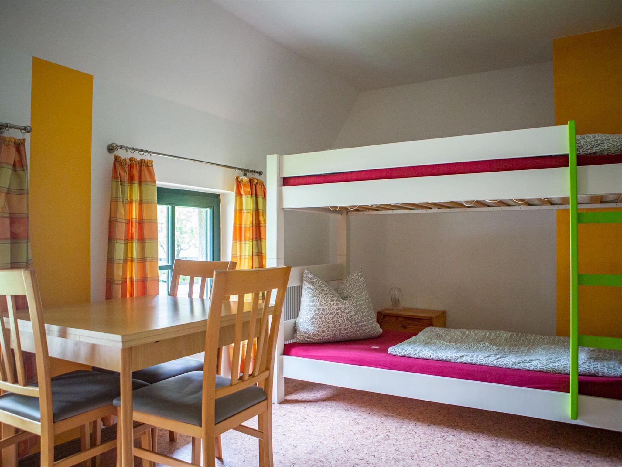 Alle Zimmer sind bequem und praktisch eingerichtet. Die beiden 2-Bett-Zimmer sind ausgestattet mit TV. Im 6-Bett-Zimmer schläft man in Doppelstockbetten. Die beiden Gruppenzimmer unter dem Dach besitzen jeweils maximal 10 Schlafmöglichkeiten. Dusche und WC sind über einen gemeinsamen Flur erreichbar. Unser Aufenthaltsraum dient gleichzeitig als Speise-, Seminar oder Fernsehzimmer sowie für gemütliche Abende und Feierlichkeiten. Baby-/Kleinkindausstattung ist vorhanden und wird Ihnen kostenfrei zur Verfügung gestellt. Gern bieten wir Ihnen aber auch Frühstück, Halb- oder Vollpension an. Als Gruppenunterkunft haben Sie in Anlehnung an den Berghüttenstil die Möglichkeit, sich in Ihrem Schlafsack oder der hauseigenen Bettwäsche zur Ruhe zu legen. Des weiteren stehen Ihnen eine Selbstversorgerküche und ein Grill zur Verfügung. Die Selbstversorgerküche verfügt über 2 Geschirrspühler, 2 Elektroherde, 1 Kombi- Dämpfer, Kühlschrank, Gefrierschrank, Kaffeemaschine, Wasserkocher, Geschirr und Besteck, Geschirrtücher. Die Nutzung der Dachklause mit Billardtisch, Dart und Wii kann gegen Aufpreis dazugebucht werden.
