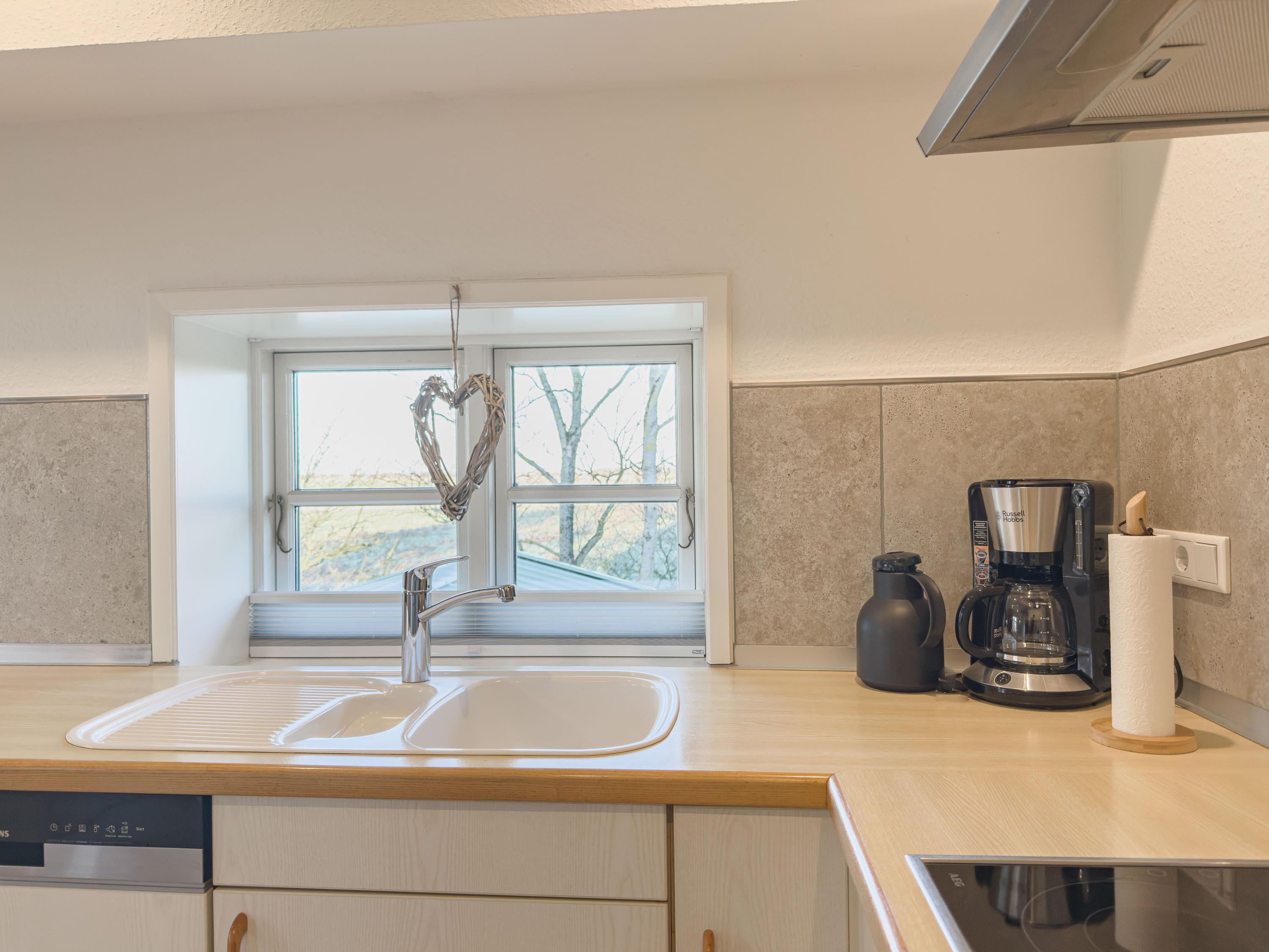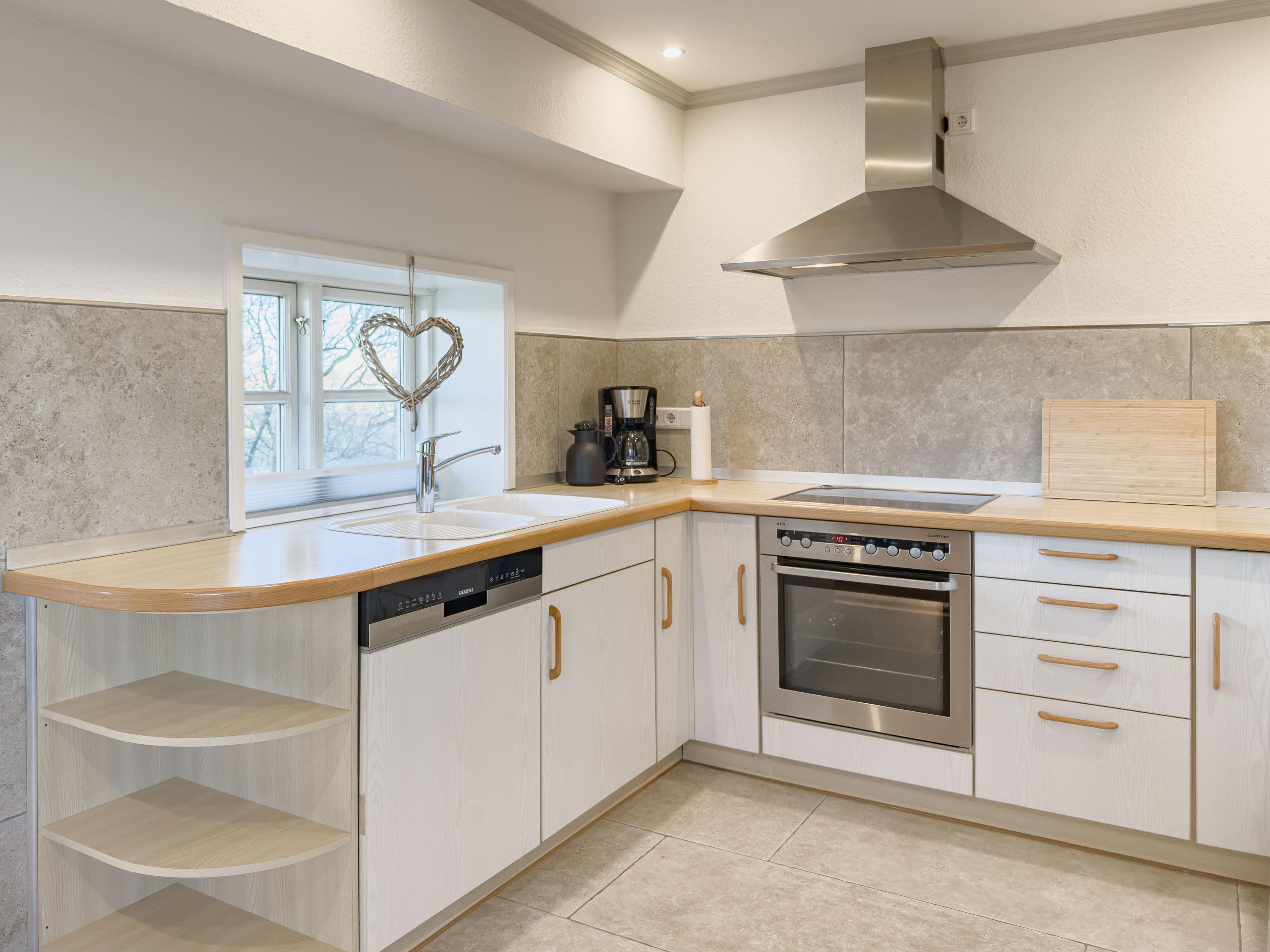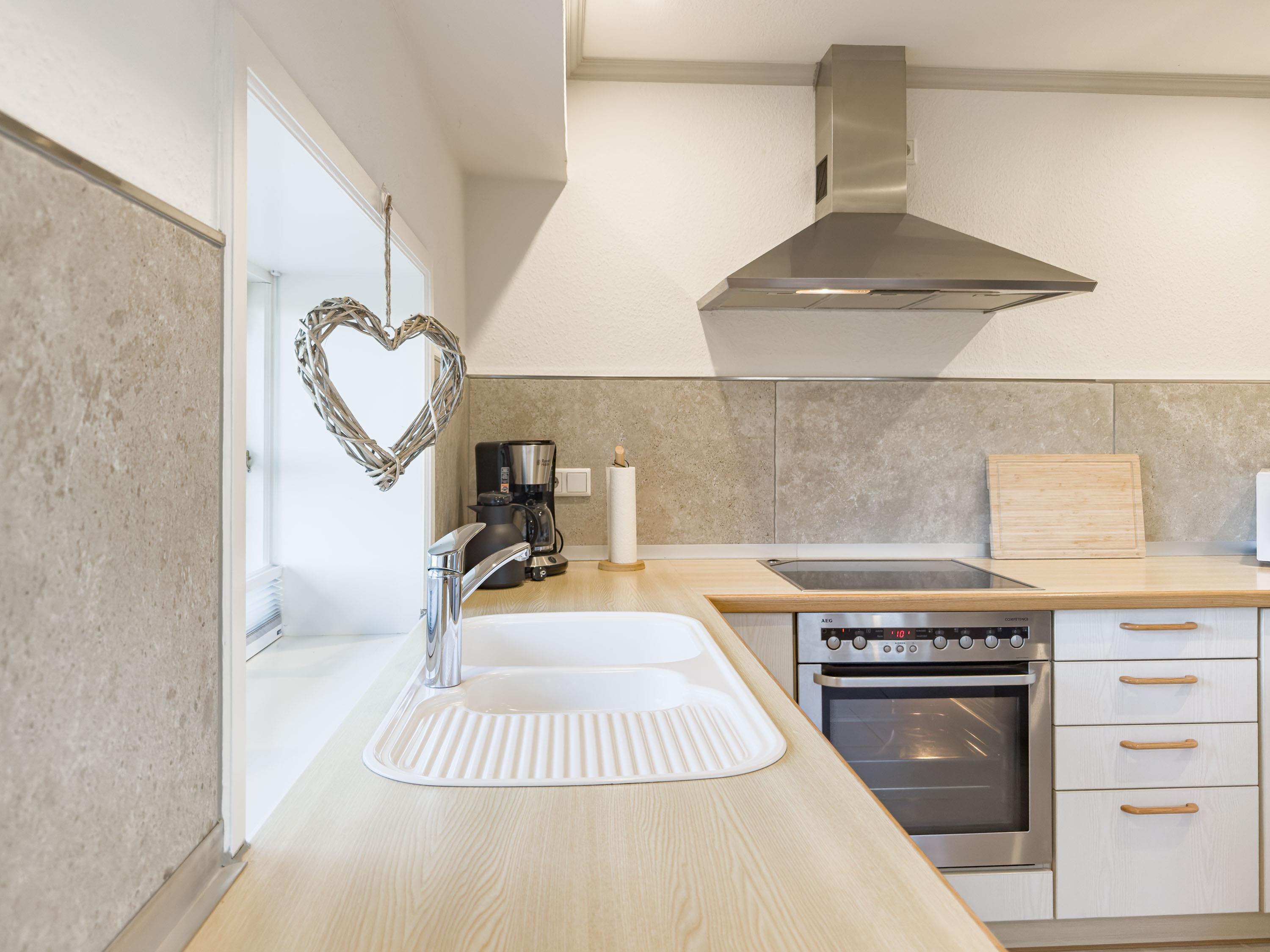 Die moderne, helle Küche ist harmonisch integriert und lädt zum gemeinsamen Kochen, Genießen und Verweilen ein.