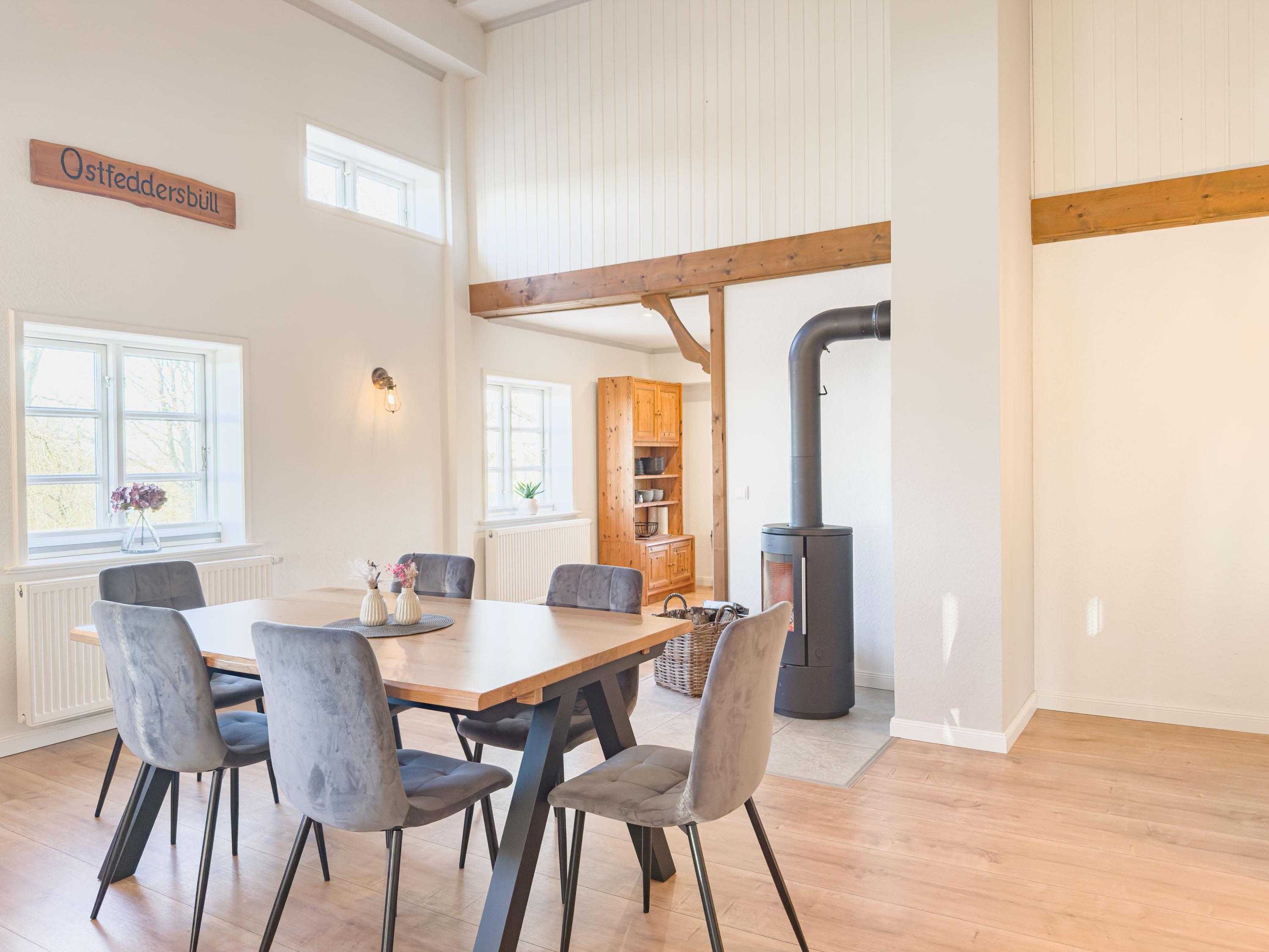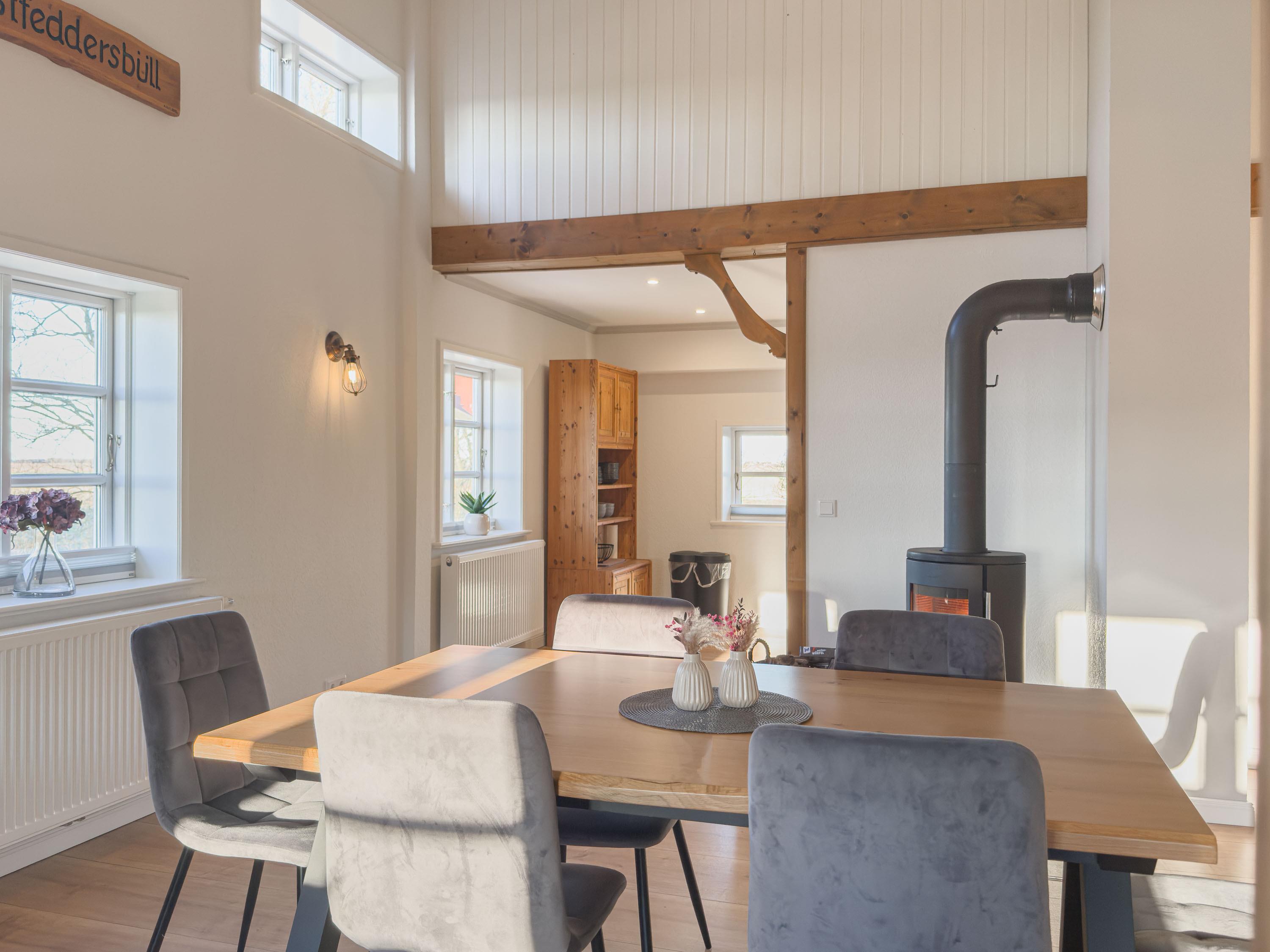Viele Fenster lassen viel Tageslicht herein, während der Kaminofen an kühleren Tagen für gemütliche Stunden sorgt.