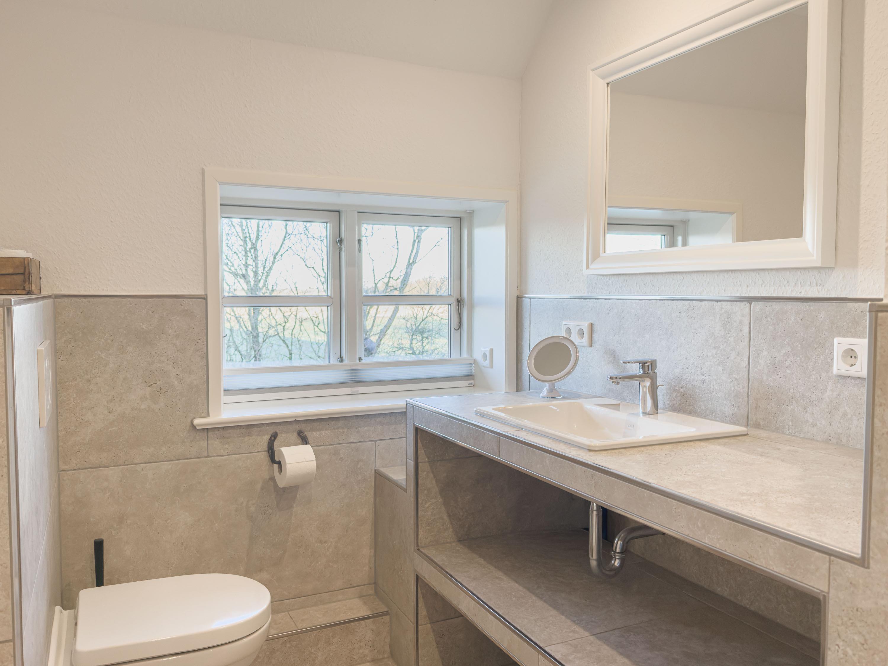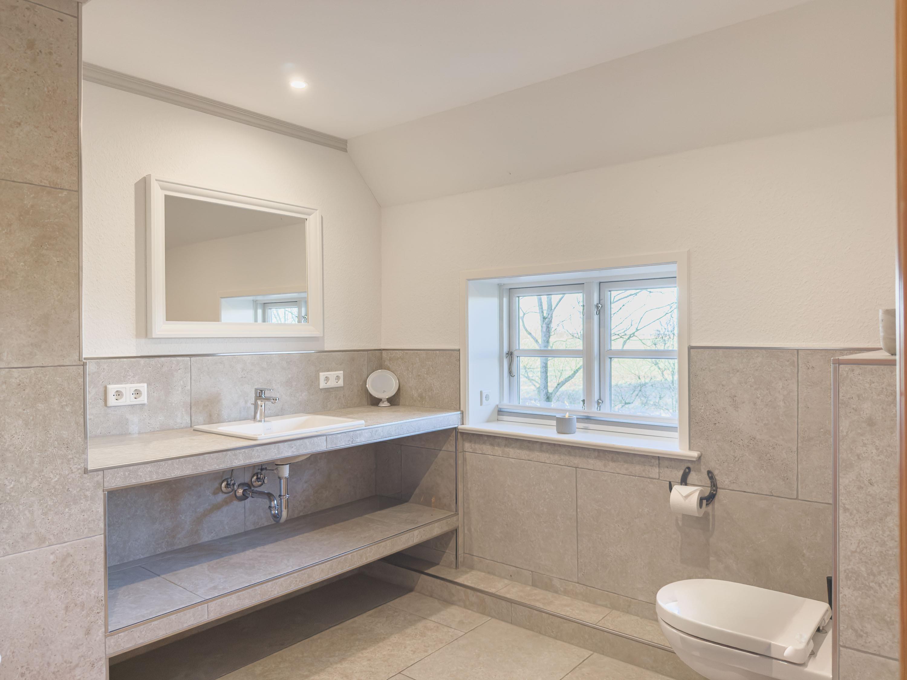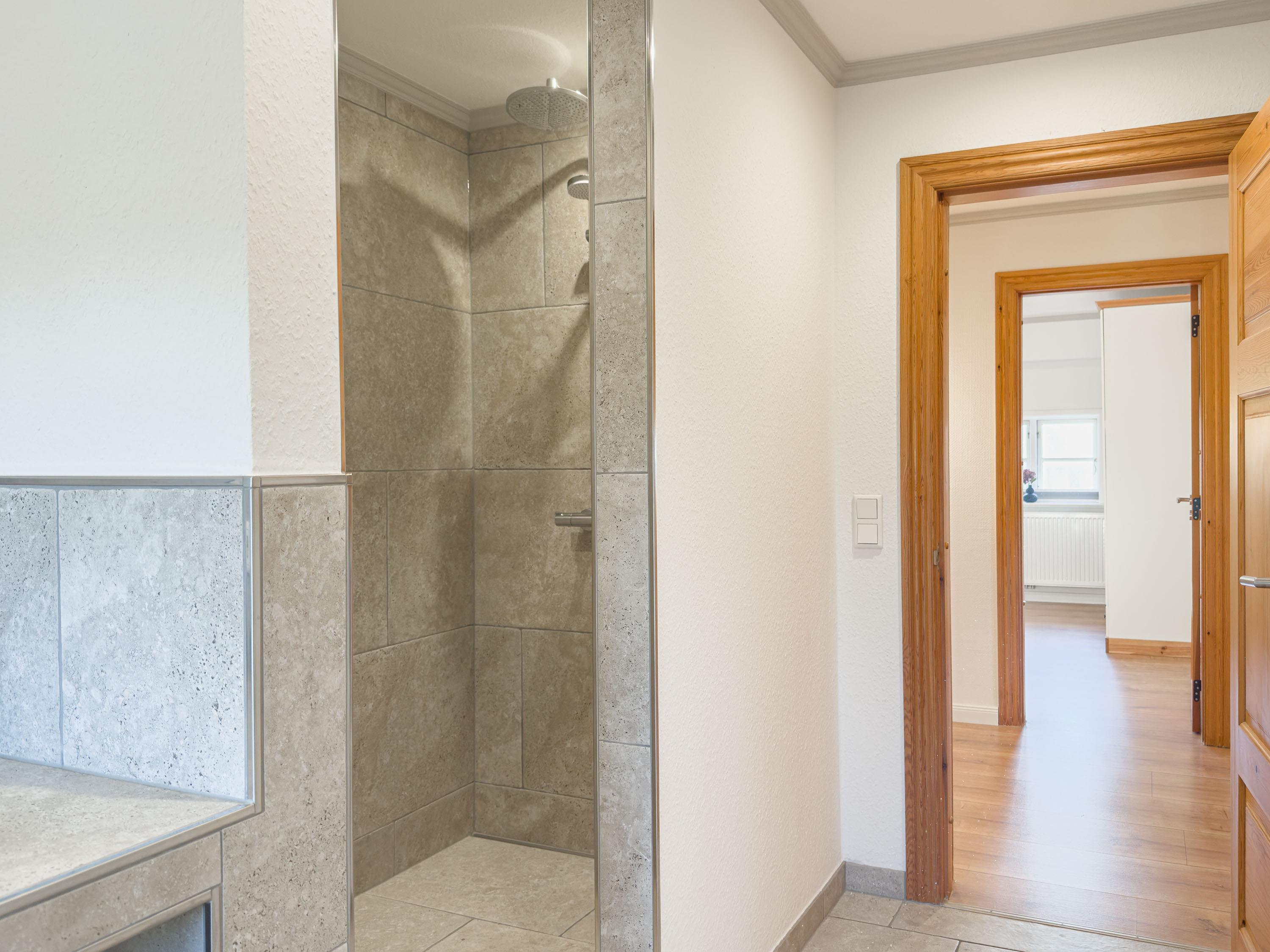 Mit zwei modernen Bädern, darunter mit ebenerdiger Dusche, ist auch bei voller Belegung für ausreichend Komfort gesorgt.