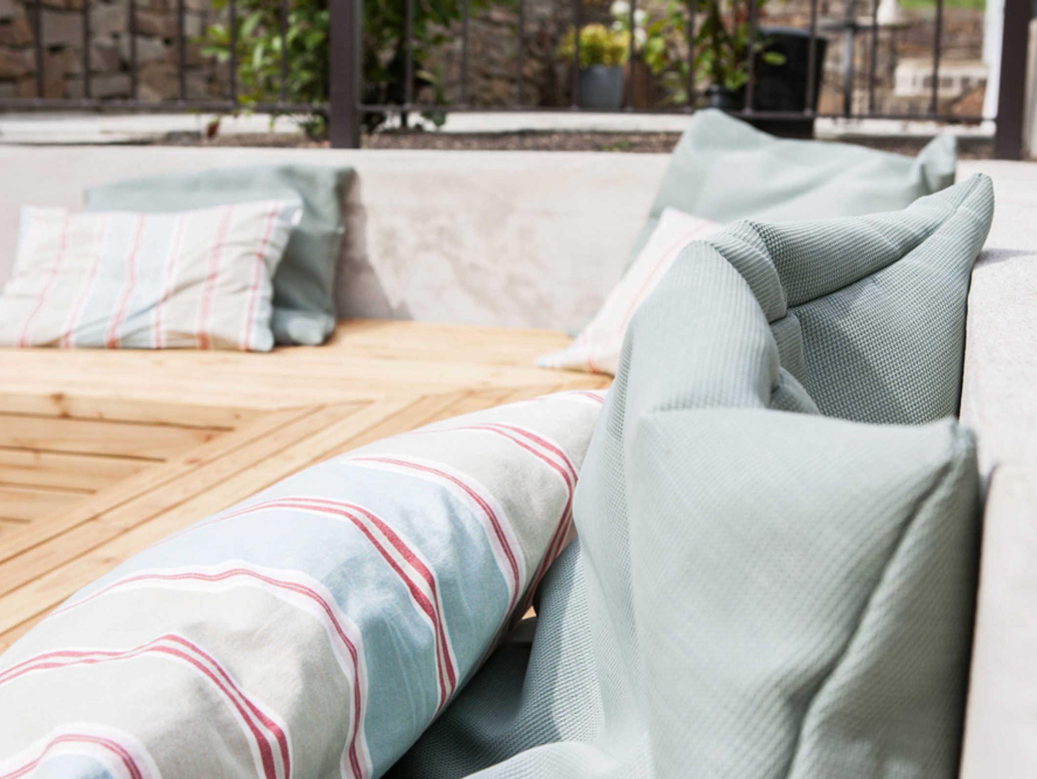 Ginko-Baum. Ein mit vielen Kissen dekoriertes „Daybed“ lädt zum gemütlichen