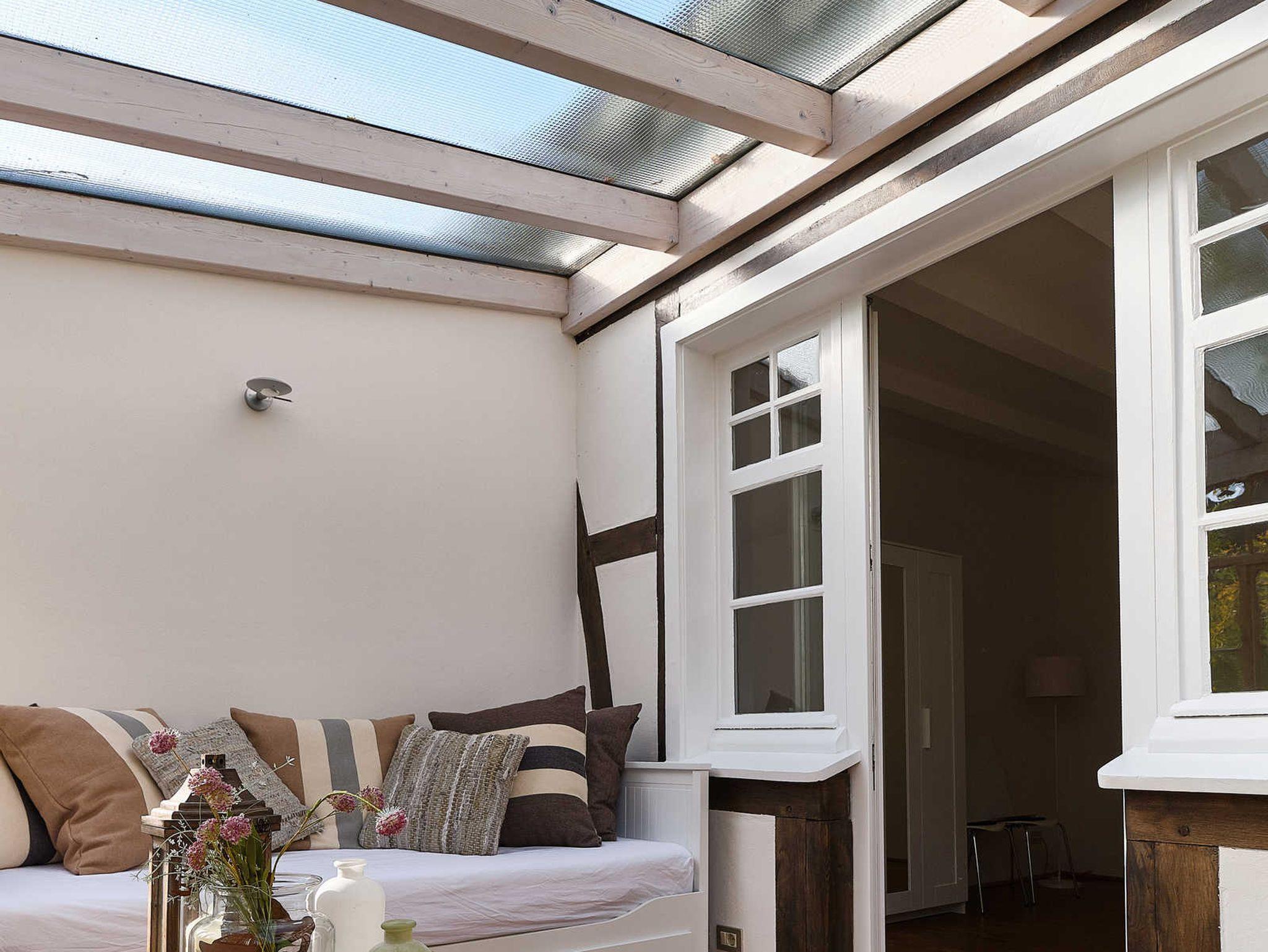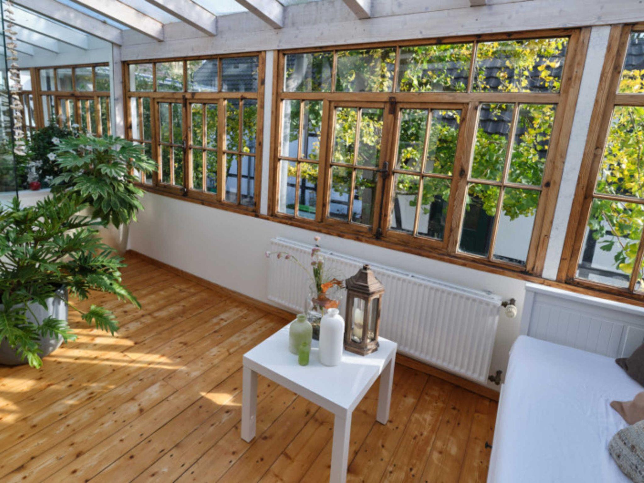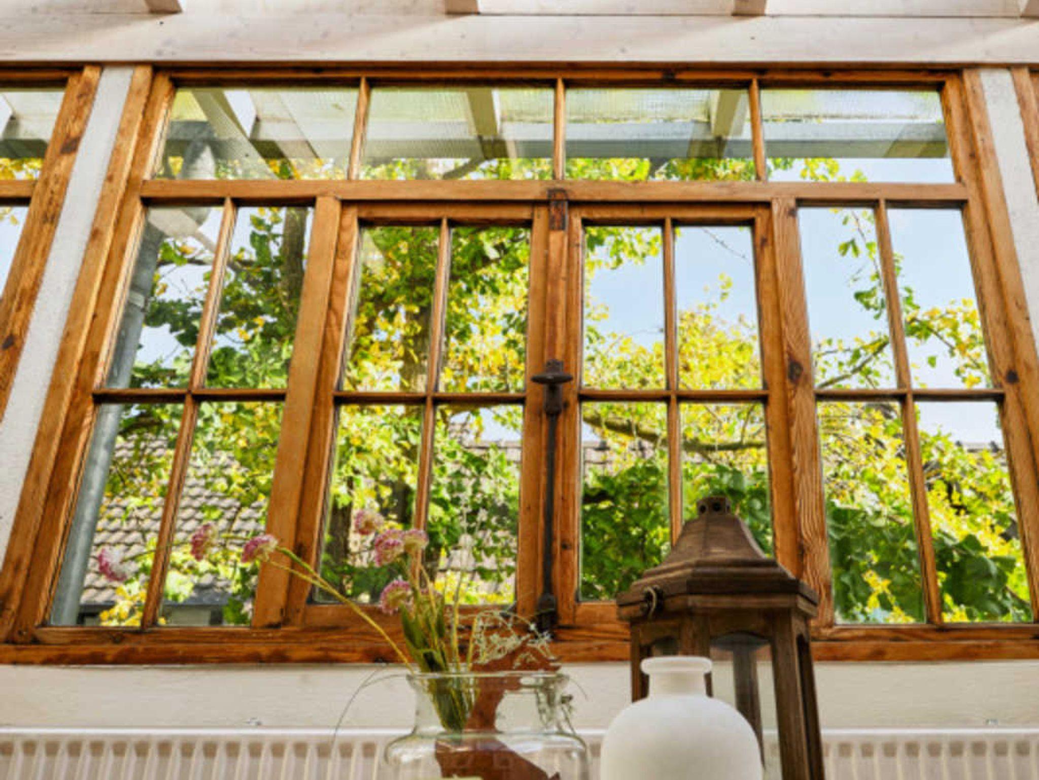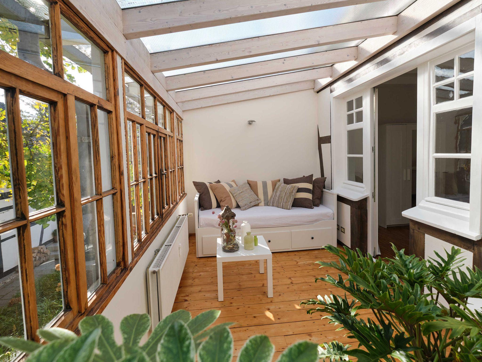 traumhaften Wintergarten mit Holzsprossenfenster und Blick zum Innenhof mit