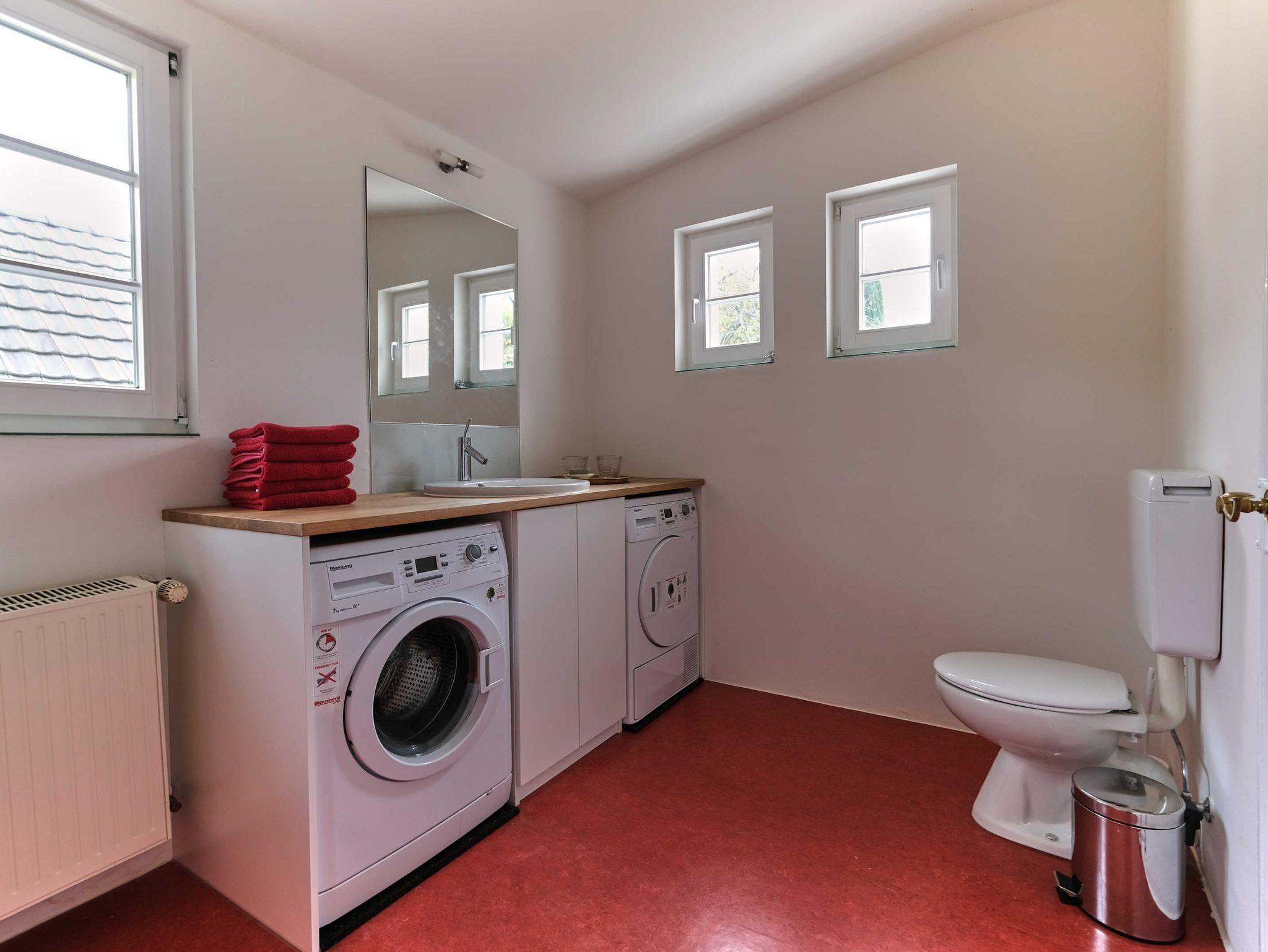 Eiche-Massivholzplatte, Mittelschrank, Waschmaschine und Trockner. Ein weiteres