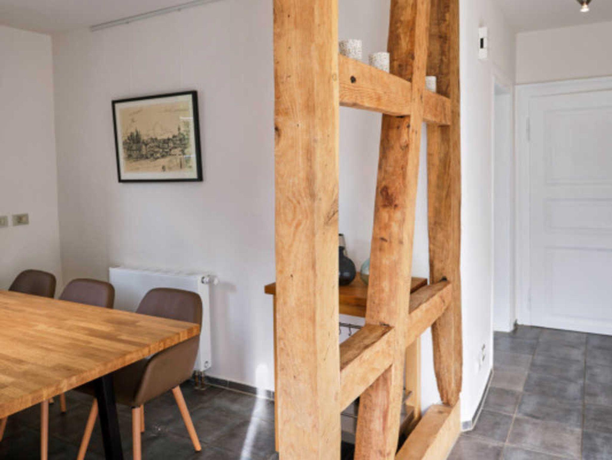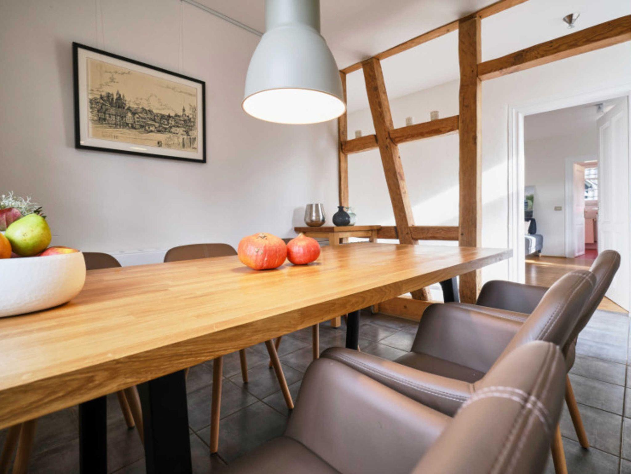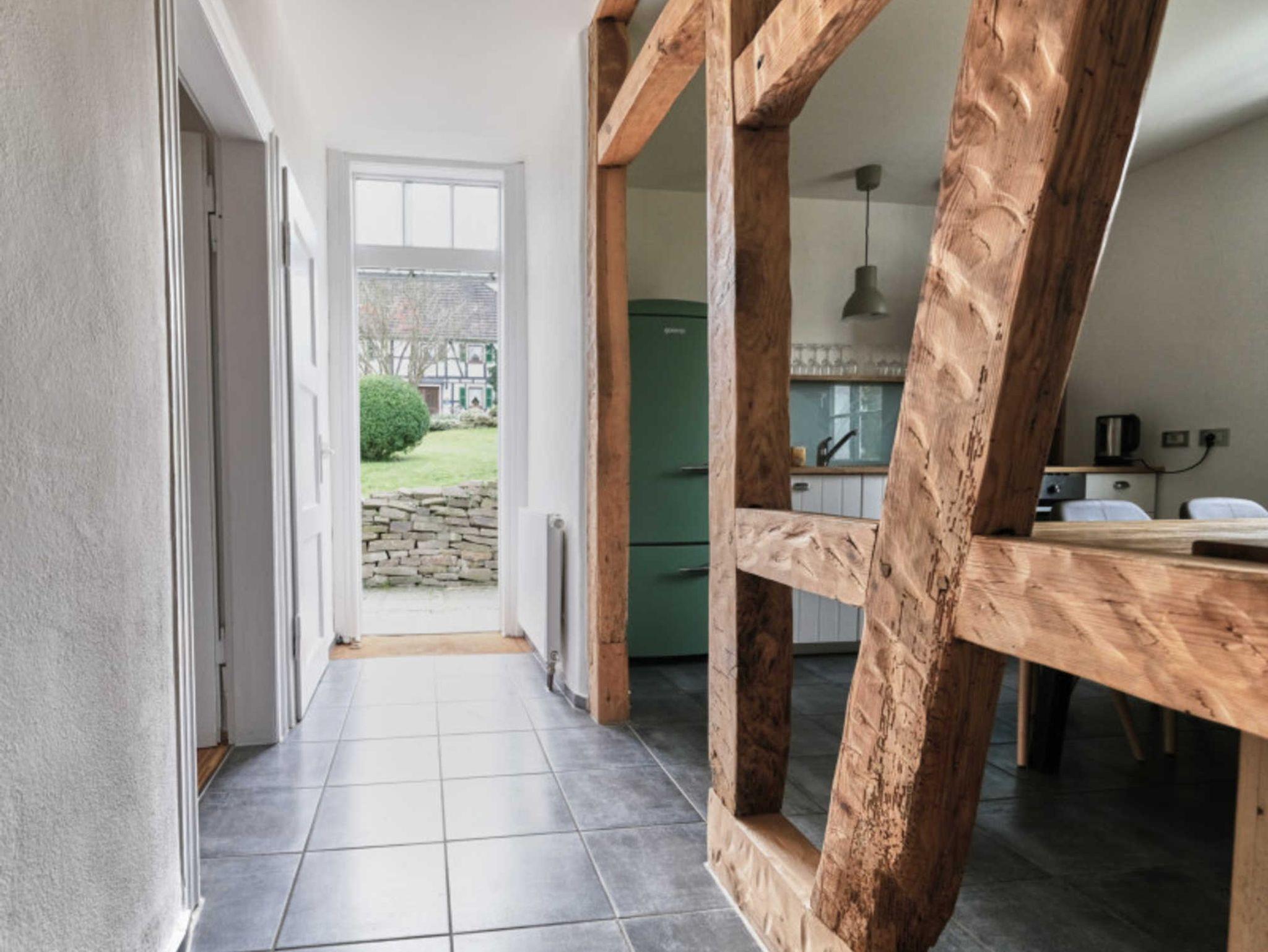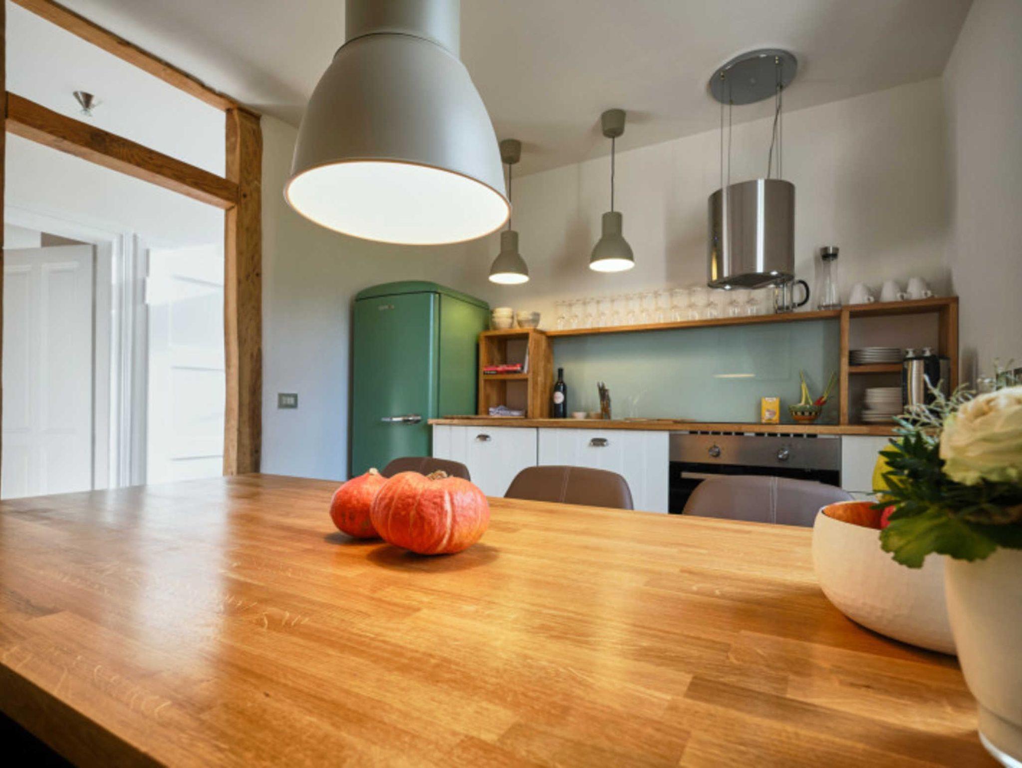 freigelegten Fachwerkkonstruktion. Eine moderne, voll ausgestattete Küche sowie