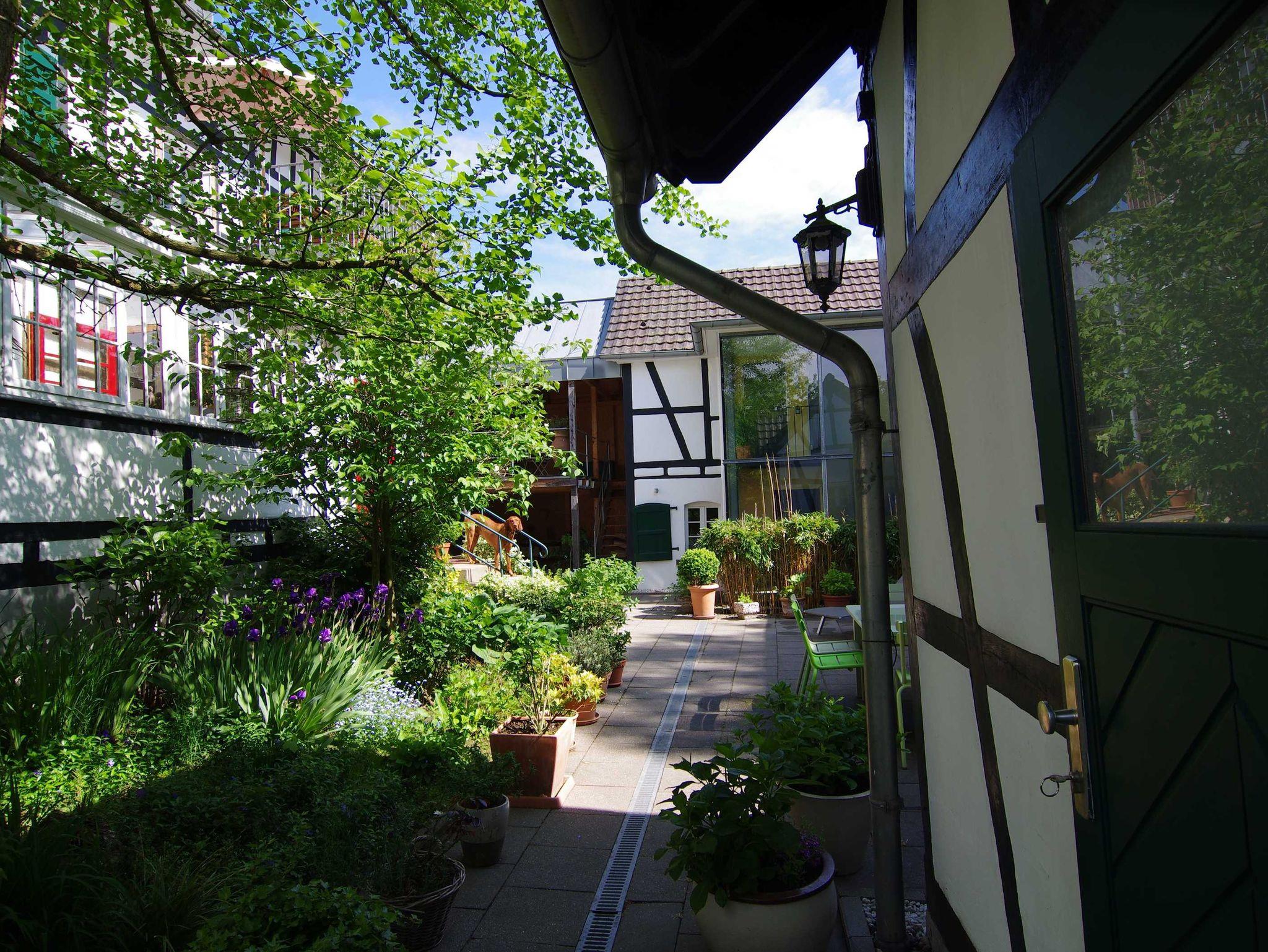 Ferienwohnungen. Im Innenhof gibt es Sitzgelegenheiten und am Brunnen