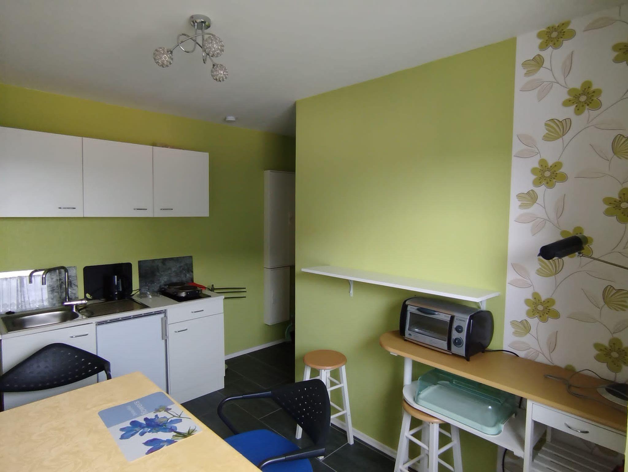 Die Ferienwohnung befindet sich im Erdgeschoss und ist in unmittelbarer Nähe zur Haustür. Vor der Haustür steht eine Gartenbank mit Blick auf Blumen, Gärten und einer guten Fernsicht. Der Schlafraum mit ca. 15 m² bietet Platz für ein Doppelbett, einen Schrank und zusätzlich eine gemütliche Ecke mit Tisch und Stühlen, von wo aus ein Flachbild-TV gut sichtbar ist. Es ist ein sonniger, heller Raum. Die komplett ausgestattete Küche mit Kühlschrank inkl. Gefrierfach, Herd, Mini-Backofen, Wasserkocher und Eierkocher bietet den Komfort für entspannte Selbstversorgung. Evtl. kann ein elektrischer Grill mitbenutzt werden und für schöne Sommerabende sorgen. Eine gemütliche Essecke in der Küche lädt zum Essen und Verweilen ein. Im Badezimmer befinden sich Dusche, WC, Waschbecken, Spiegelschrank und Föhn. Bettwäsche, Handtücher, kostenfreie WLAN-Nutzung, Parkplatz und Endreinigung sind im Preis enthalten. Infrarot-Kabine und Markenkristallmatte können nach Absprache hinzugebucht werden.