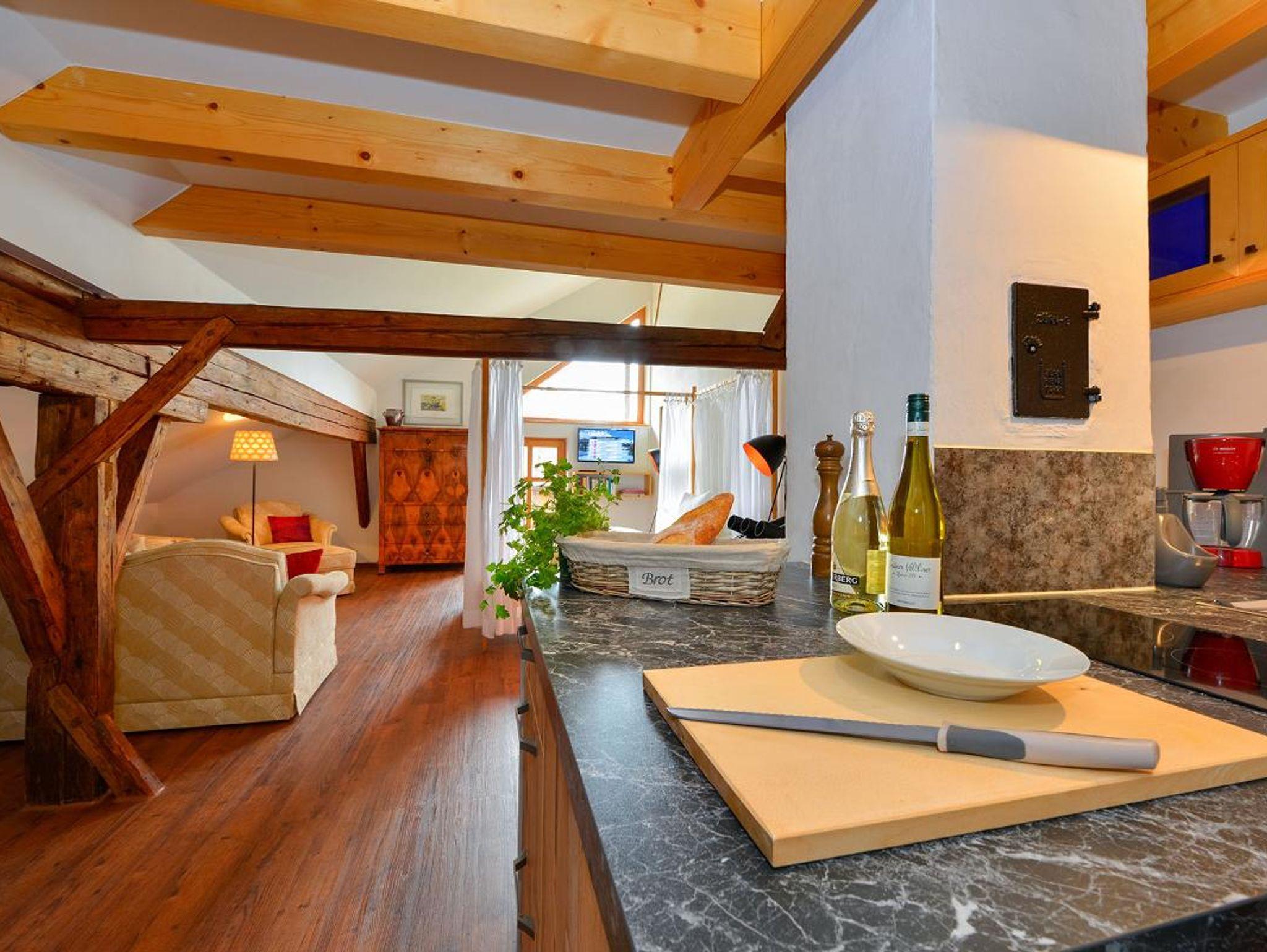 Eine moderne Einbauküche mit einladendem Essbereich, dem antiken Kreuztisch aus Eichenholz, lederbezogene Stühle aus eigener Werkstatt und den gesamten Rundblick in das Studio empfangen den Gast.