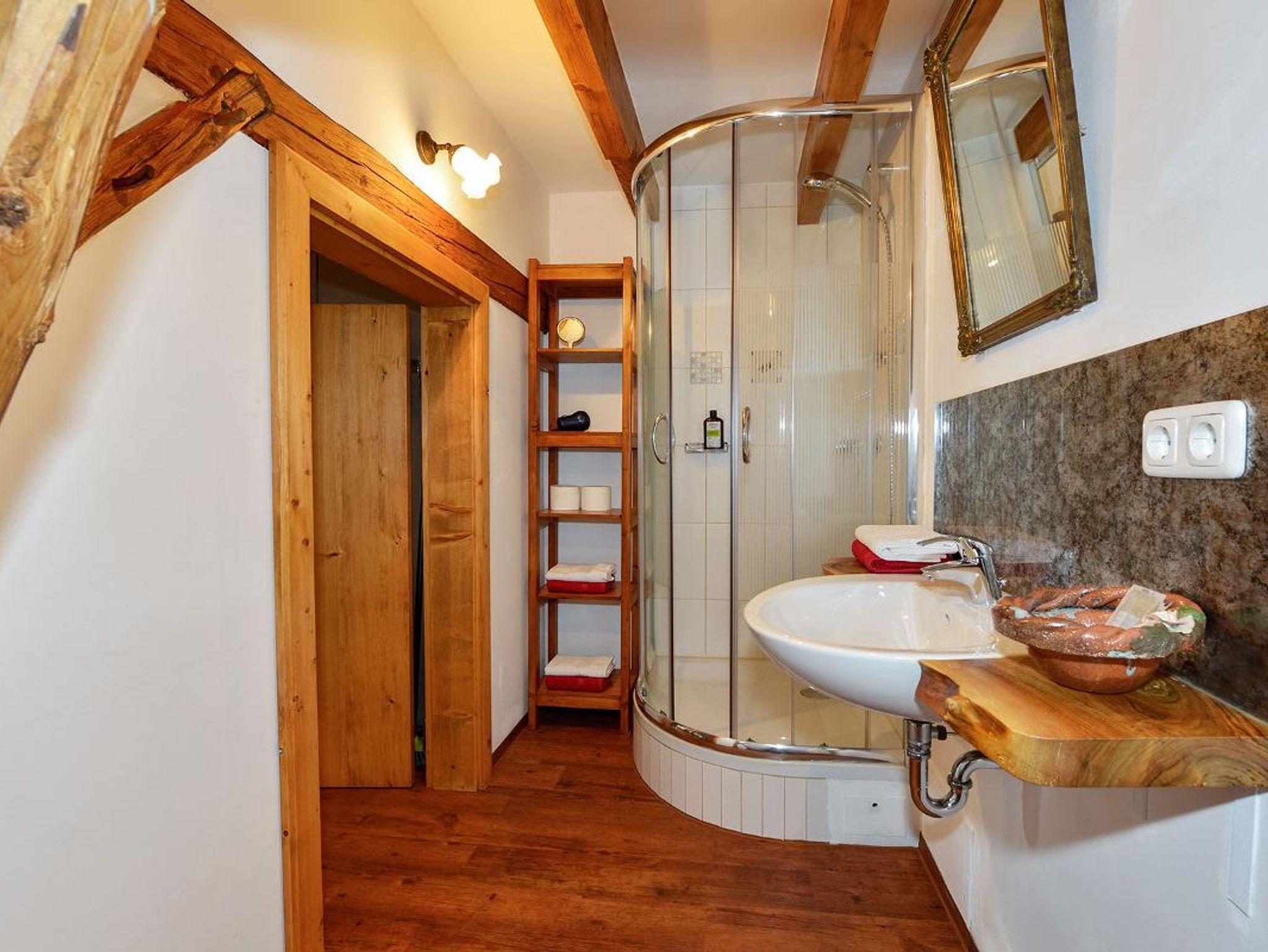 Im Bad erwarten den Gast ein schöner Spiegel in einem antiken Rahmen aus dem 19 Jht. und viele Accessoire.