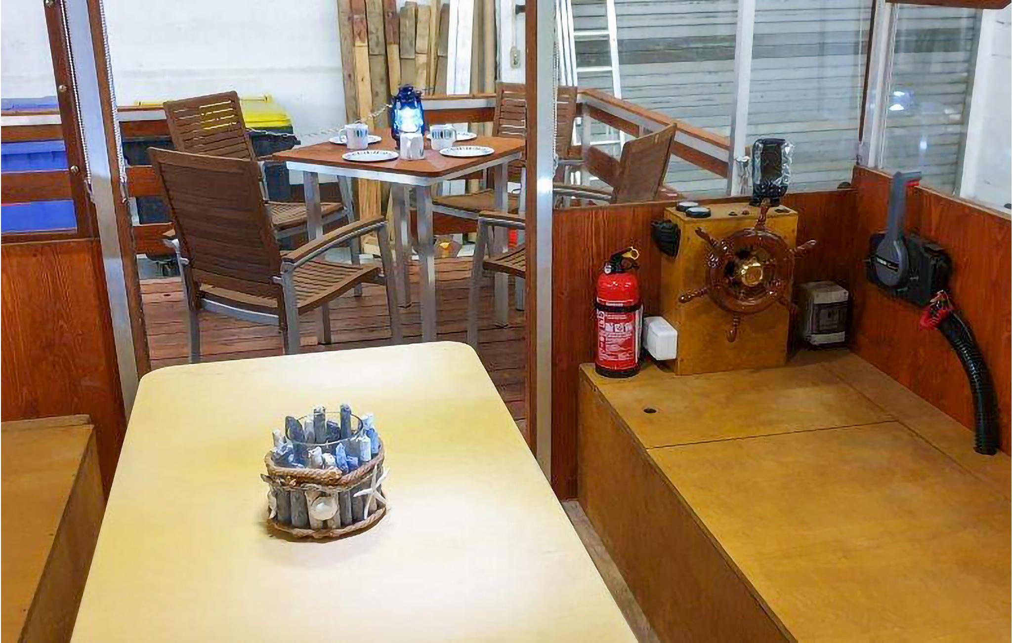 Du går inn i husbåten via den åpne terrassen i baugen og kommer inn i oppholdsrommet med styreposisjon. Her er det også to soveplasser, hvorav den ene kan gjøres om til en dobbeltseng med flatskjerm-TV på veggen, Wi-Fi på forhåndsforespørsel og avhengig av tilgjengelighet. Det er et lite kjøkken i åpen planløsning, med den doble køyesengen på motsatt side gjennom en liten skillevegg. Det er også et separat lite toalett med håndvask og integrert varmtvannsdusj. I baugen har du en innbydende terrasse med bord og stoler, og i akterenden er det to mindre områder for avslapping. Det er tilstrekkelig med redningsvester og fendere om bord, og i likhet med båten blir de nøye sjekket før avreise.