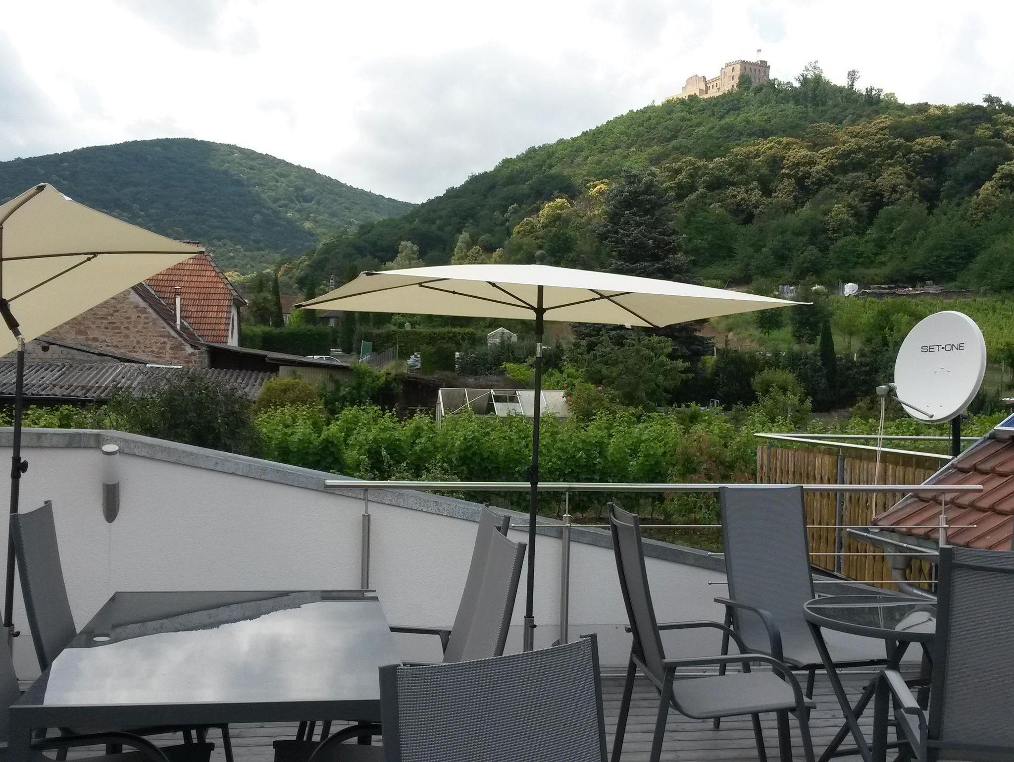 Unsere drei Ferienwohnungen befinden sich im 1. Stock und sind nicht barrierefrei erreichbar. Die Nichtraucher-Apartments sind für 2 bis 4 Personen geeignet. Jeweils ausgestattet mit Küchenzeile (Kühlschrank mit Gefrierfach, Backofen, Cerankochfeld, Dunstabzugshaube, Spülmaschine, Filterkaffeemaschine, Wasserkocher, Toaster), Essecke, Wohnbereich mit gemütlicher Couch mit Schlaffunktion (150 x 200 cm Liegefläche), TV mit Sat-Empfang, ein separates Schlafzimmer, Dusche/WC, Fön ist auch vorhanden. Dies alles verteilt sich auf eine Wohnfläche von ca. 50 m². Im Außenbereich befindet sich die Sonnenterrasse mit Blick zum Hambacher Schloss und in die Weinberge. PKW-Stellplätze sind im Hof vorhanden.