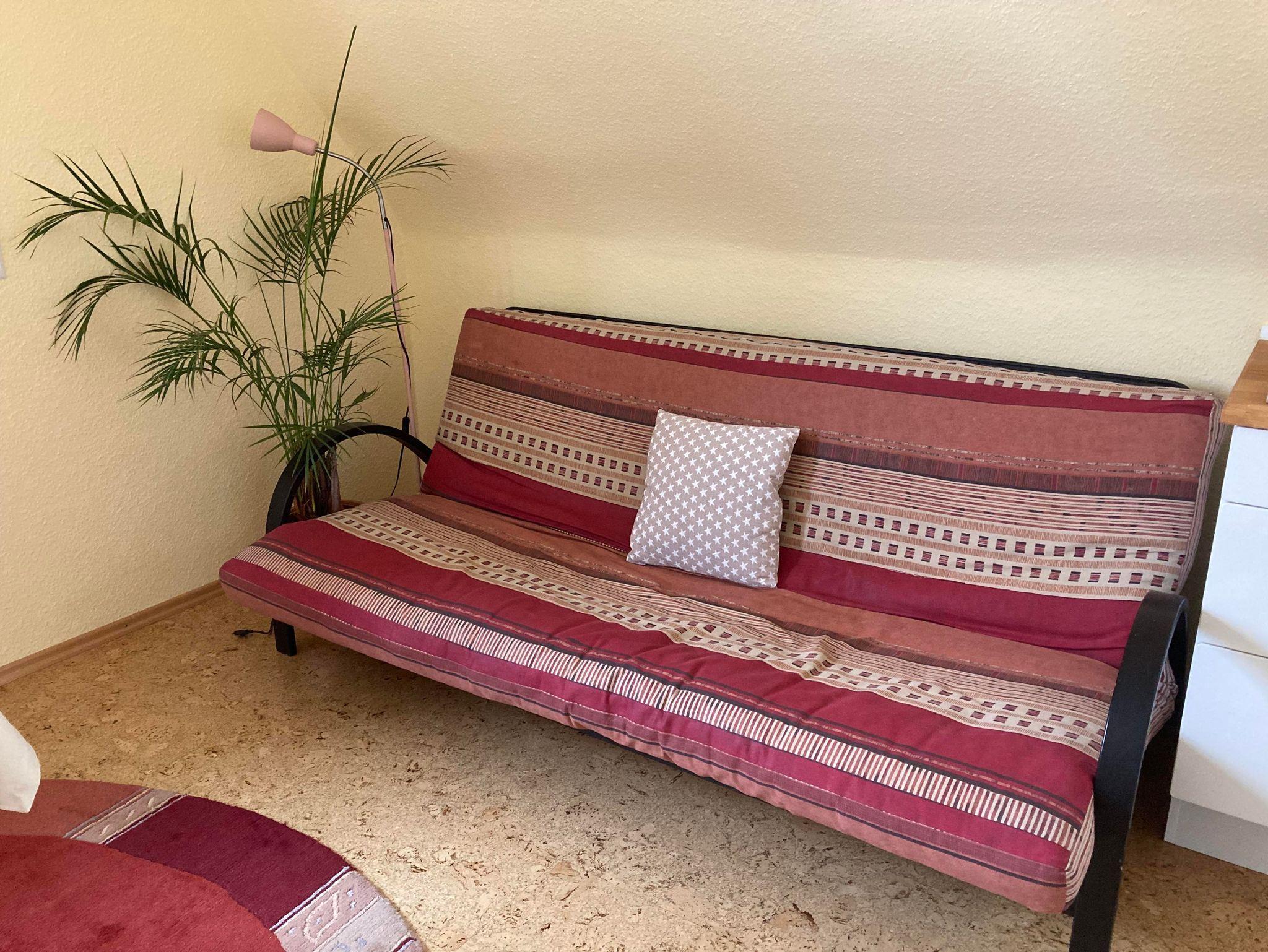In der abgeschlossenen Wohnung im 1. Stock wartet ein großes Wohnschlafzimmer mit einem 1,80m breiten Bett und eine komplett eingerichtete Wohnküche mit Sofa, Mikrowelle und Espressomaschine auf Sie. (WLAN, Schreibtisch und TV Satellit). Ein reichlich tragender Weinstock am Haus, ein Mandelbaum, Kirschbaum, Erdbeeren, Himbeeren und die Feige stehen im Garten zur Verfügung. Der Blick reicht zum Hambacher Schloss, Haardter Schloss und dem Weinbiet. Der Dachgarten ist südöstlich ausgerichtet.