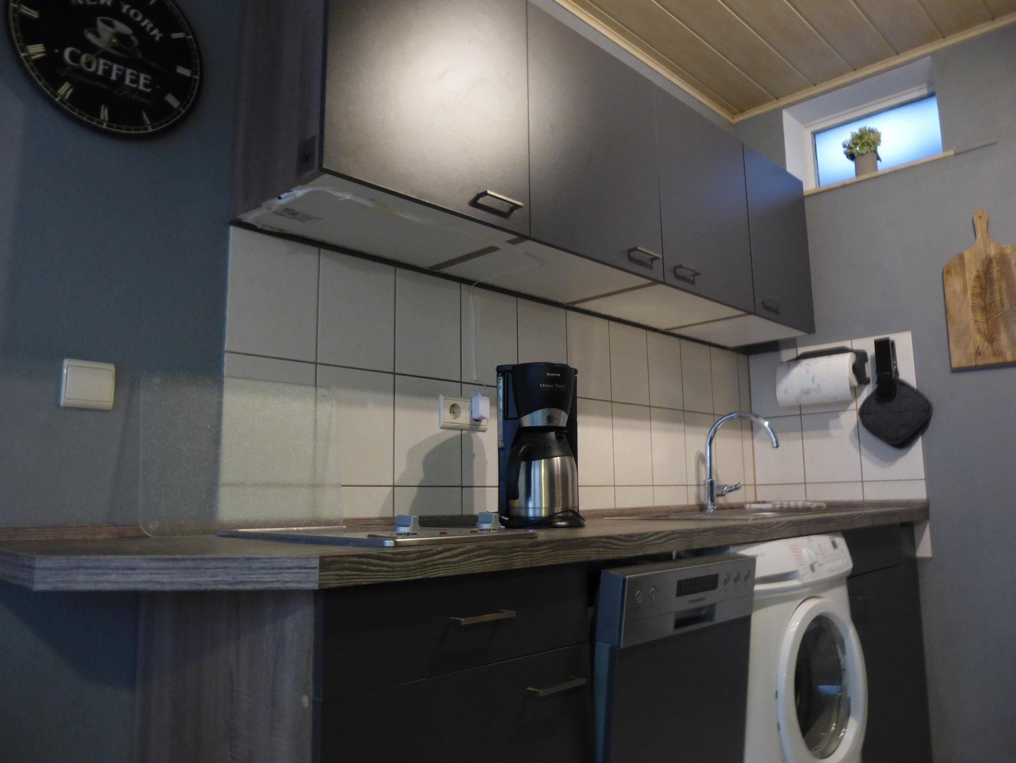 Kochfeld, Waschmaschine, Spülmaschine, Gefrierfach, Kaffeemaschine, Wasserkocher und Minibackofen sind vorhanden.