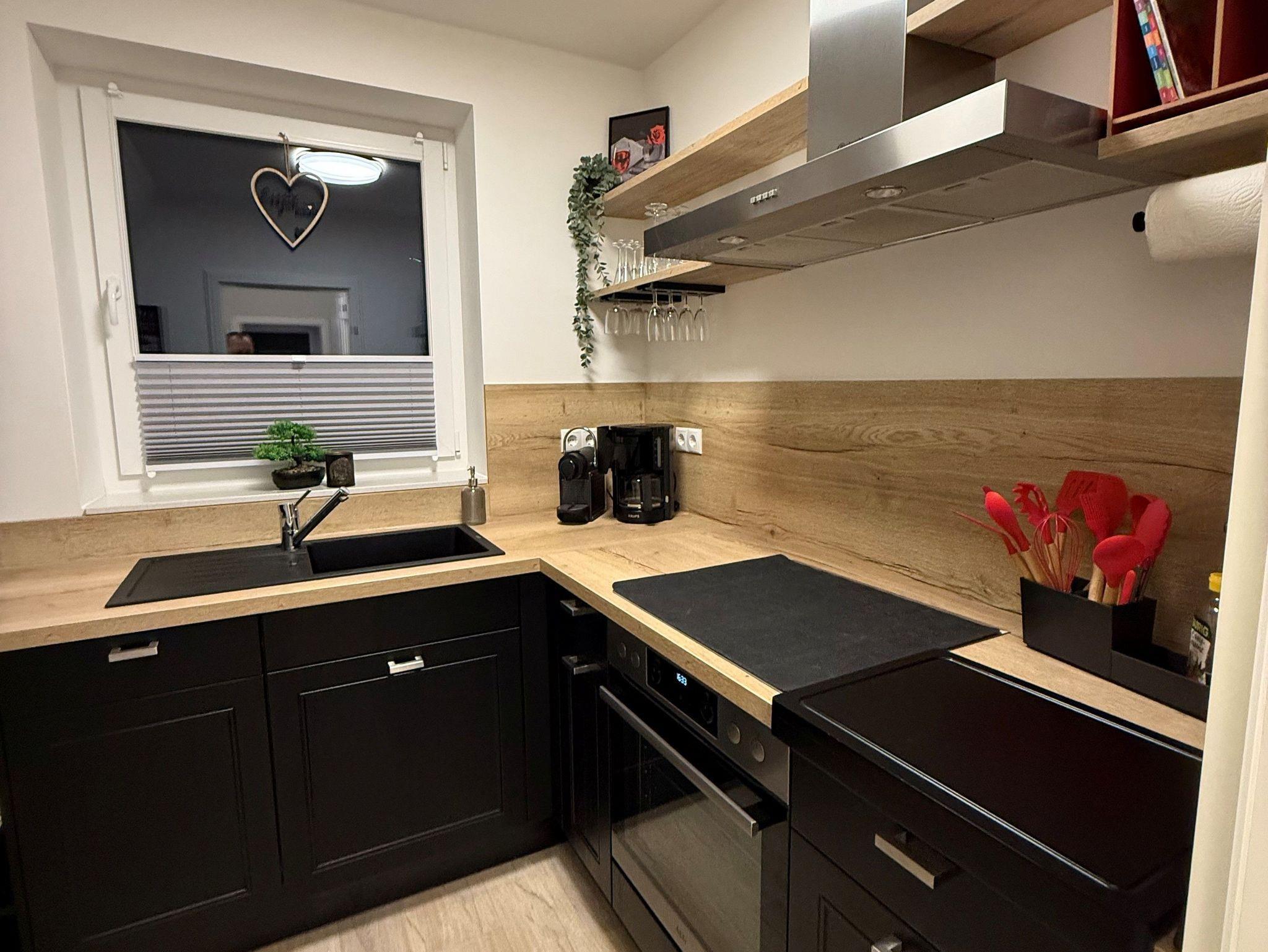 Flur, Schlafzimmer mit Boxspringbett (1,80 m x 2,00 m), eine separate Küche (Geschirrspüler und andere elektrische Küchengeräte vorhanden) Wohnzimmer mit Essbereich, Schlafsofa und TV und ein Duschbad mit ebenerdiger Dusche.