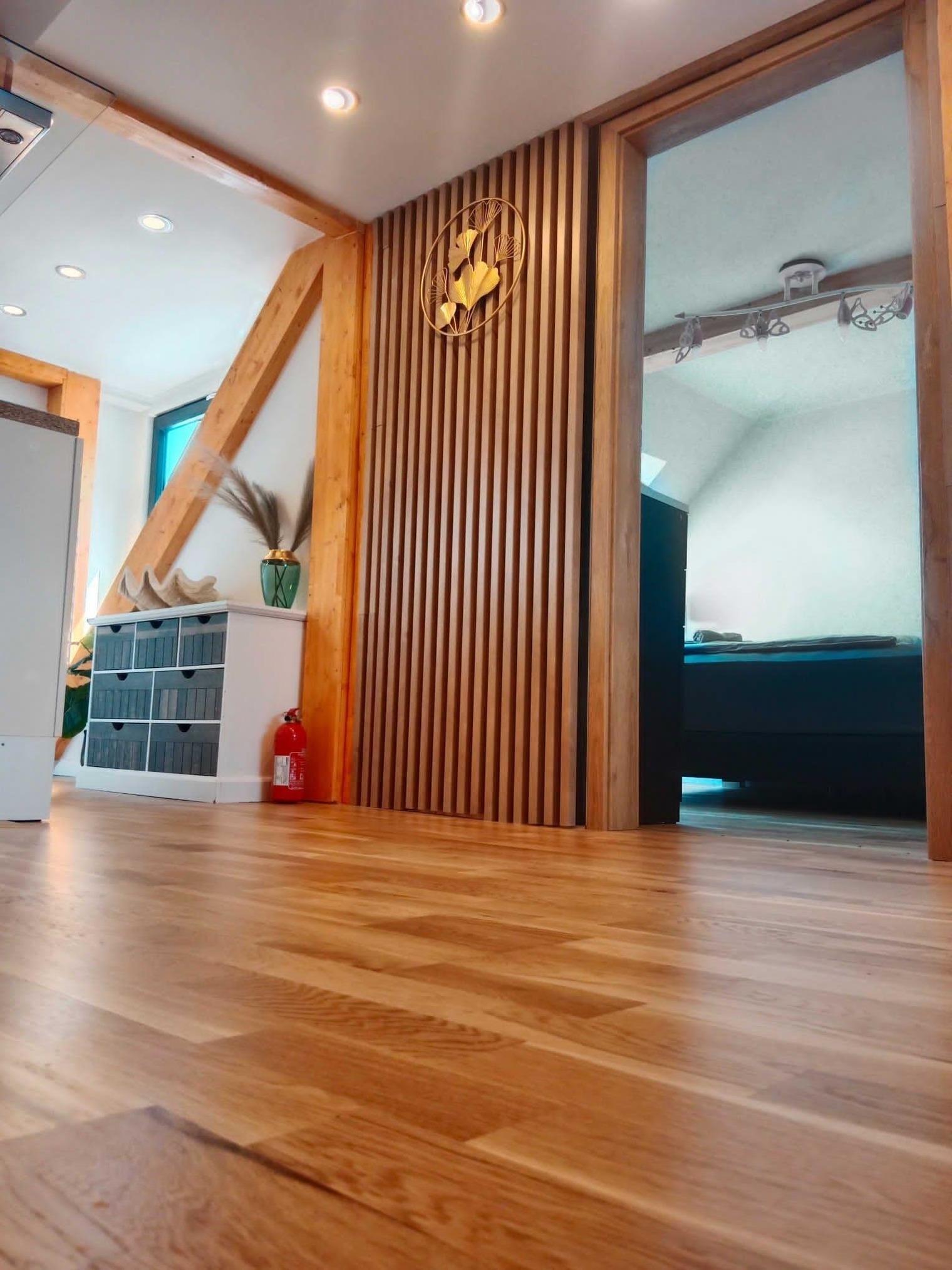 Oberer Wohnungsbereich: großes Bett, Kommode