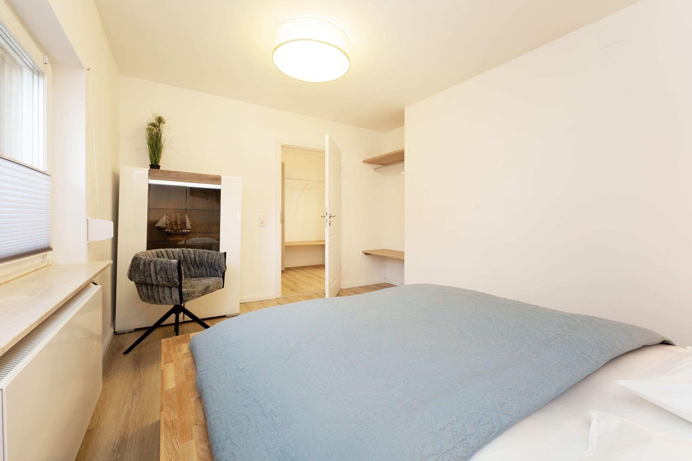 Schlafzimmer 1: 1 Doppelbett (180x200 cm), Kleiderschrank, Verdunkelung: Außenrollo und Plissee, Platz für ein Babybett