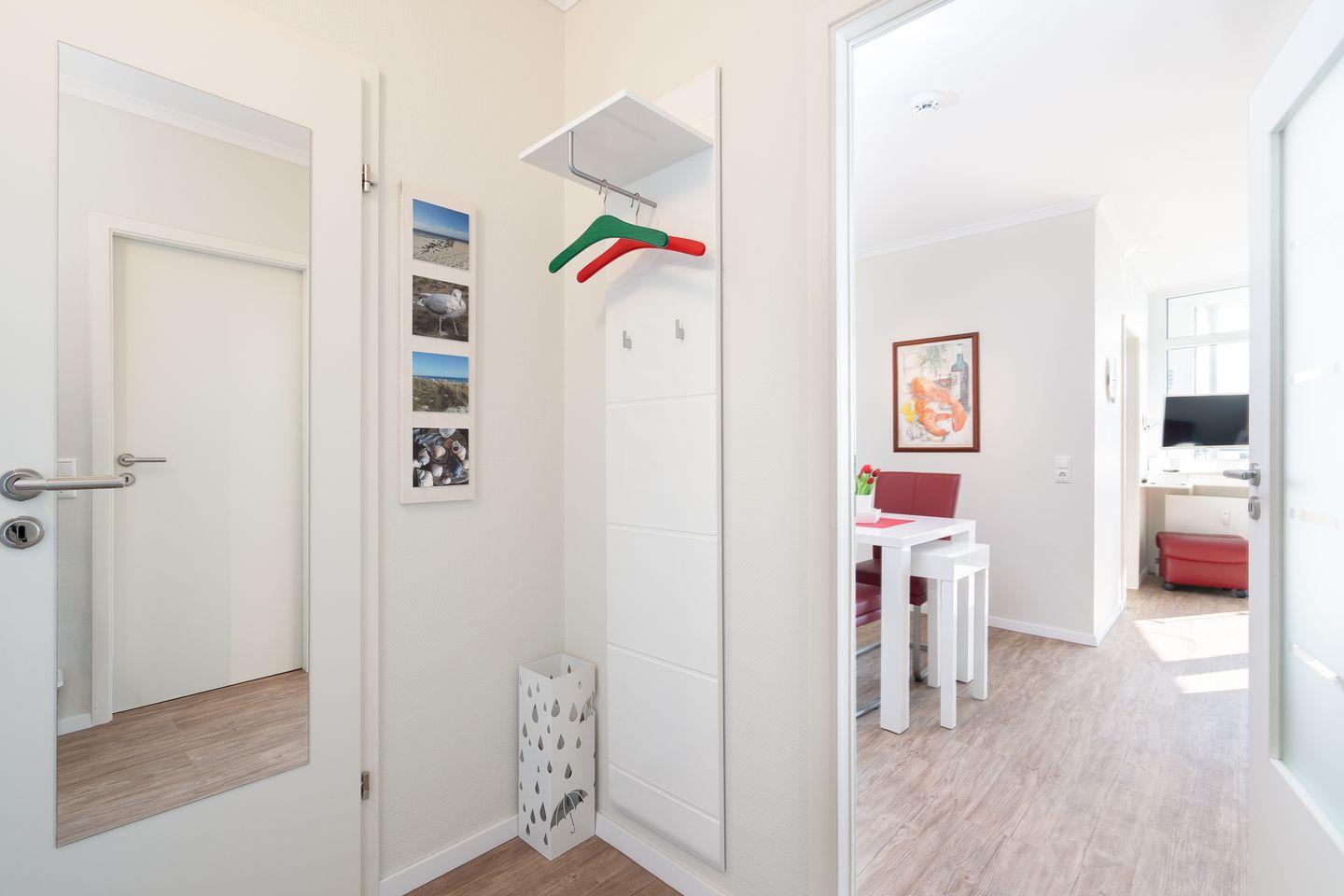 Die offene Küche ist mit allem ausgestattet, was man braucht: Spülmaschine, Ceranfeld, Kühlschrank sowie eine Mikrowelle mit Backfunktion und ein kleiner Gefrierschrank (beide in der praktischen Kammer neben dem Flur). Ein Esstresen mit Meerblick lädt zum Frühstücken ein – und am Abend genießen Sie Ihr Dinner stimmungsvoll am Esstisch mit Kerzenschein.