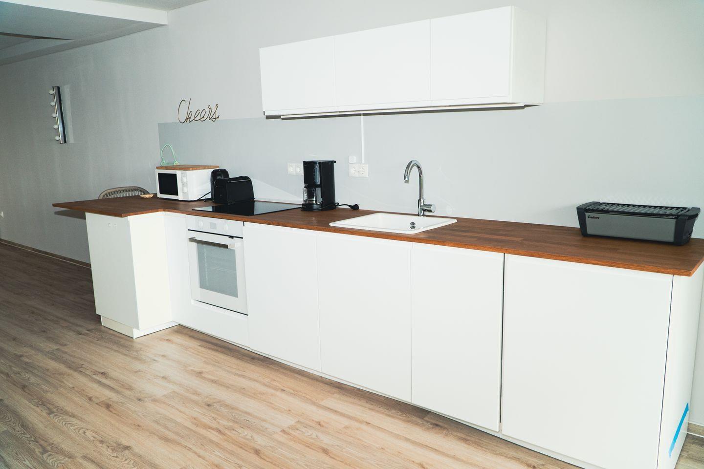 Auch wenn das Duschbad kompakt ist, findest du dort alles, was du brauchst: eine Dusche, ein Waschbecken und eine Toilette, funktional, hell und gut durchdacht. Trotz seiner Größe ergänzt es den Komfort des Apartments perfekt, sodass es dir an nichts fehlt.