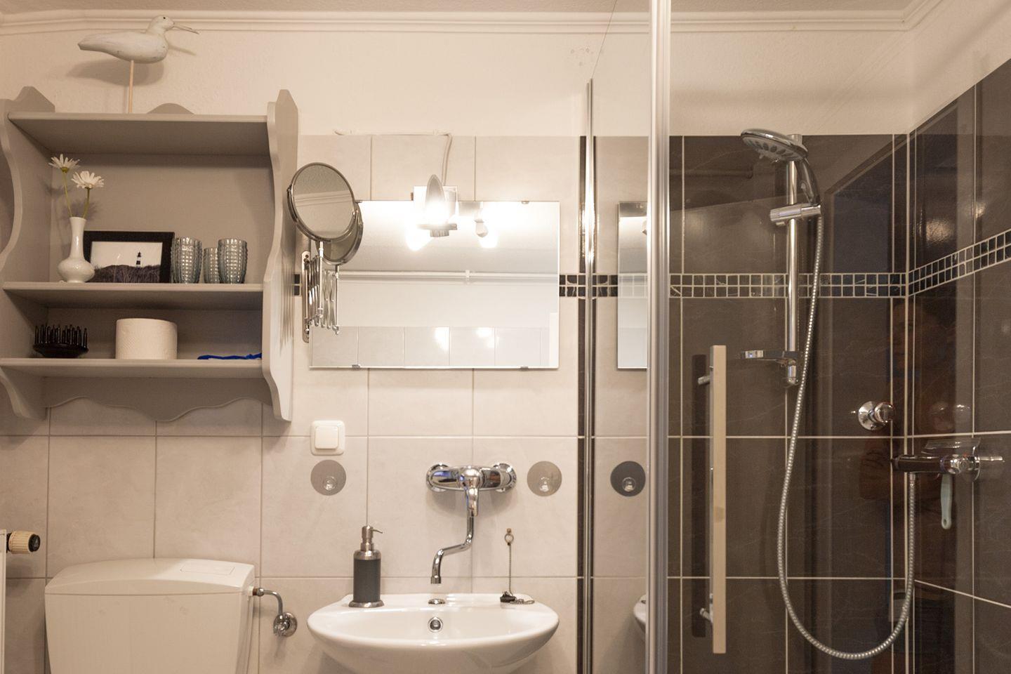 Das Badezimmer verfügt über eine Dusche mit erhöhtem Einstieg, Waschbecken und WC.