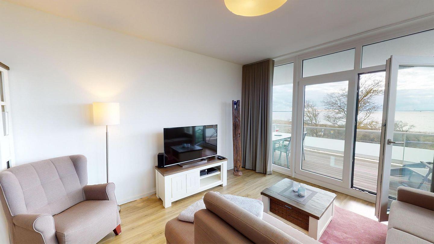 Über das Wohnzimmer gelangen Sie auf den großen Balkon mit einmaligem Meerblick! Hier stehen zwei Sonnenliegen sowie ein Tisch mit vier Stühlen für Sie bereit, das Urlaubsgefühl ist komplett!
