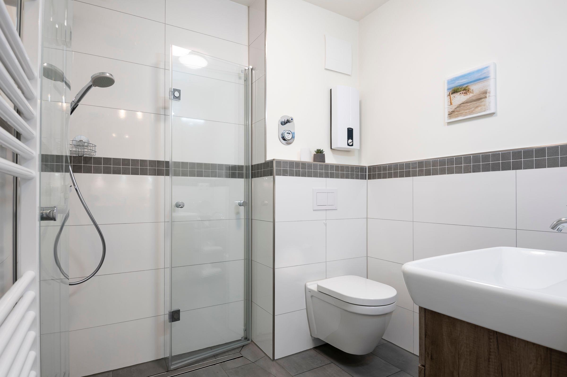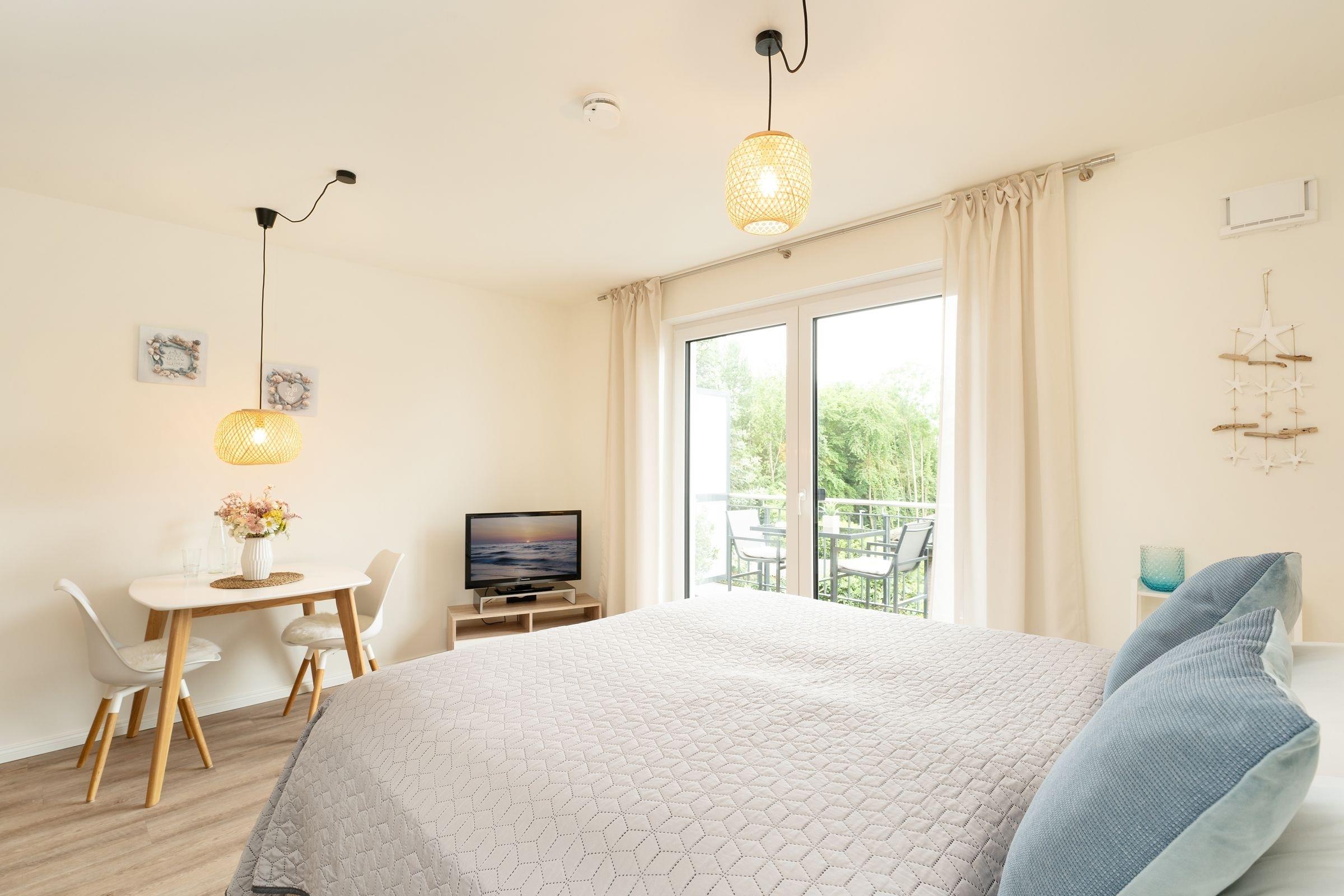 Der kombinierte Wohn- und Schlafbereich empfängt Sie mit einem hochwertigen Boxspringbett von Jette Joop (160x200 cm), einem Flachbildfernseher sowie einem großen Kleiderschrank für Ihre Urlaubsgarderobe. Elektrische Außenrollläden sorgen für erholsame Nächte. Die offene Küchenzeile ist u. a. mit einem Kühlschrank mit Gefrierfach, einem Geschirrspüler und einem Backofen mit integrierter Mikrowelle sehr gut ausgestattet. Das innenliegende Badezimmer sorgt mit einer Regendusche (bodengleich), einem beheizbaren Handtuchhalter und Fußbodenheizung für viel Komfort. Für Unterhaltung sorgen ein Bluetooth Radio und ein kostenfreier WLAN-Anschluss. Vom Wohnbereich gelangen Sie auf den möblierten Balkon mit West-Ausrichtung, der Ihnen erholsame Stunden garantiert. Auch die Ostsee erreichen Sie fußläufig in ca. 15 Minuten über einen idyllischen Wanderweg.