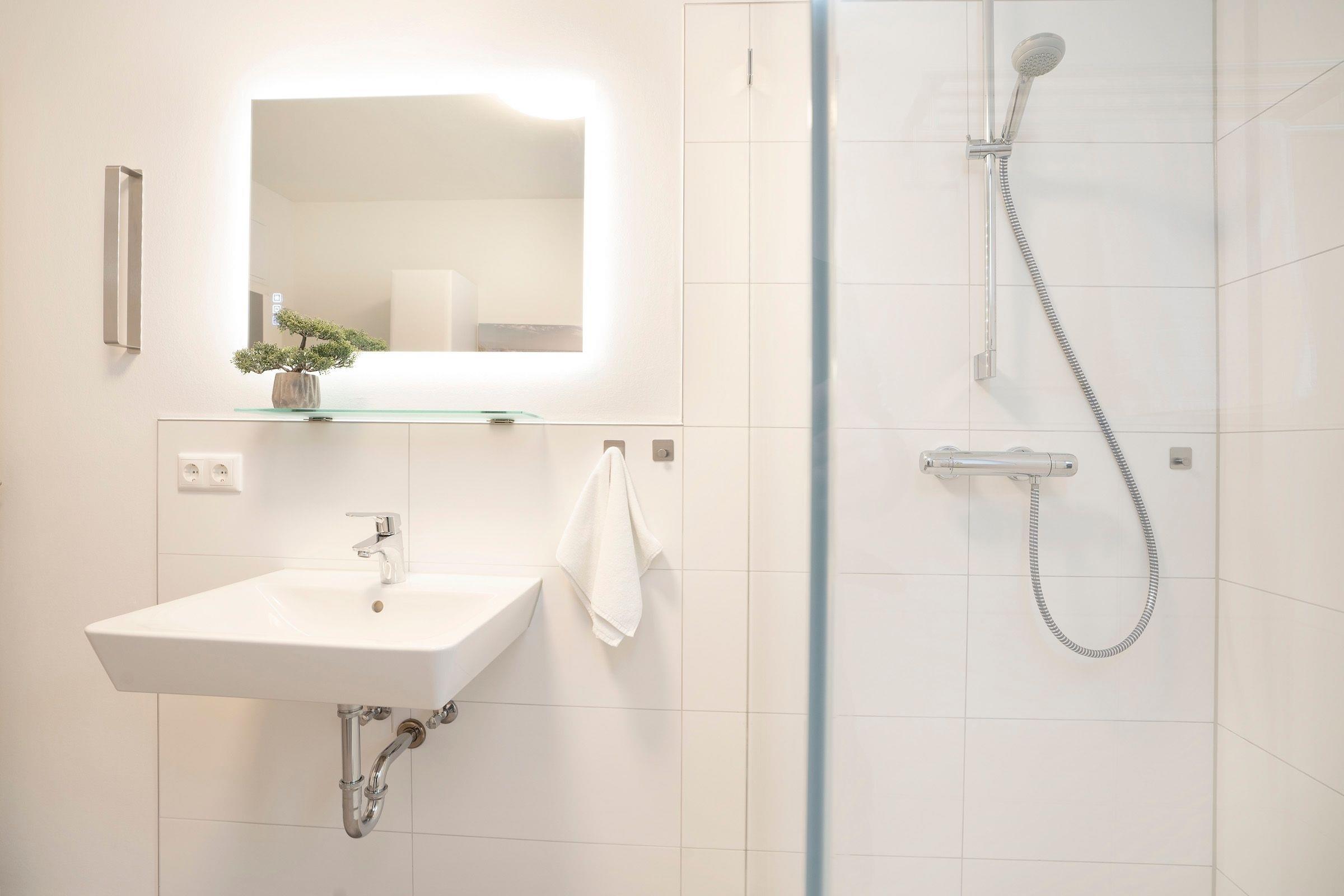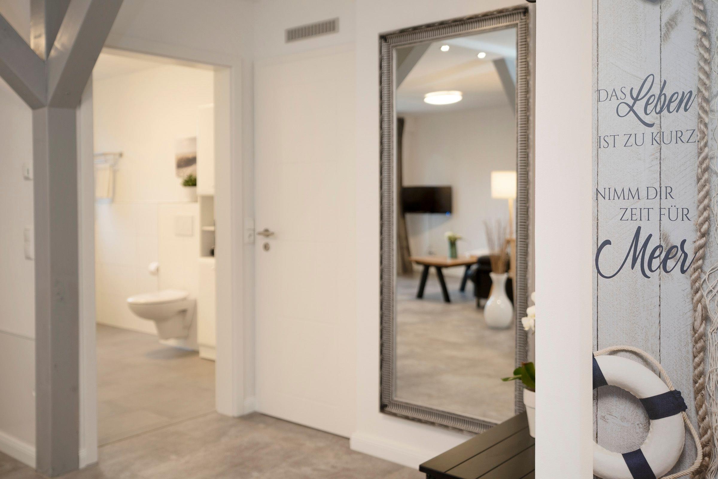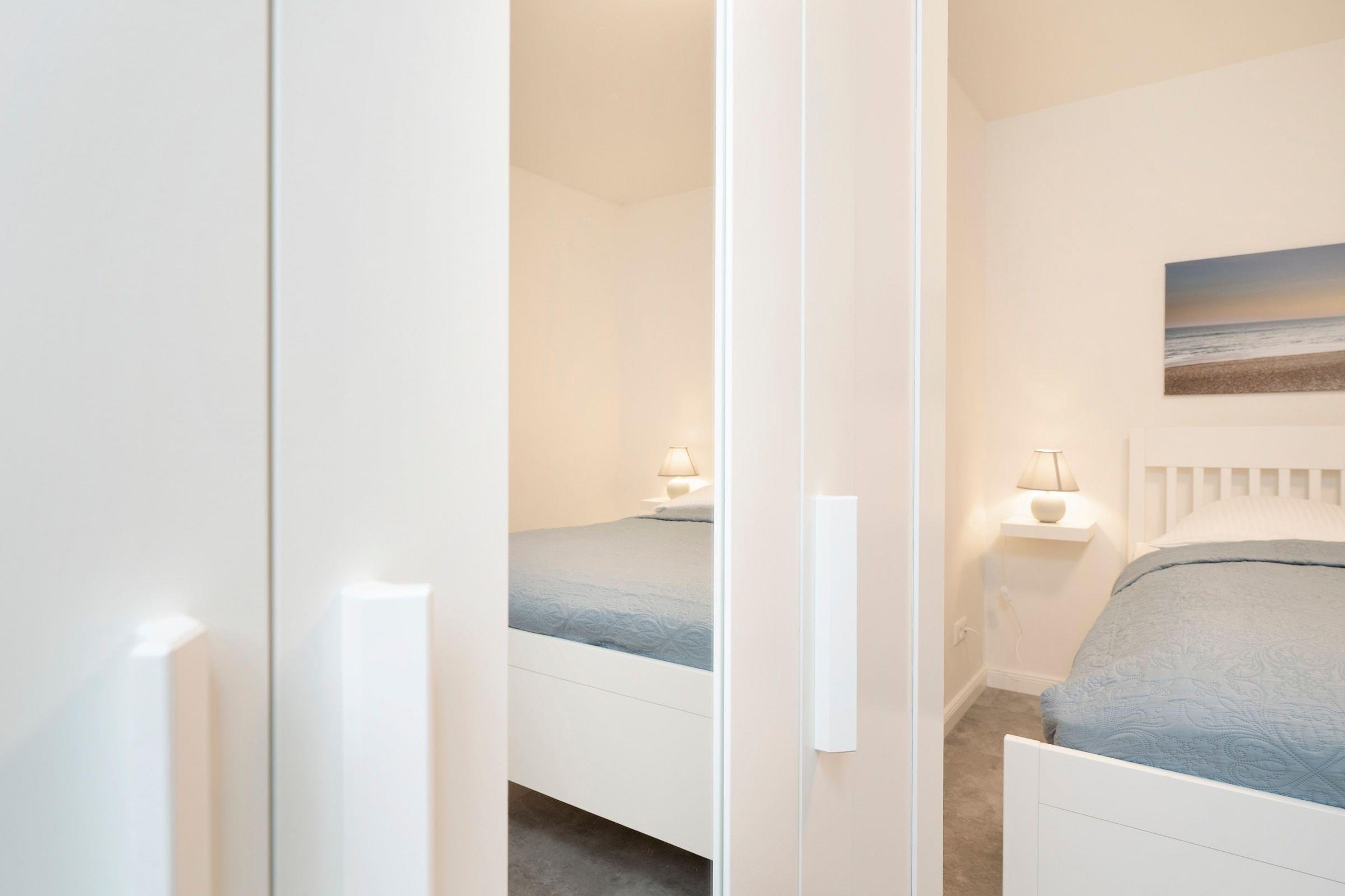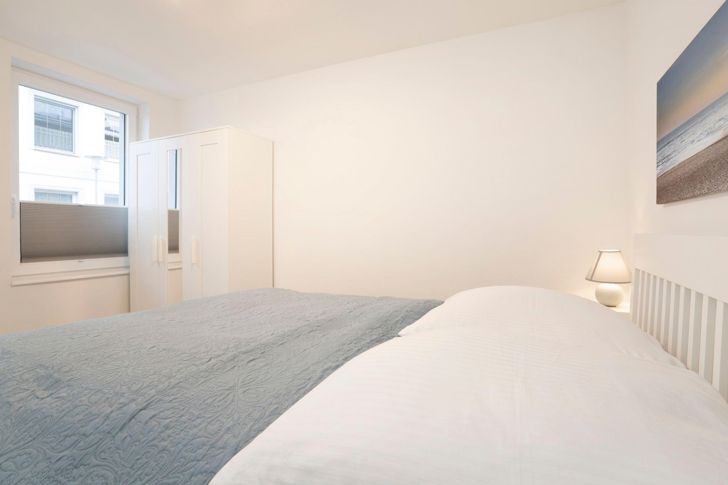Das separate Schlafzimmer mit Doppelbett (2x 80x200 cm) verspricht eine angenehme Nachtruhe, Ihre Urlaubsgarderobe können Sie im Kleiderschrank verstauen. Ein Tageslichtbad mit bodentiefer Dusche komplettiert die Ausstattung dieser Ferienwohnung. Die Fußbodenheizung in der gesamten Wohnung sorgt für wohlige Wärme in der kalten Jahreszeit.