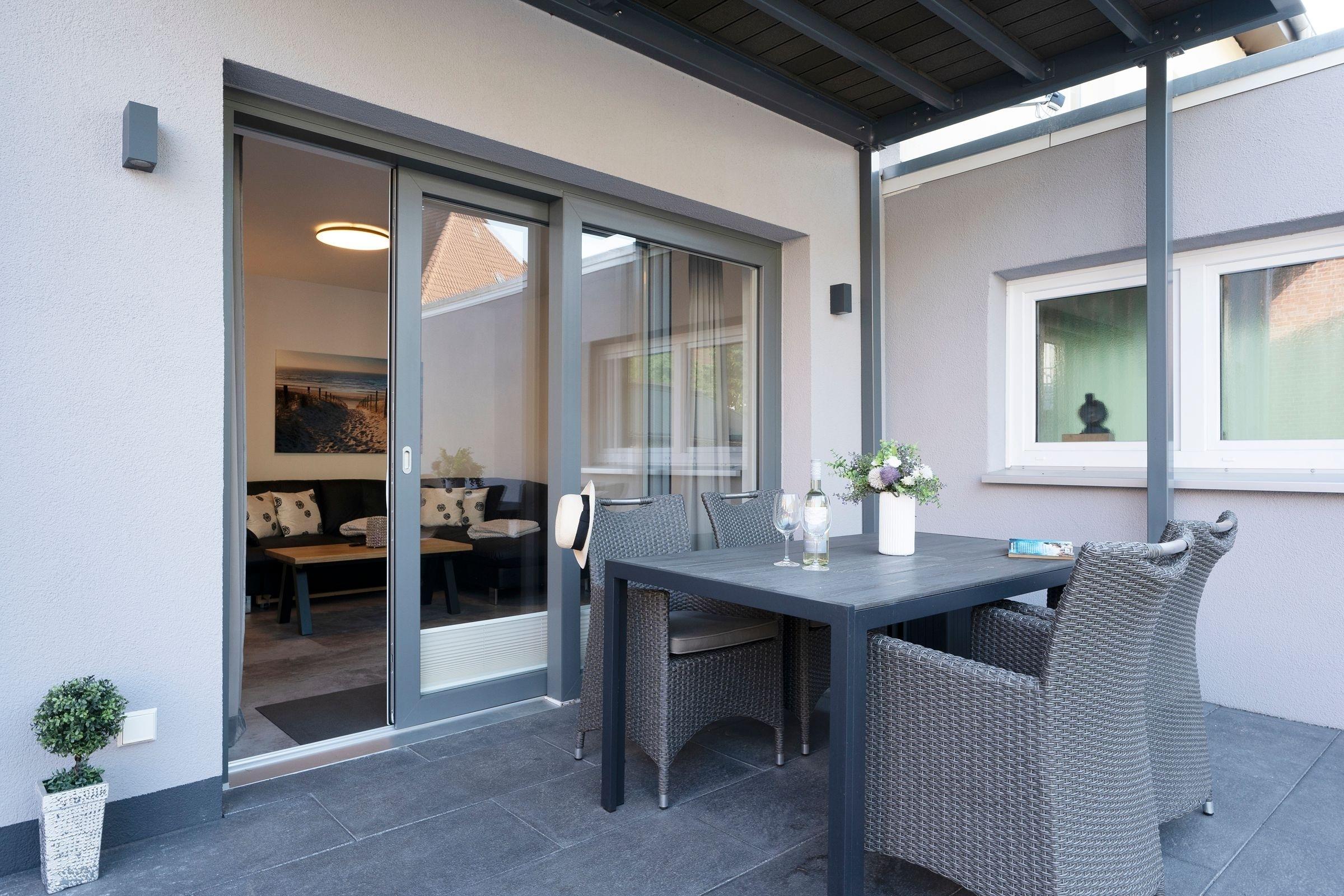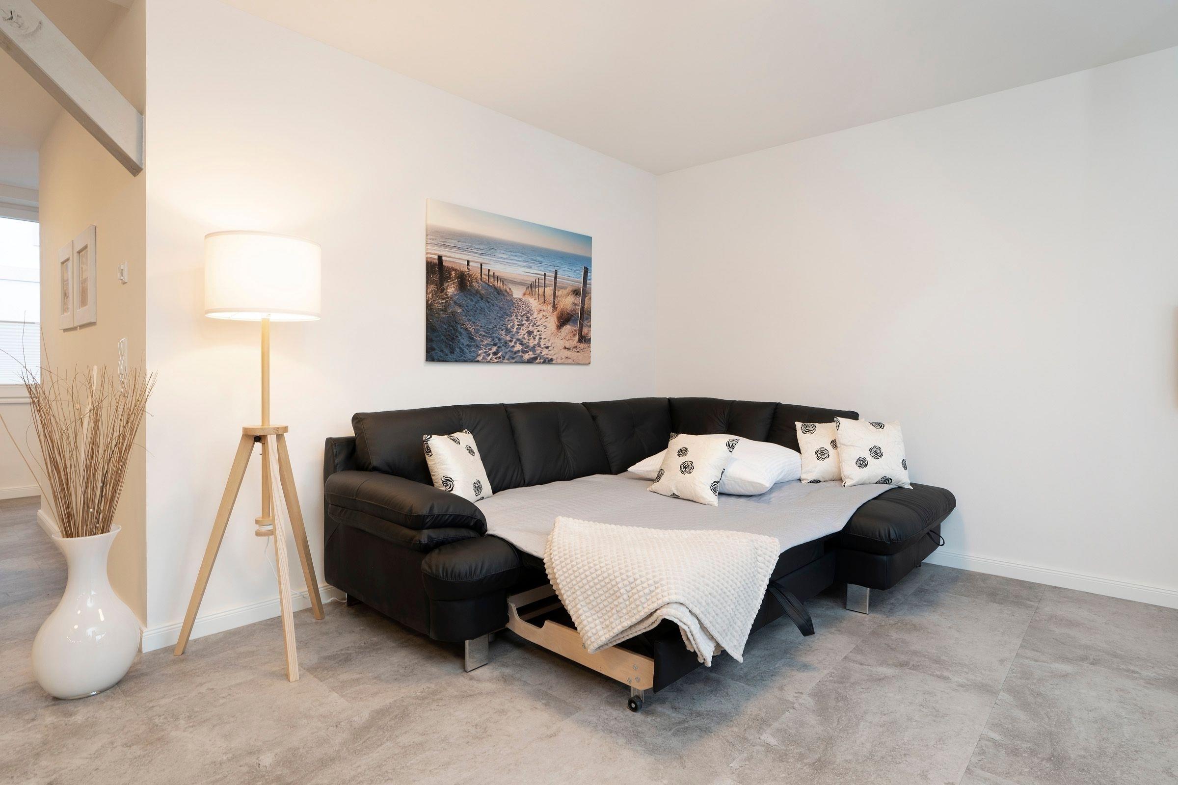 Durch den geräumigen Flur gelangen Sie in den lichtdurchfluteten und geschmackvoll eingerichteten Wohnbereich und machen Sie es sich hier auf der Couch vor dem Flachbild-Fernseher gemütlich. Bei Bedarf kann diese in einen weiteren Schlafplatz (90x200 cm) verwandelt werden. Die 17 m² große, möblierte Süd-Terrasse lädt zum Sonnenbaden und Relaxen an der frischen Luft ein. In der offen gestalteten Küche, die mit allen Annehmlichkeiten ausgestattet ist, können Sie Ihre Mahlzeiten gemeinsam zubereiten.
